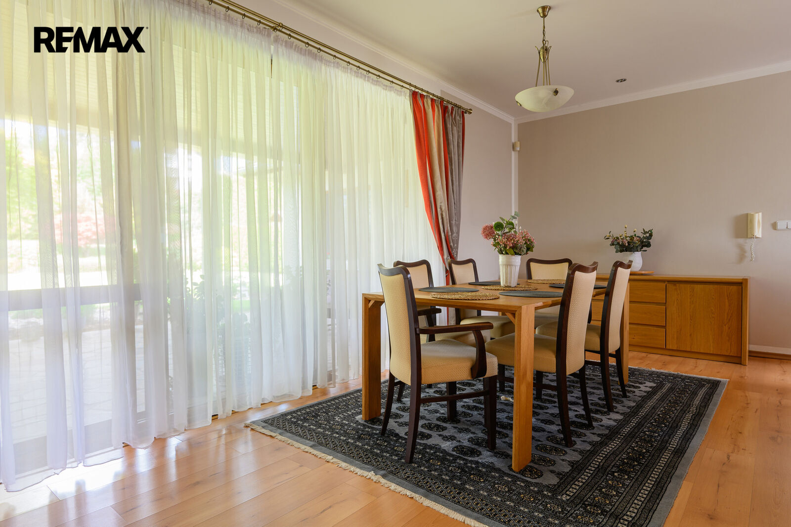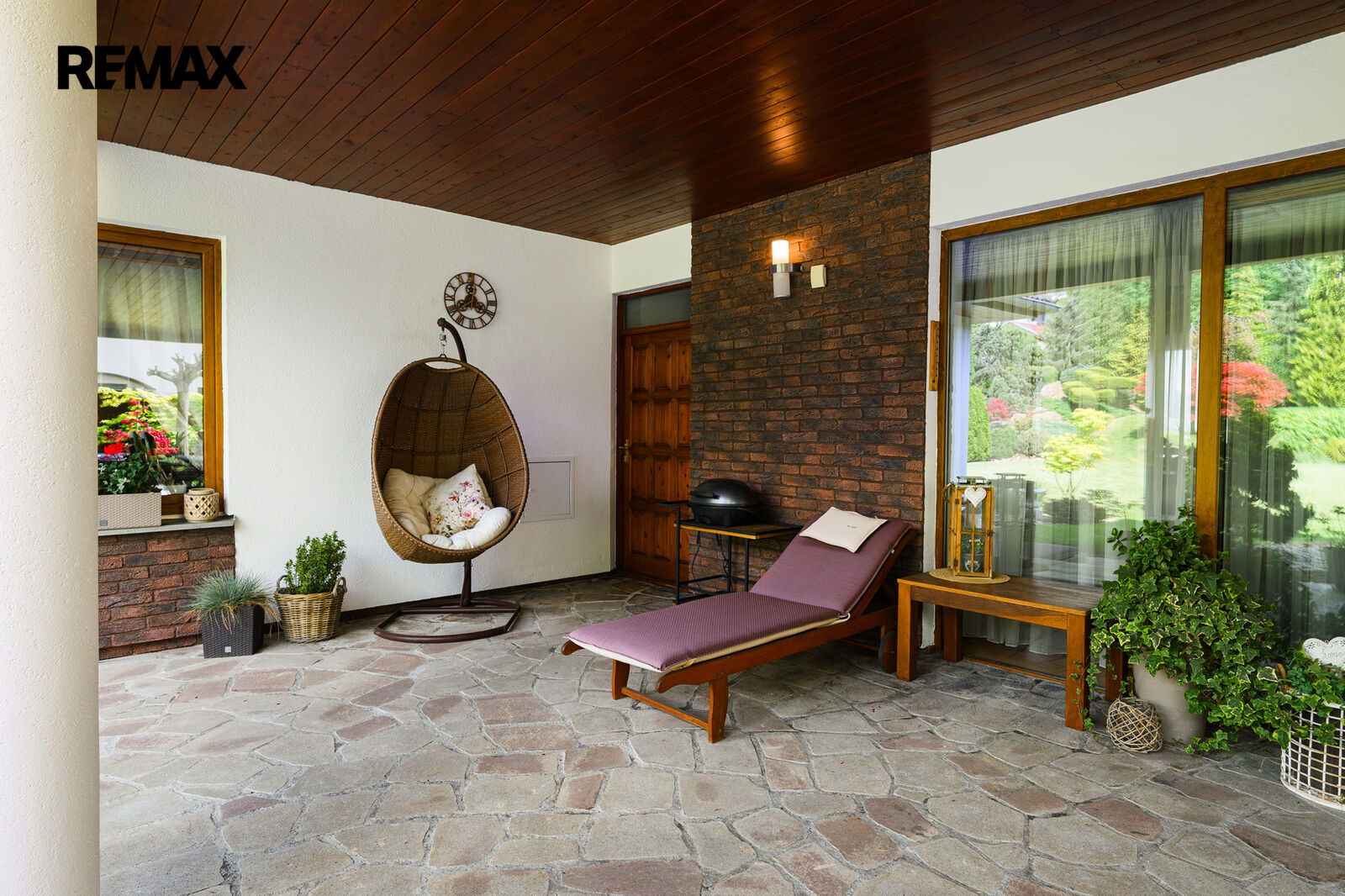 Z obývacího pokoje je vstup na zastřešenou terasu (40 m²) a do okrasné zahrady.
