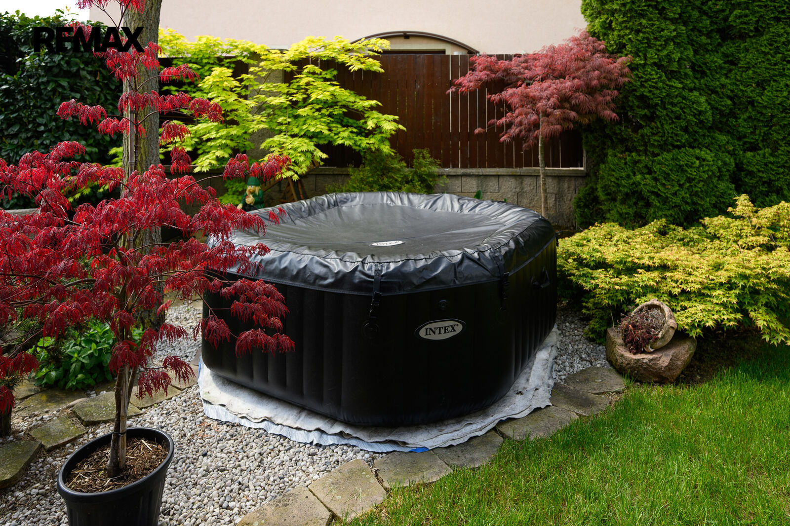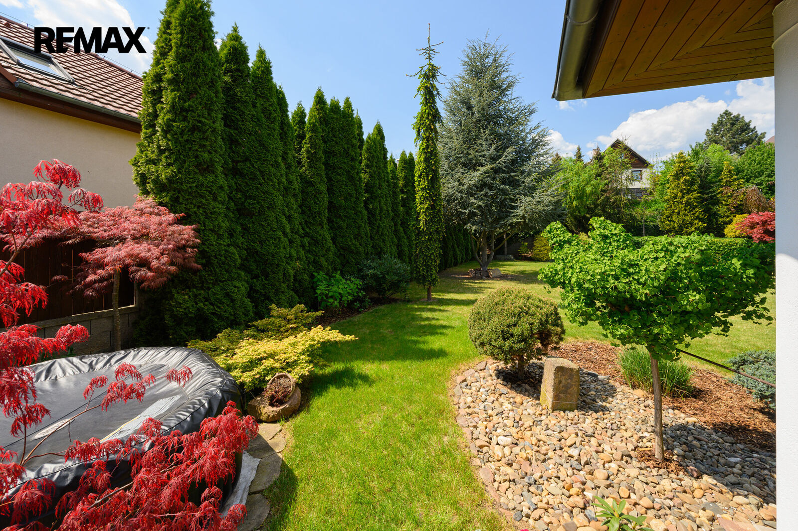 Zahrada je navržena v japonském stylu jako klidová zóna s okrasnými dřevinami, trávníkem se závlahovým systémem a velkou zastřešenou terasou vhodnou pro odpočinek či rodinná setkání. Součástí pozemku je také samostatná technická místnost pro zahradní vybavení.