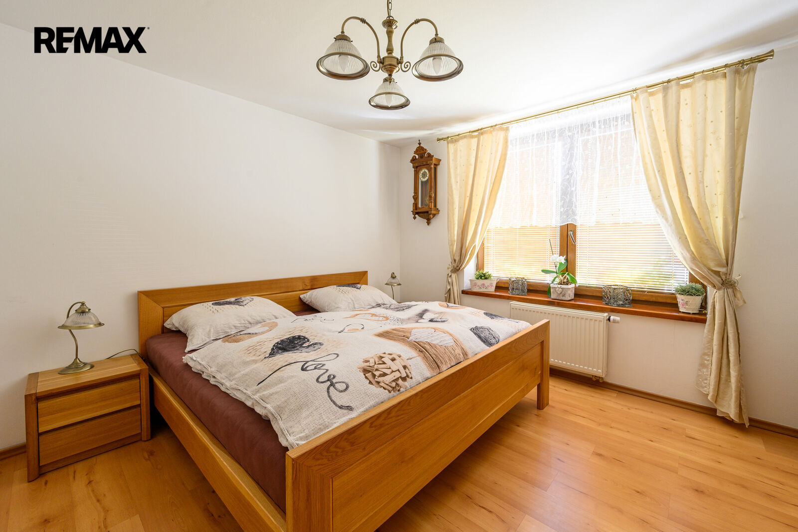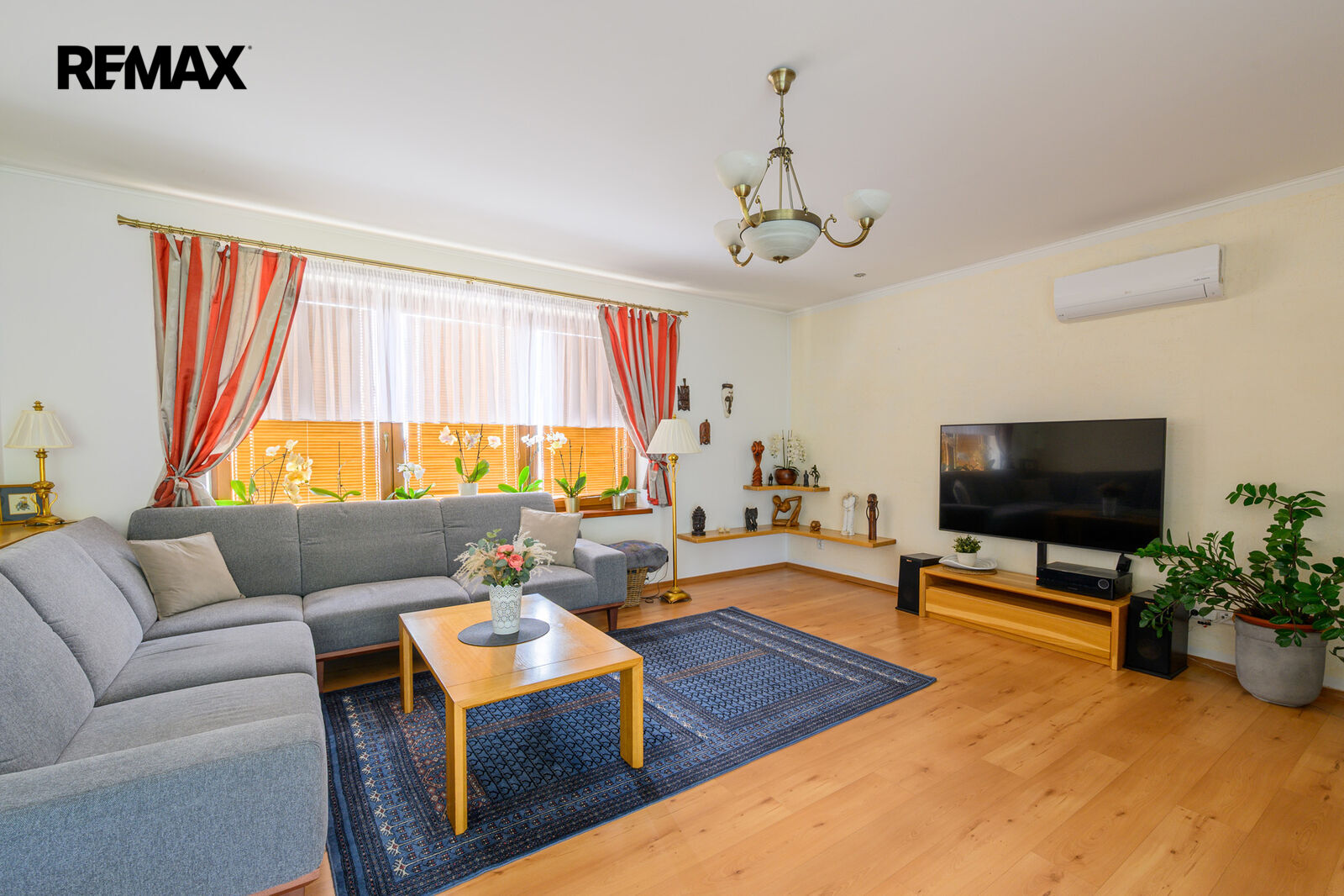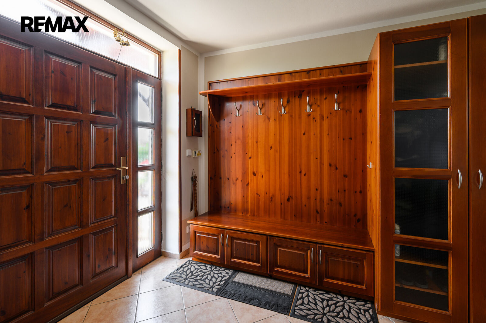 prostorný obývací pokoj propojený s kuchyní a jídelnou, tři ložnice, koupelna s WC, samostatné WC, šatna a chodba s vestavěnými skříněmi.