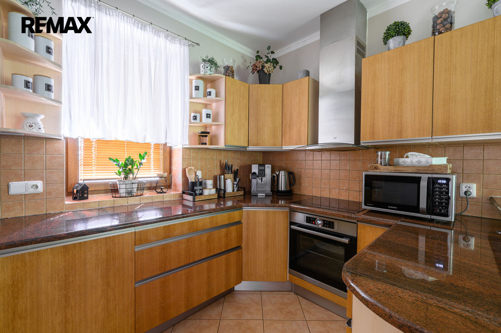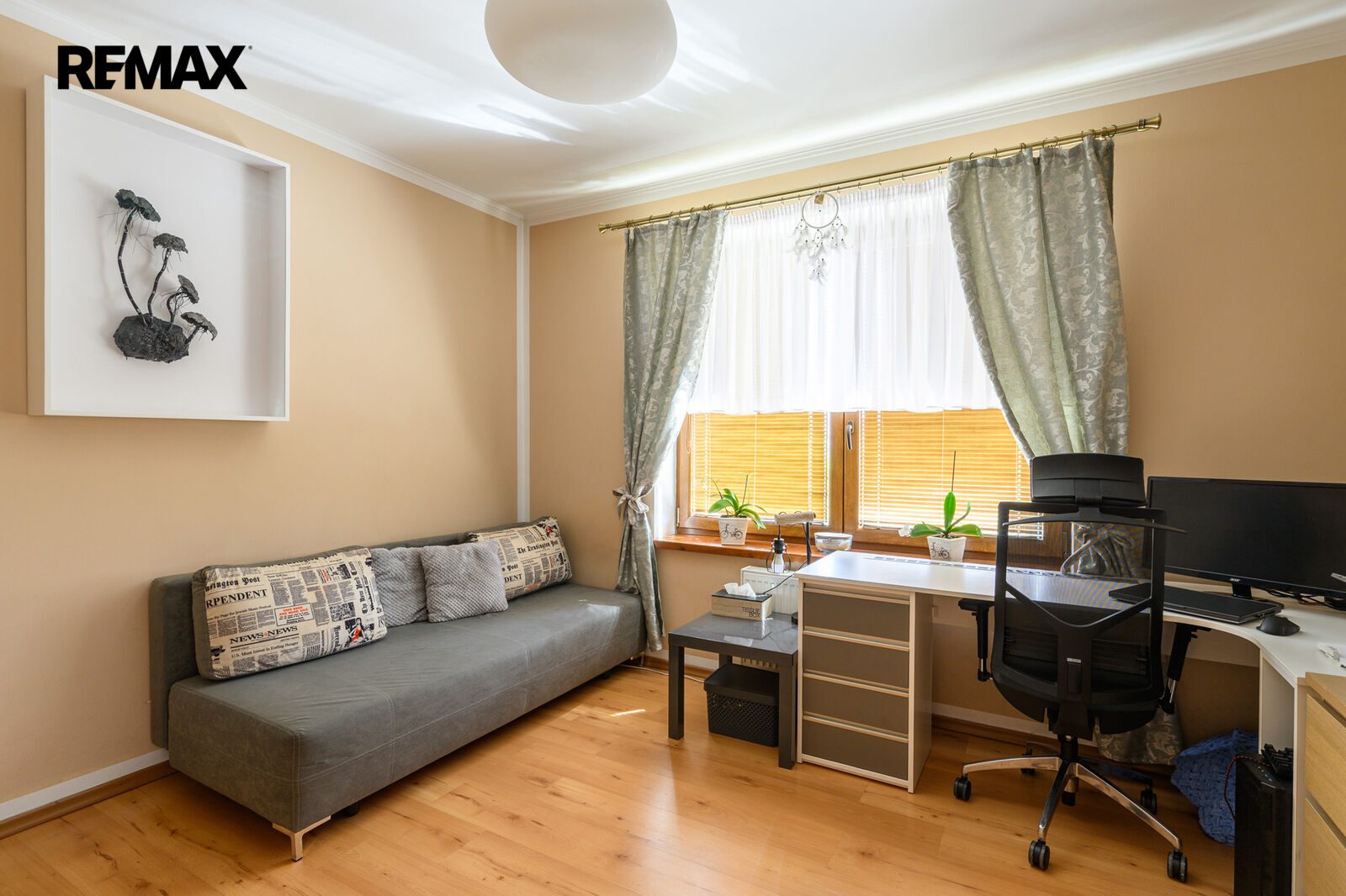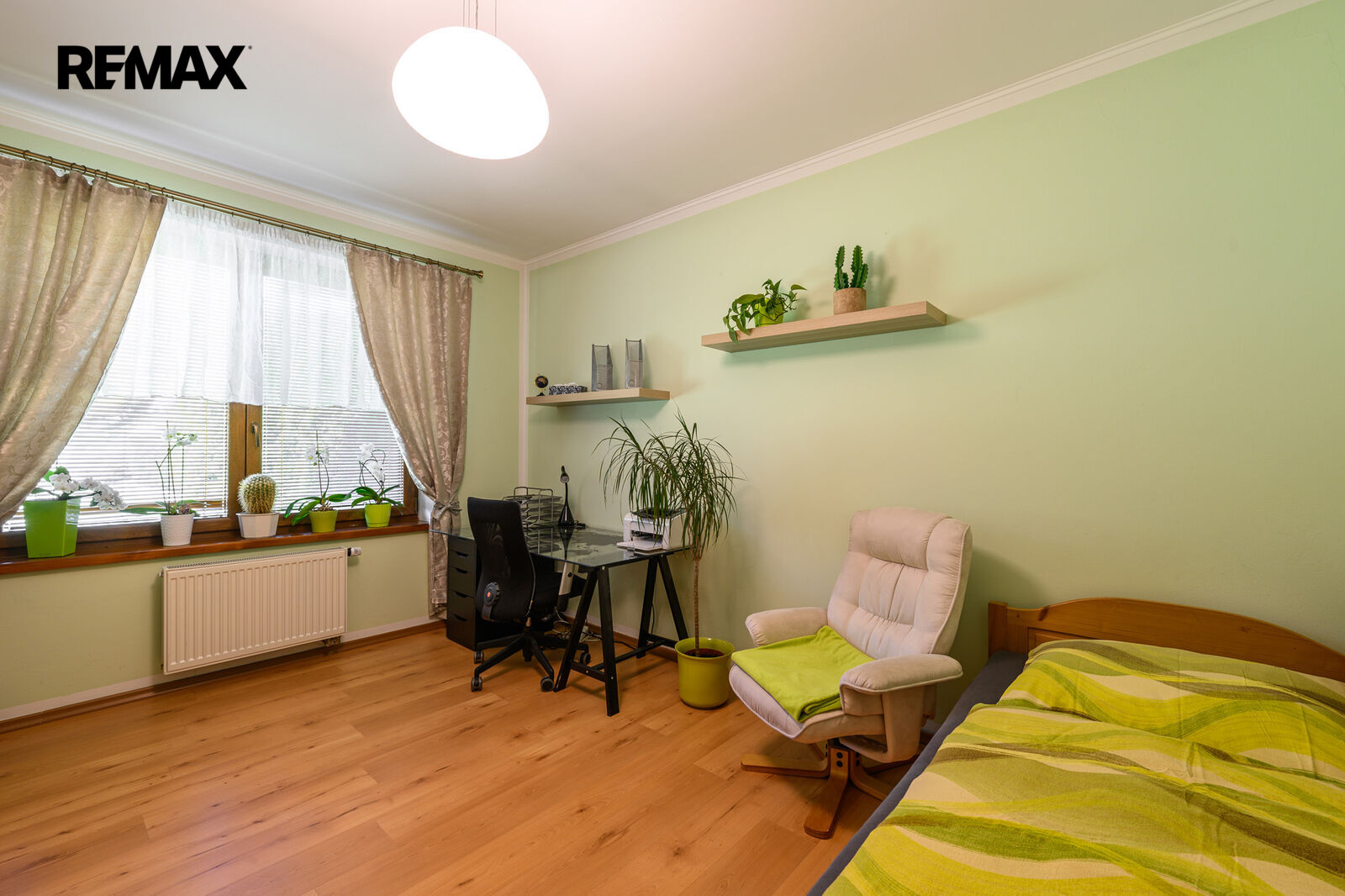 prostorný obývací pokoj propojený s kuchyní a jídelnou, tři ložnice, koupelna s WC, samostatné WC, šatna a chodba s vestavěnými skříněmi.