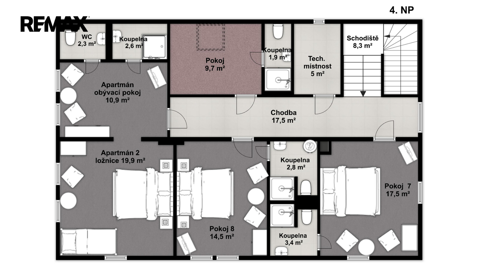 - Celkem 11 ubytovacích jednotek (vč. 2 apartmánů)