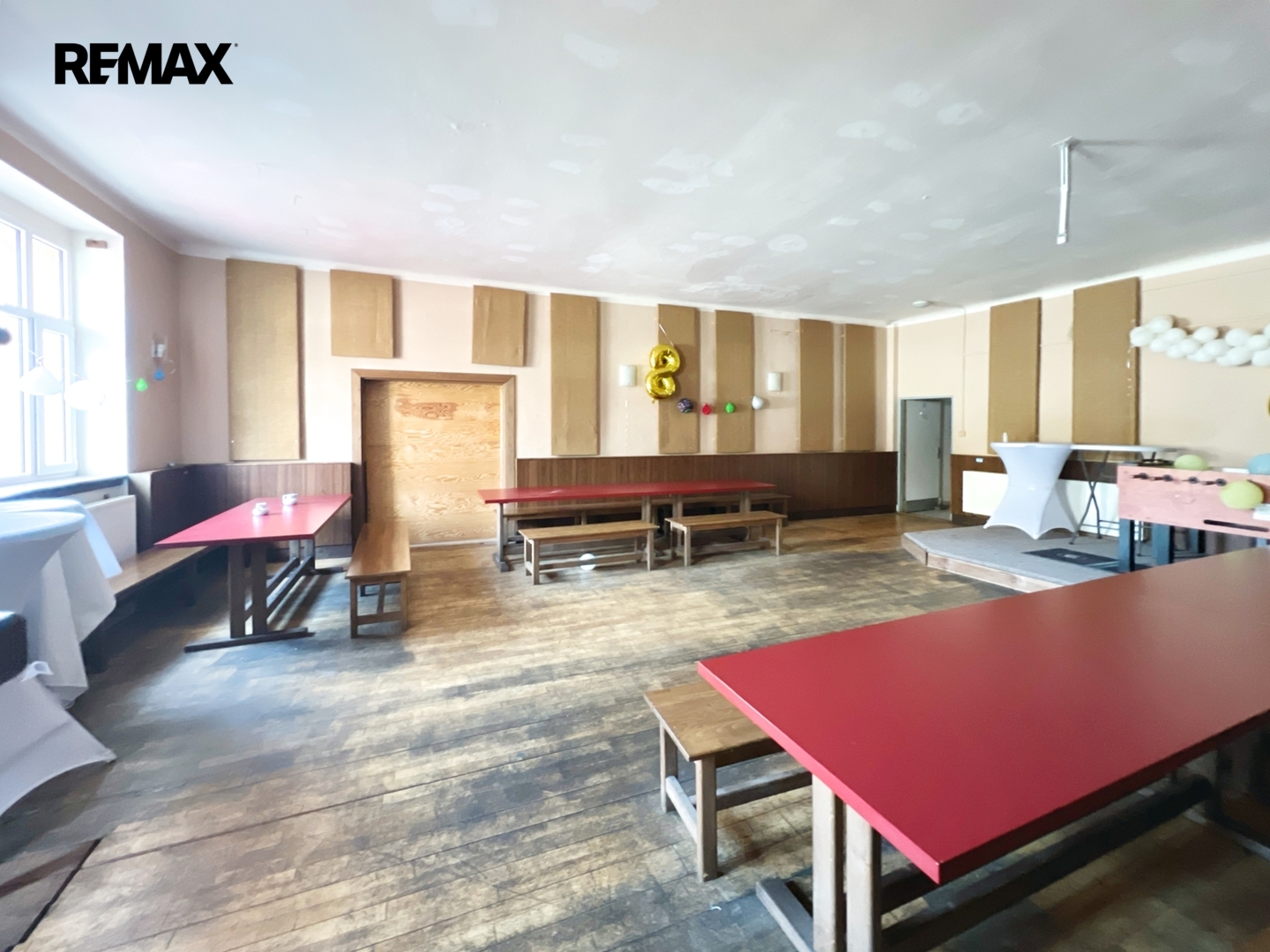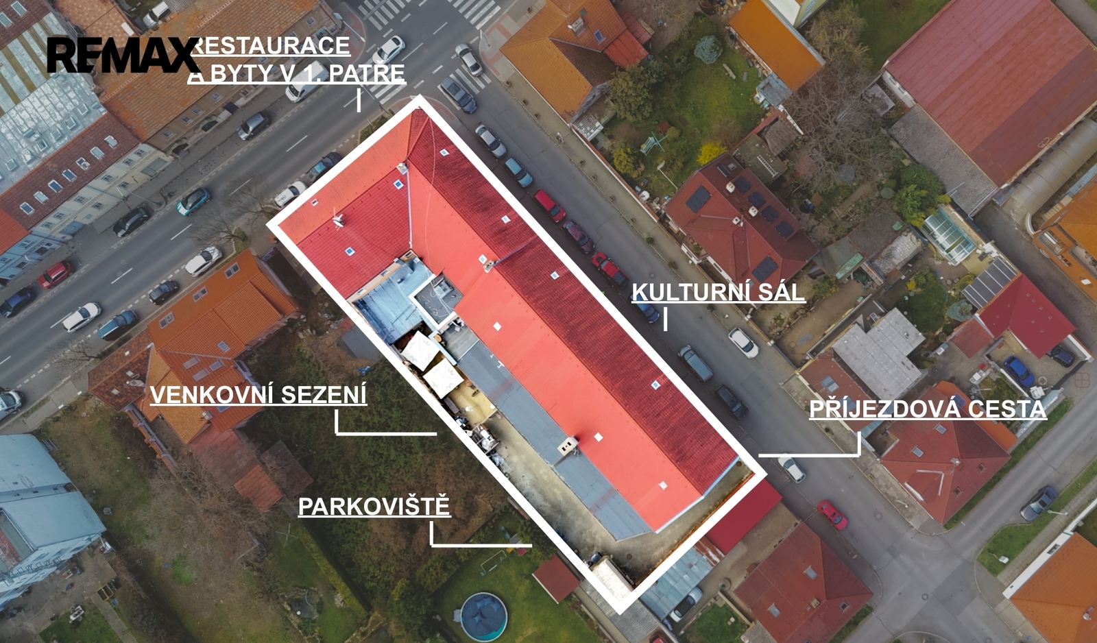 Současná budova o zastavěné ploše 1 021 m², podlahové ploše 2 349,2 m² a pozemku 1 325 m² je plně funkční a generuje zajímavou výnosnost, což umožňuje plynulé financování budoucí transformace. Objekt zahrnuje restauraci s kompletním zázemím, prostory bývalé sokolovny a kulturního sálu, sedm ubytovacích jednotek, sklepní prostory a rozsáhlou půdu připravenou pro vestavbu. Konstrukčně jde o stabilní stavbu občanské vybavenosti, částečně zateplenou, s rekonstruovanou sedlovou střechou a napojením na veškeré inženýrské sítě.