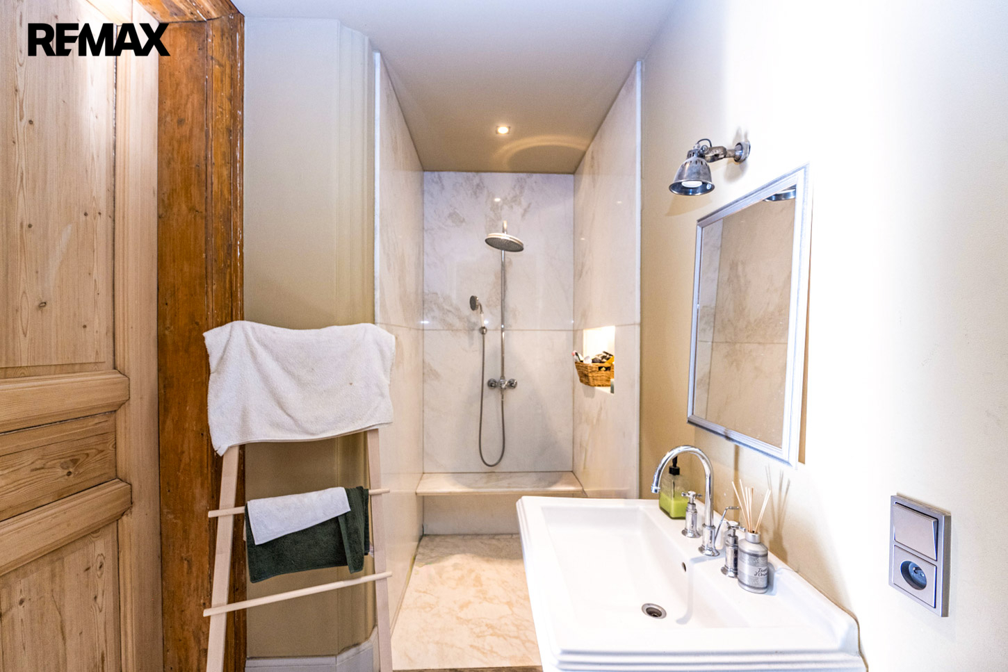 Koupelna – mramorový sprchový kout, dřevěné detaily a WC