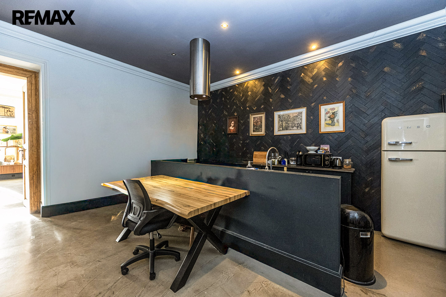 Pandomo podlahy, krb na dřevo, štukové stropy, špaletová okna, původní masivní dveře. Ložnice s kruhovým arkýřem a výhledem přímo na historické fasády Malé Strany. Mramorová kuchyň s černou rybinovou stěnou, kuchyňským ostrůvkem a SMEG lednicí. Obývací pokoj s balkónem, kam ráno proudí světlo od Pražského hradu.