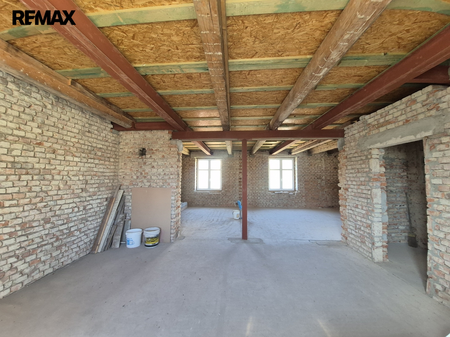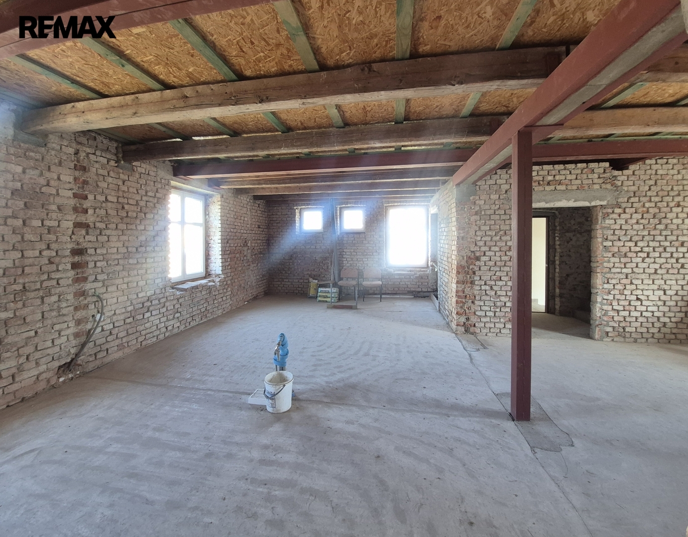 Prostory ve 2. NP a 3. NP (půdní prostory) jsou ve stavu téměř hrubé stavby (bez vnitřních prostorových úprav), ale již s připravenými rozvody na odpad, vodu a topení (vč. podlahového). V těchto prostorách byl plánovaný byt 4+1 s příslušenstvím o velikosti 119,60 m2, který se měl sestávat z následujících prostor: ve 2. NP ze vstupní chodby, kuchyně, šatny, koupelny, obývacího pokoje, pokoje, ve 3. NP z chodby, WC, koupelny, šatny a 2 pokojů. K těmto prostorám je vymezený sklad v suterénu domu o výměře 12,20 m2.