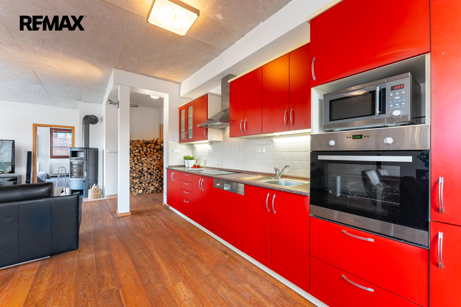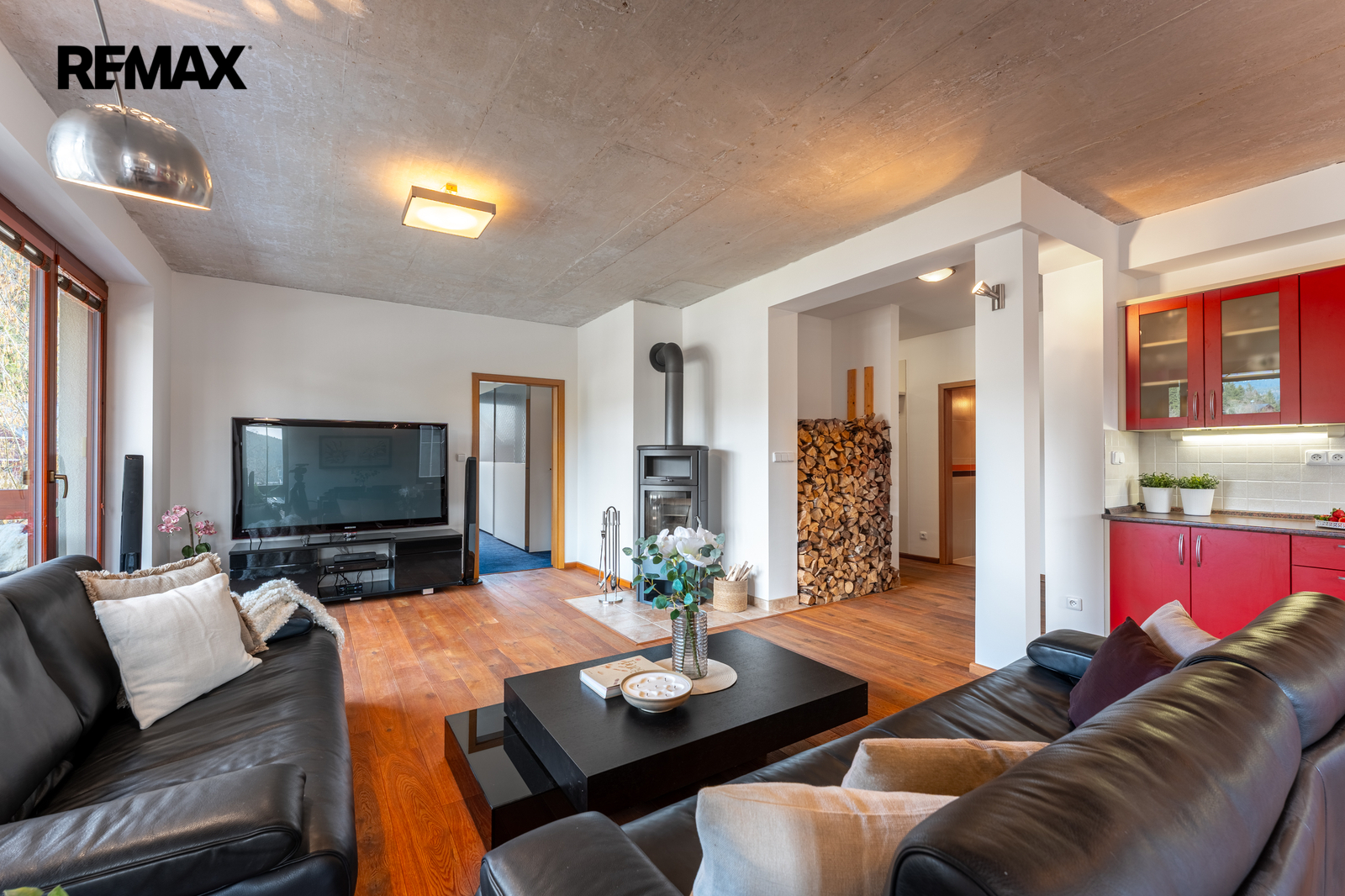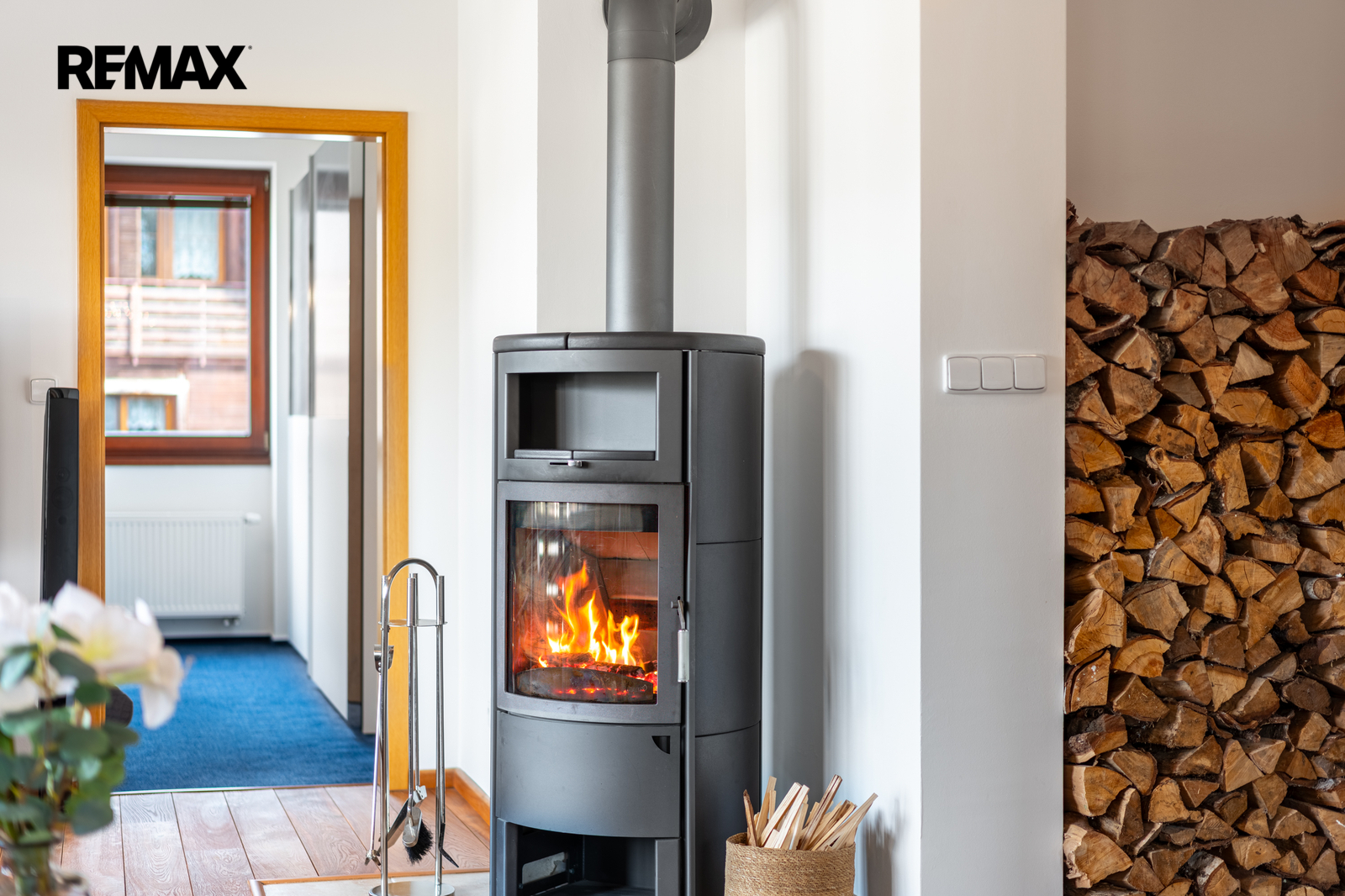 Dispozice dále nabízí dvě prostorné ložnice, koupelnu s vanou i sprchovým koutem, dvě samostatné toalety a vstupní chodbu s úložnými prostory. V obývací části jsou krbová kamna.