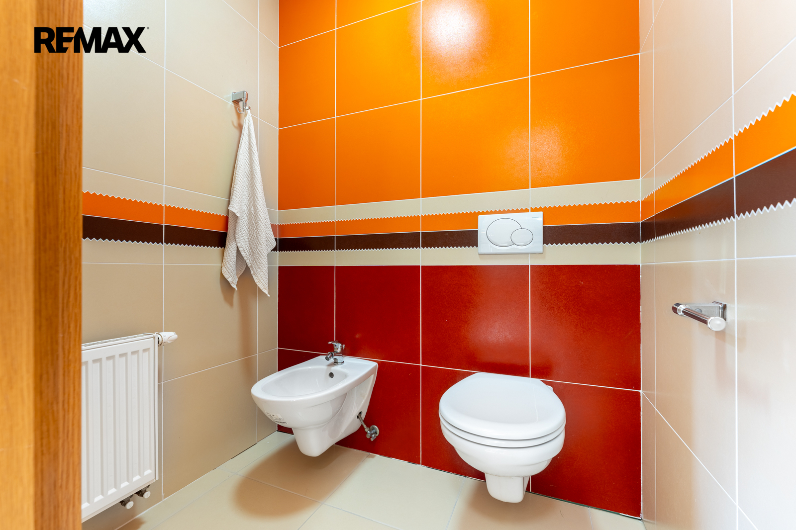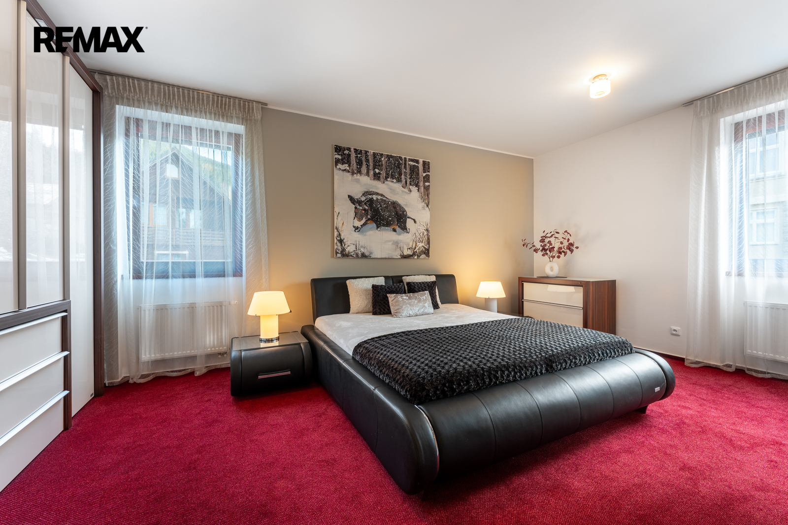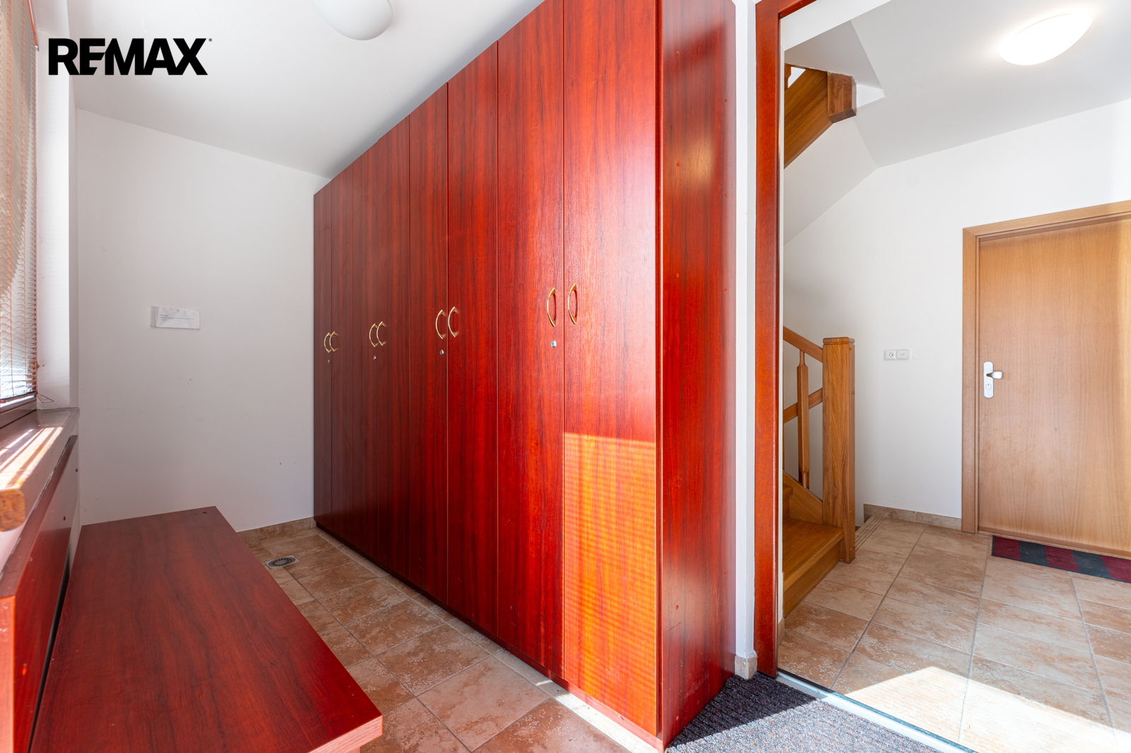 Dispozice dále nabízí dvě prostorné ložnice, koupelnu s vanou i sprchovým koutem, dvě samostatné toalety a vstupní chodbu s úložnými prostory. V obývací části jsou krbová kamna.