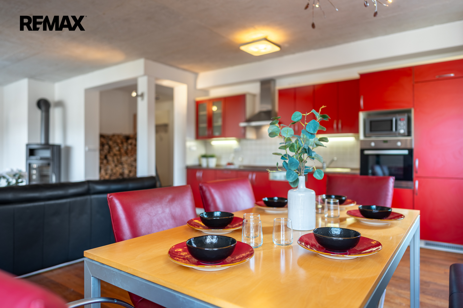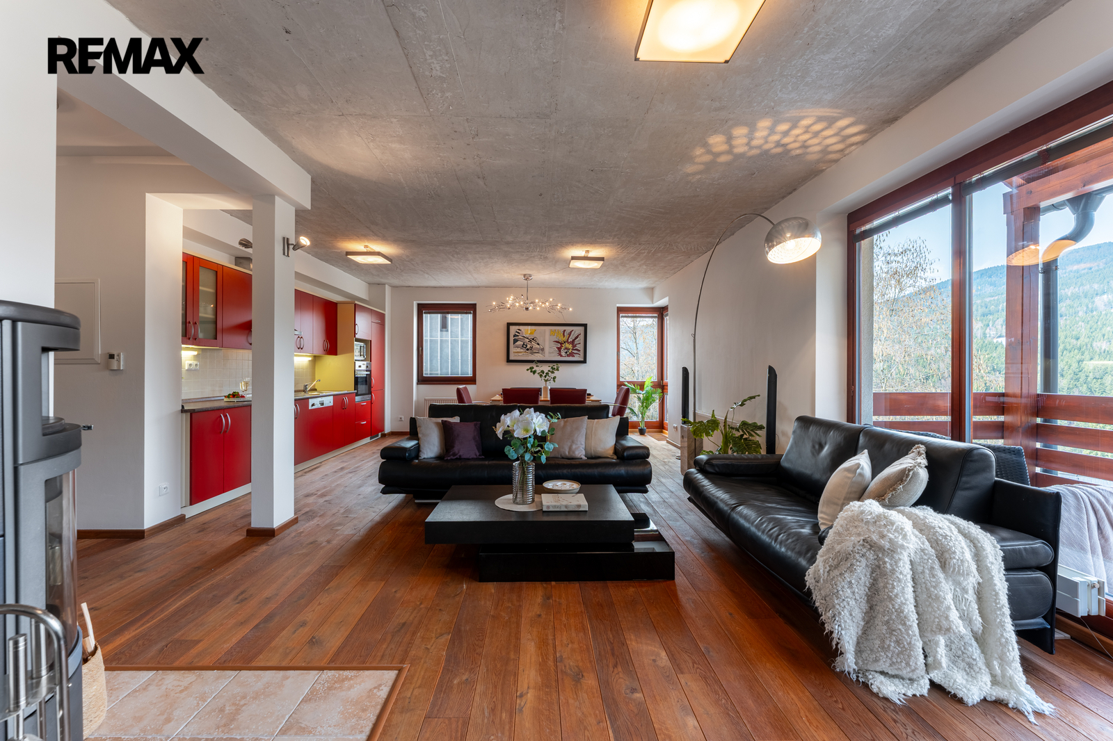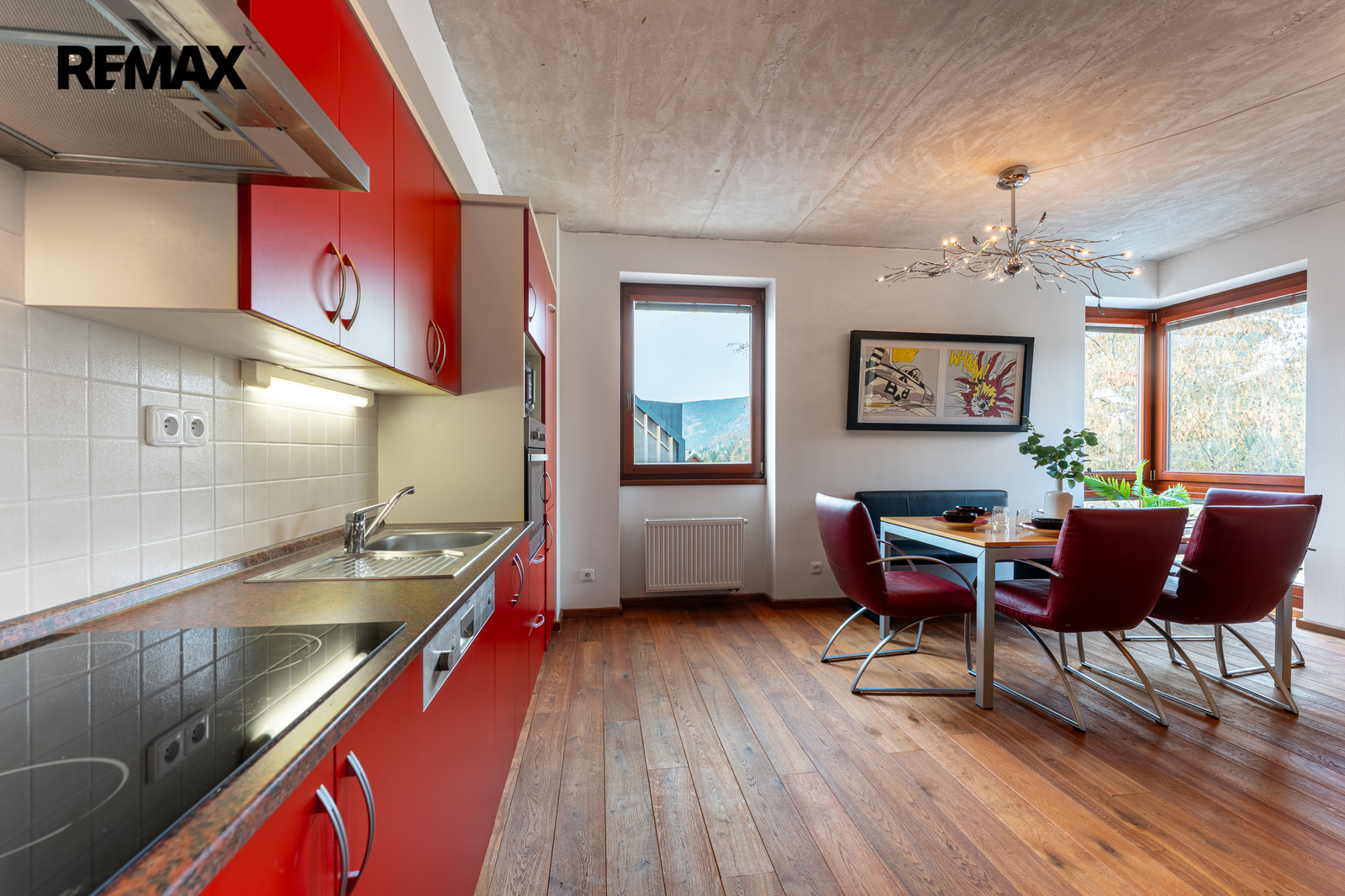 Dominantou apartmánu je velkorysý obytný prostor s kuchyní a jídelnou o ploše 49 m², který tvoří přirozené srdce celého bytu. Prostor plynule navazuje na panoramatickou terasu (4 m²) a díky velkoformátovým oknům nabízí dechberoucí výhledy na protější svahy, okolní krajinu i samotný Špindlerův Mlýn. Každý den zde začíná i končí s výhledem, který si nelze okoukat.