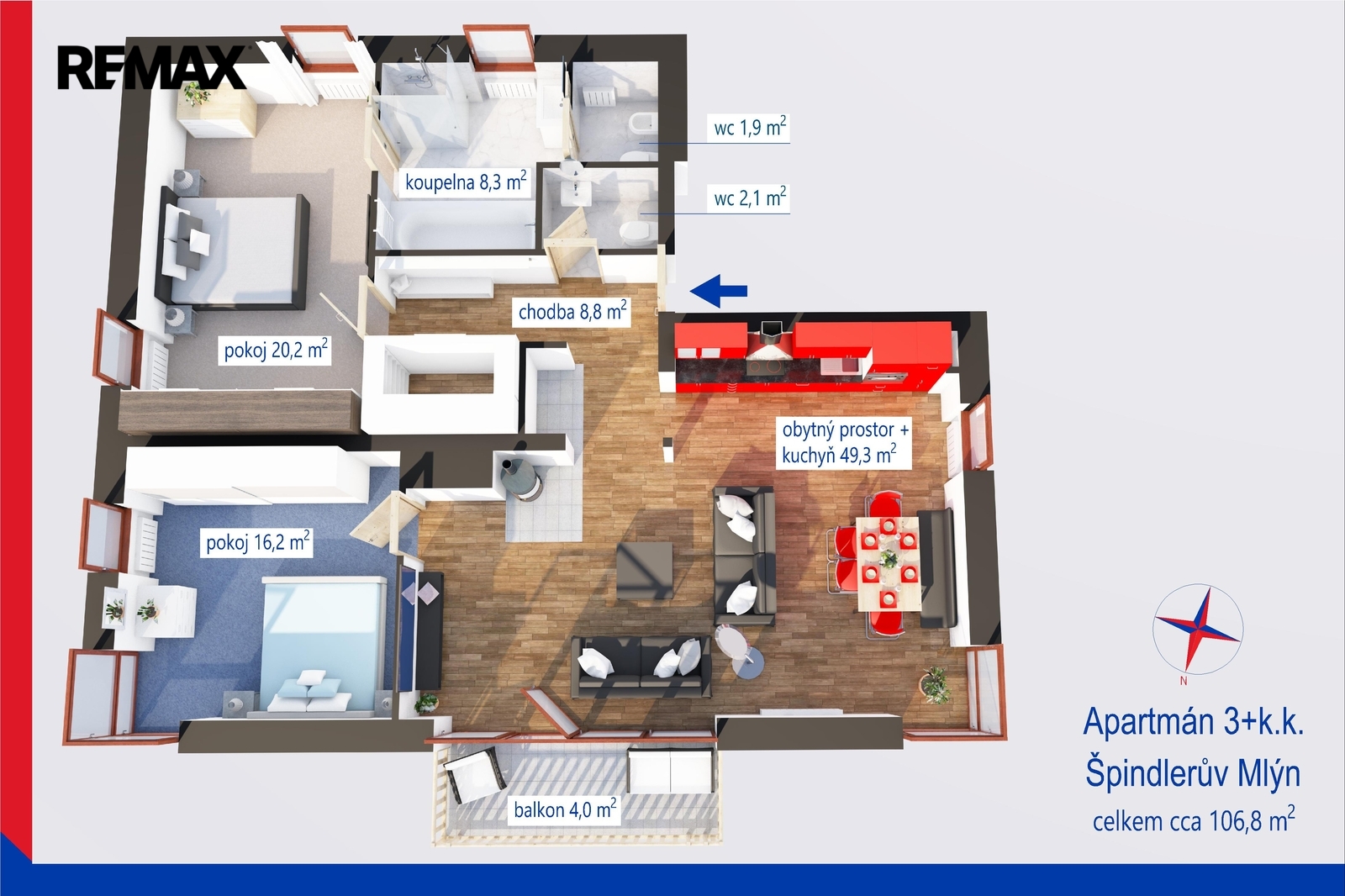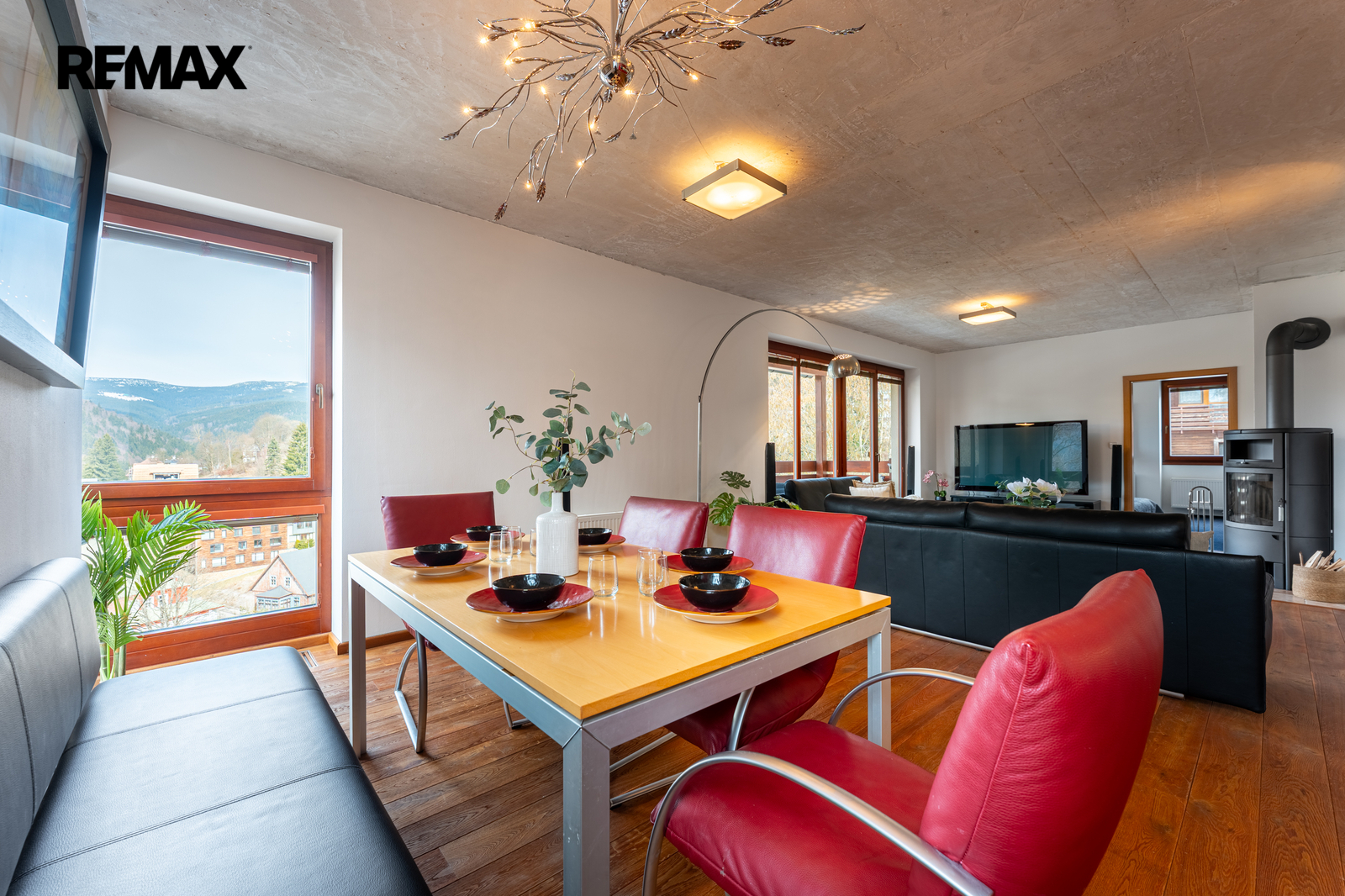 Nabízíme k prodeji výjimečný horský apartmán o dispozici 3+kk a ploše 107 m², situovaný v komorním domě na lukrativní adrese ve Špindlerově Mlýně s otevřenými výhledy na centrum i okolní hory.