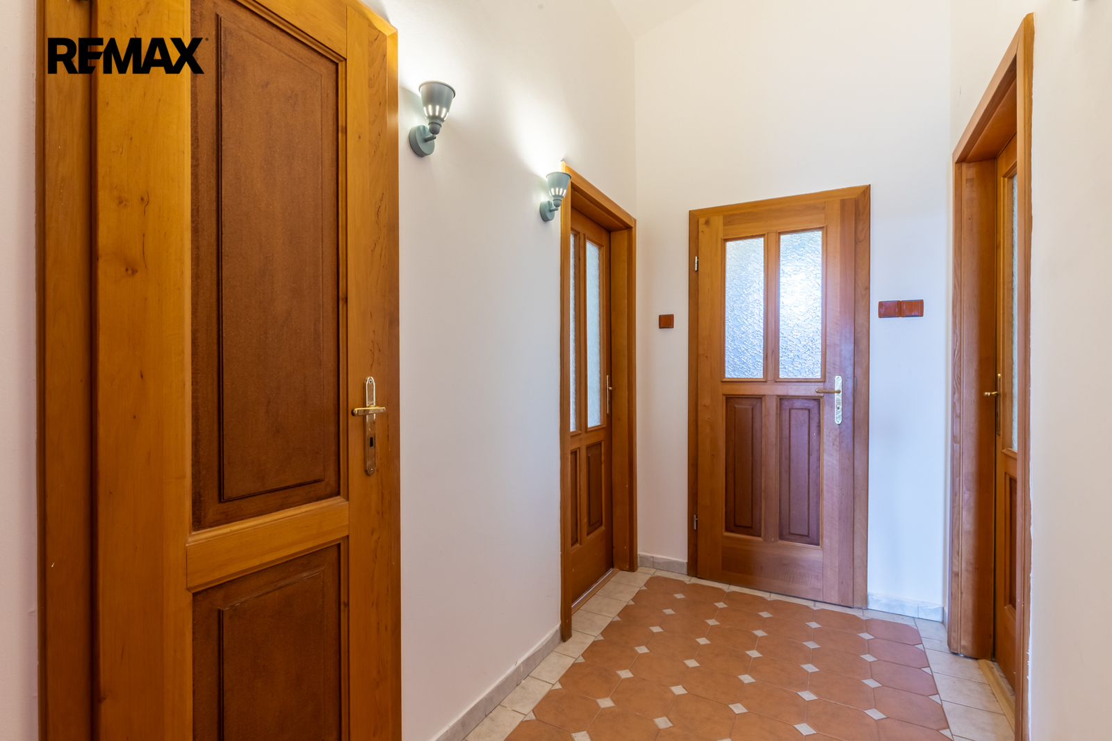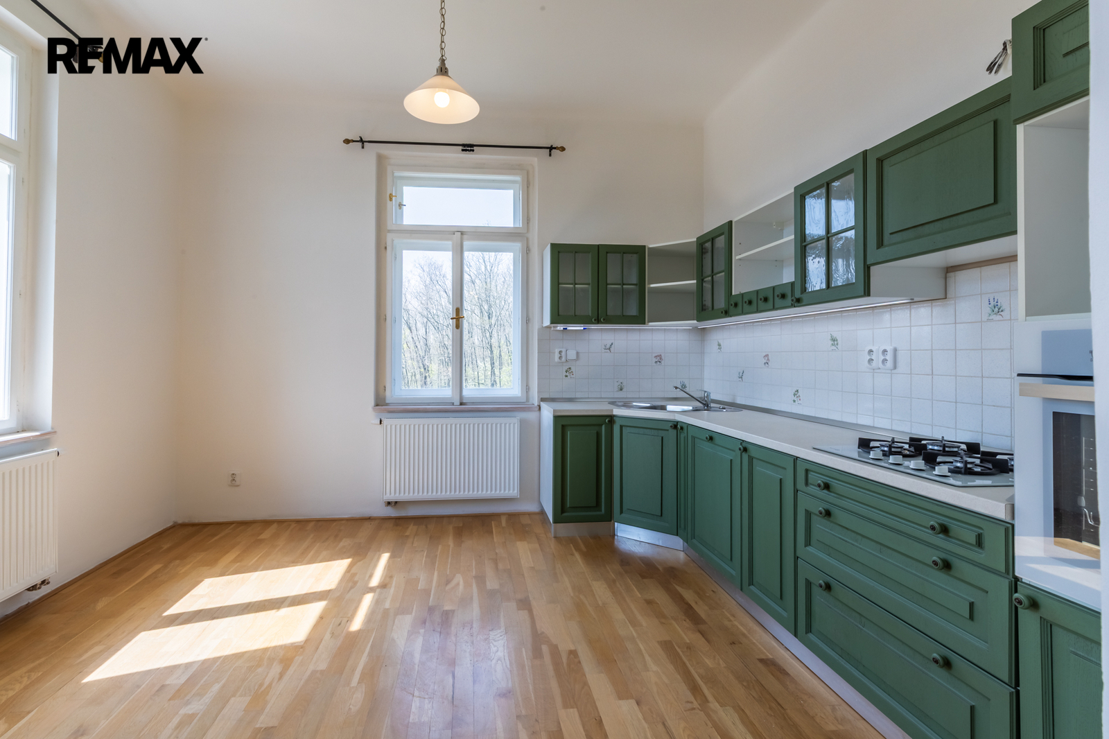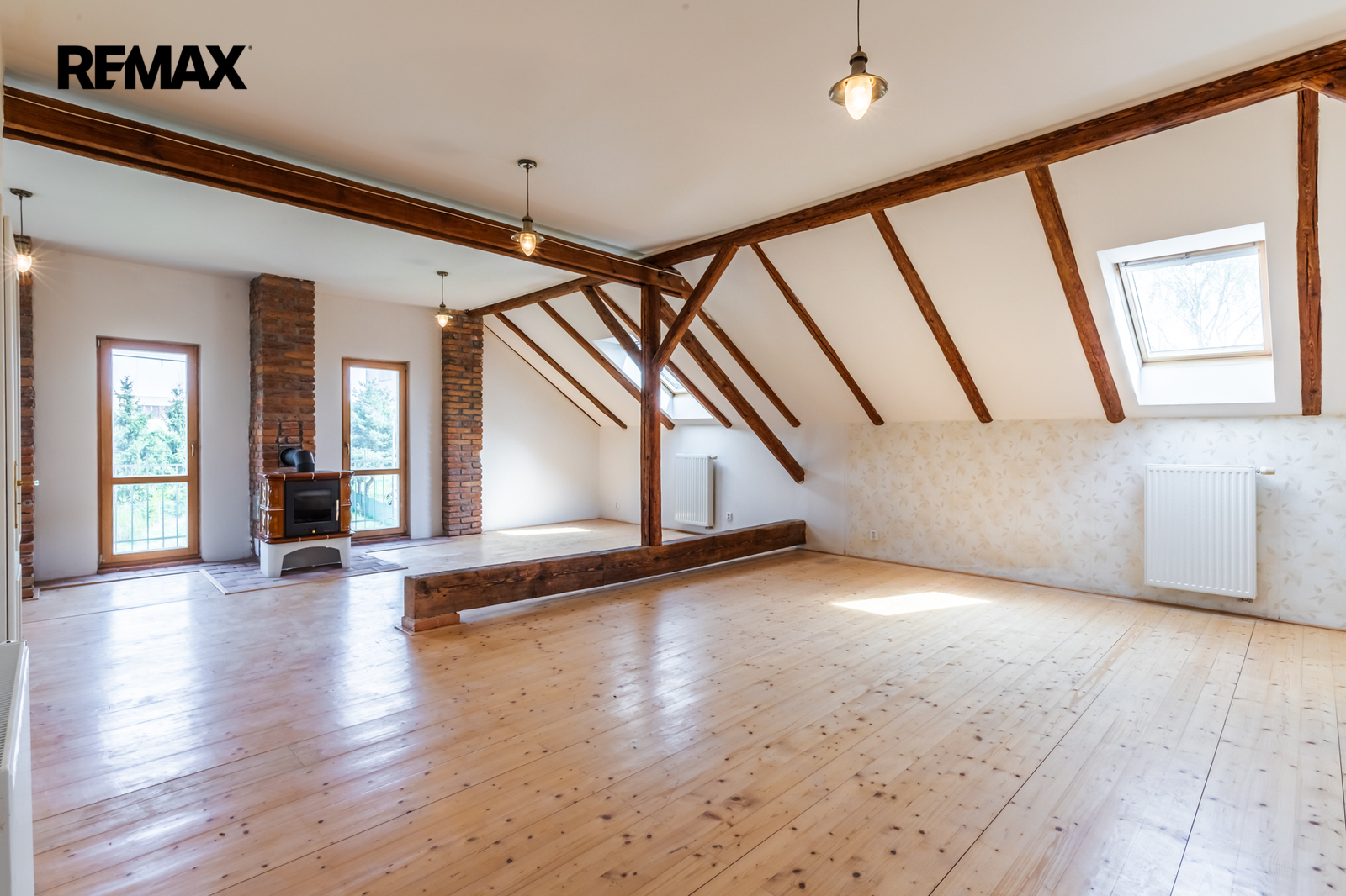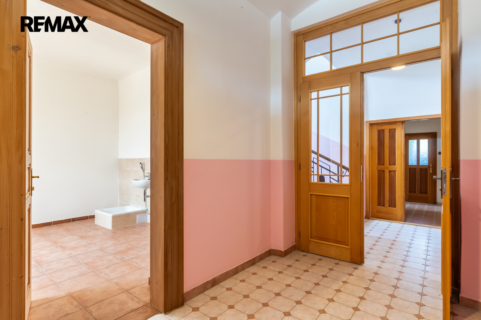 • Podlahy: dřevo a dlažba, okna: dřevěná špaletová