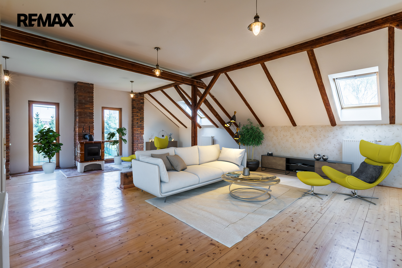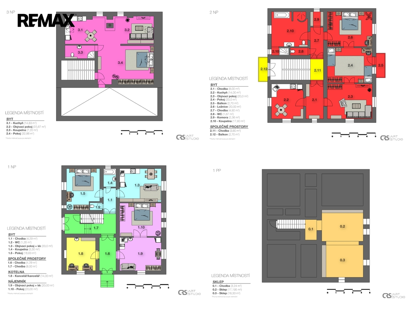 • 3.NP – 115,1 m²: Byt 4 (fialová): podkrovní byt 1+kk (77,6 m²) s krbem, koupelnou se sprchovým koutem a toaletou, a půdní prostor.