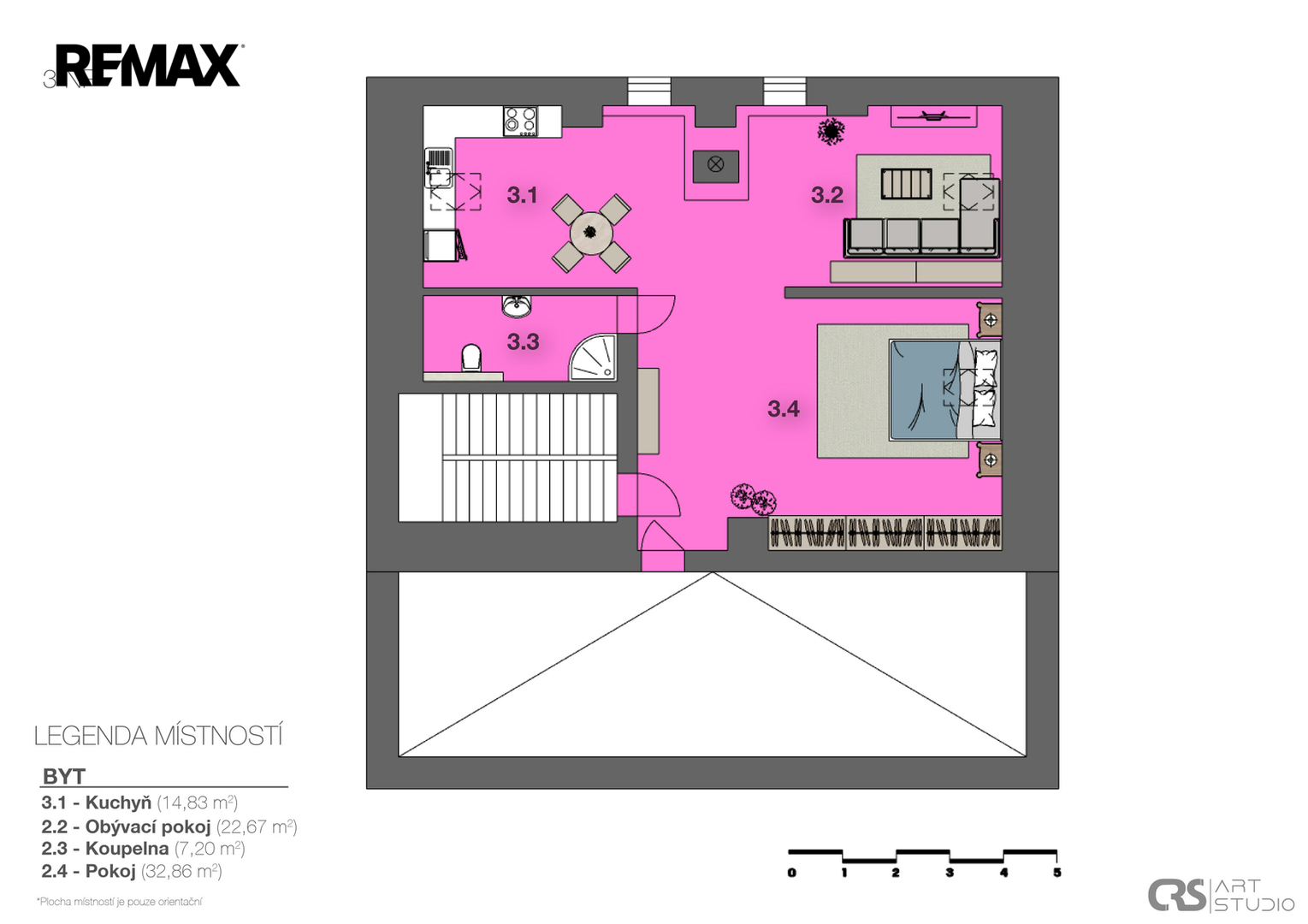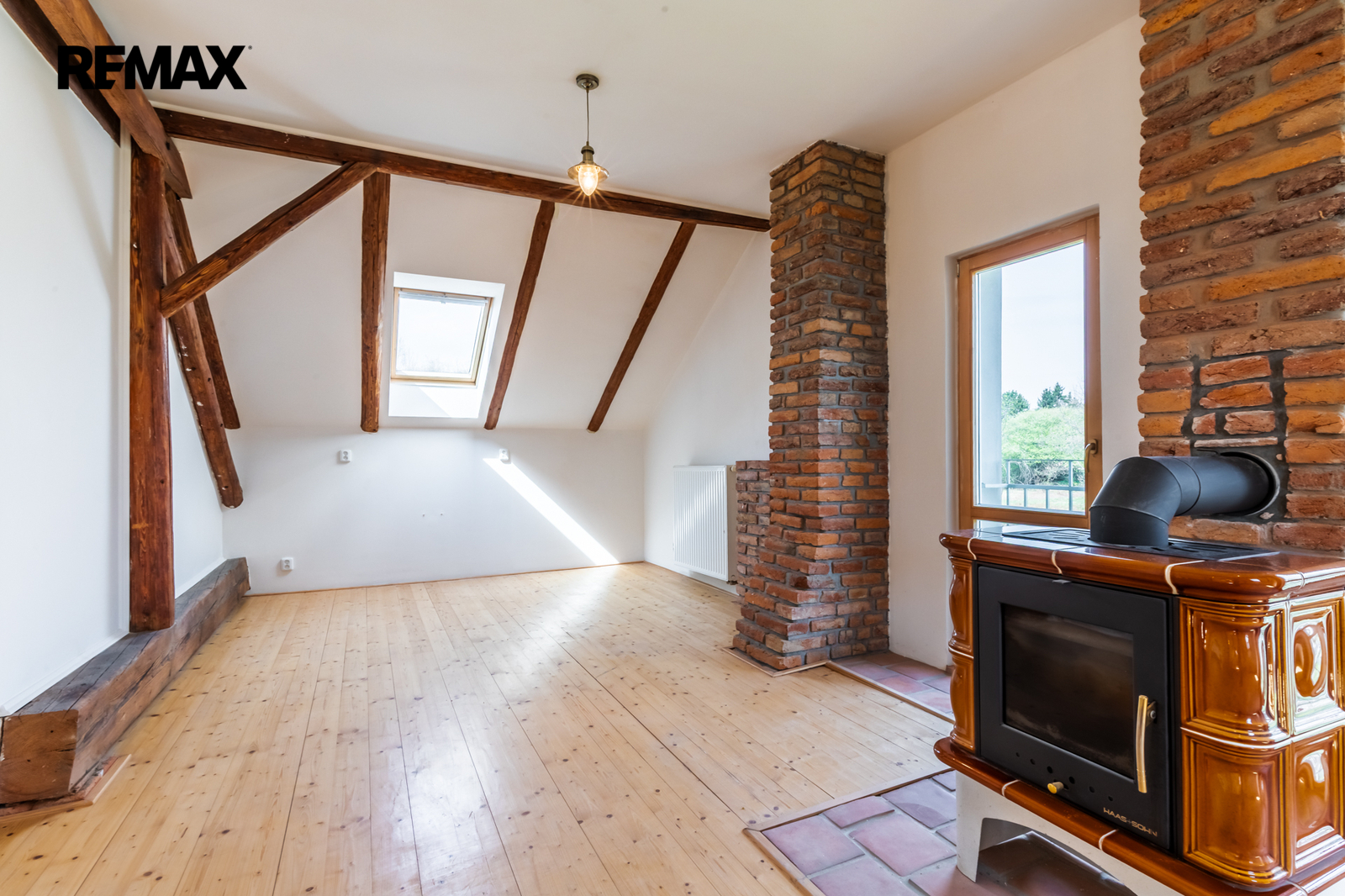 • 3. NP – 115,1 m²: podkrovní prostor (aktuálně 1+kk) s krbem, ideální jako kreativní studio, showroom či manažerské apartmá
