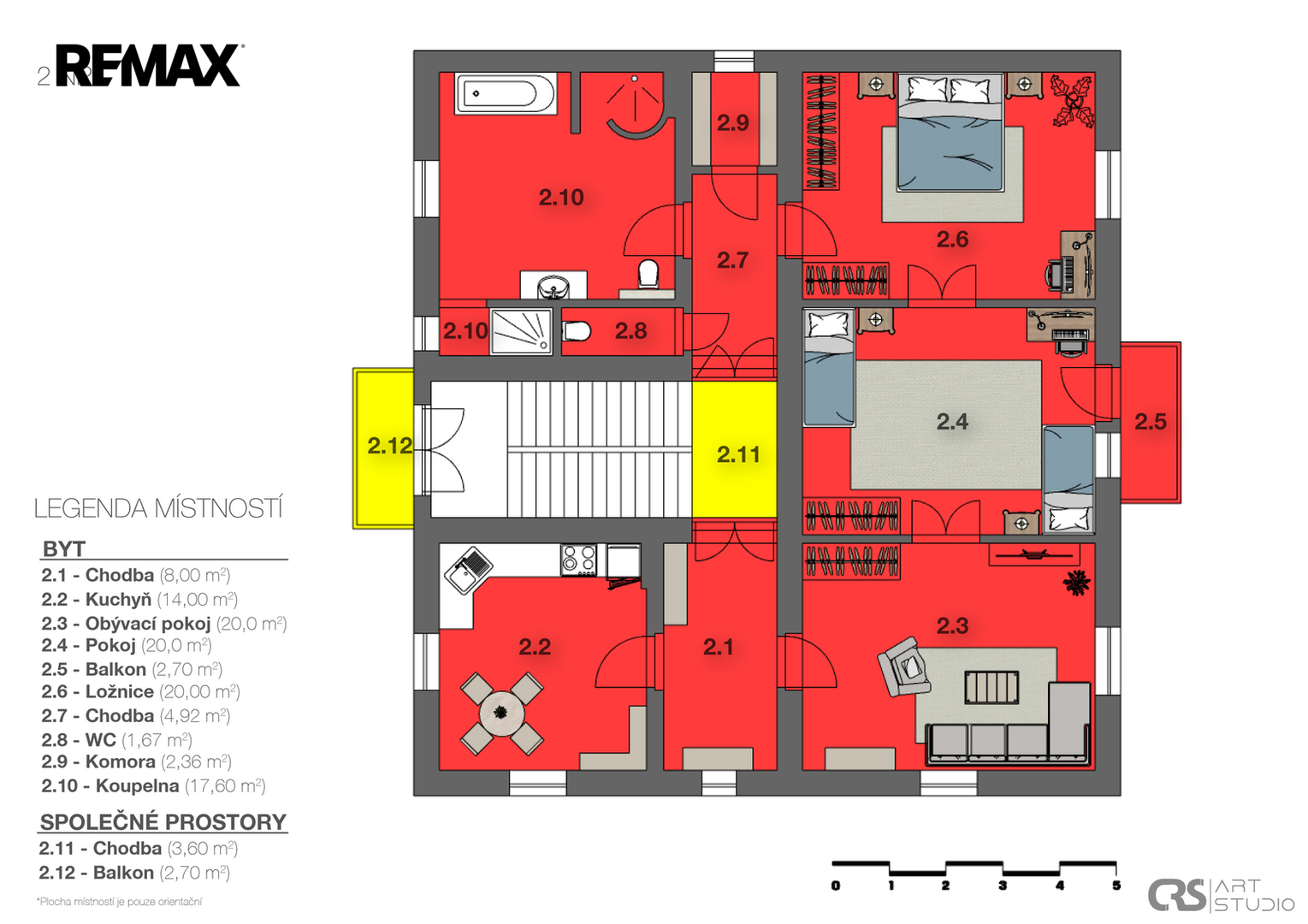 • 2. NP – 128,1 m²: rozsáhlý prostor (aktuálně 3+1) vhodný pro sídlo firmy, co-working, školící centrum nebo ateliér