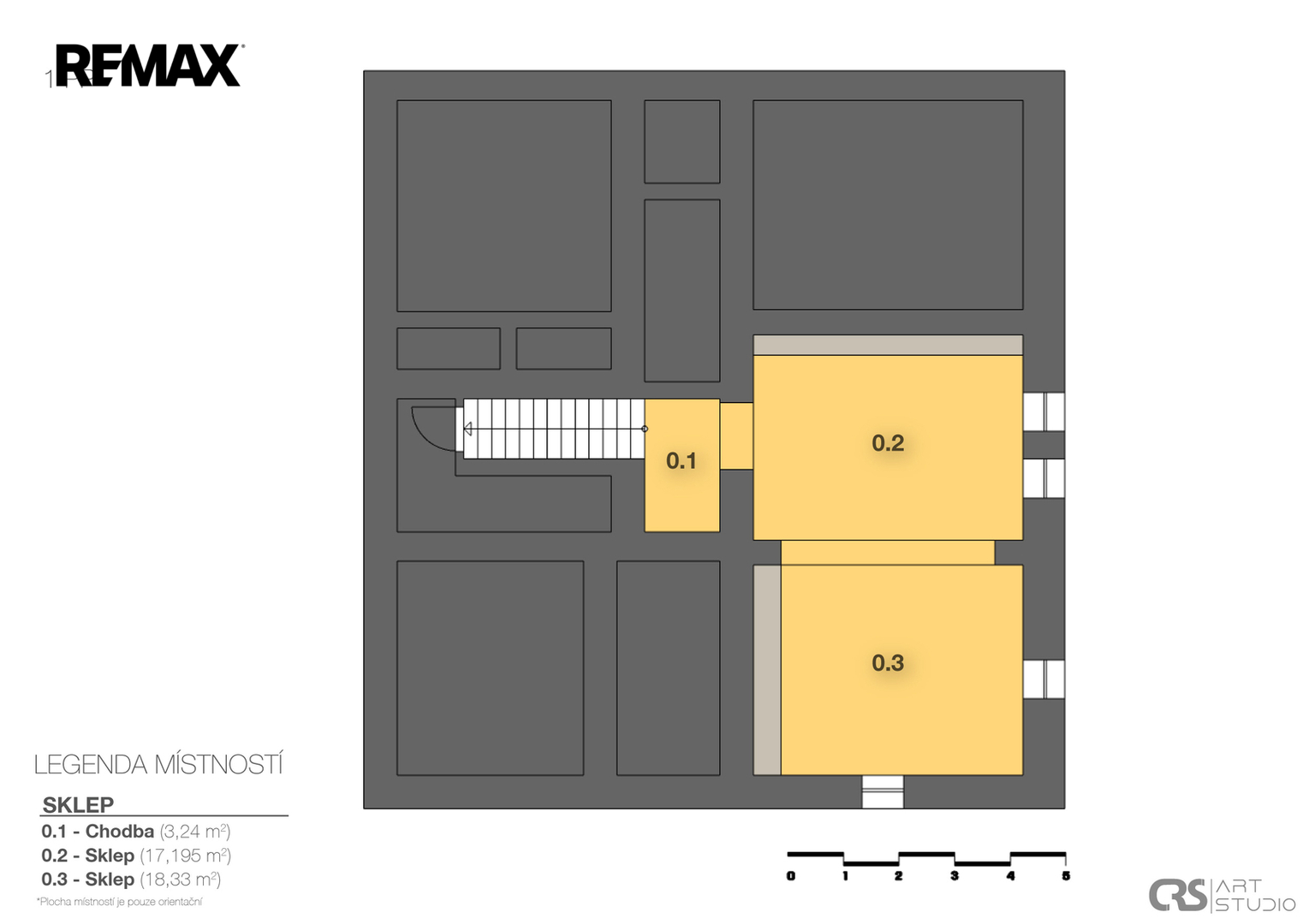 • 1. PP – 42,3 m²: sklepní a technické prostory (sklad, archiv, zázemí)