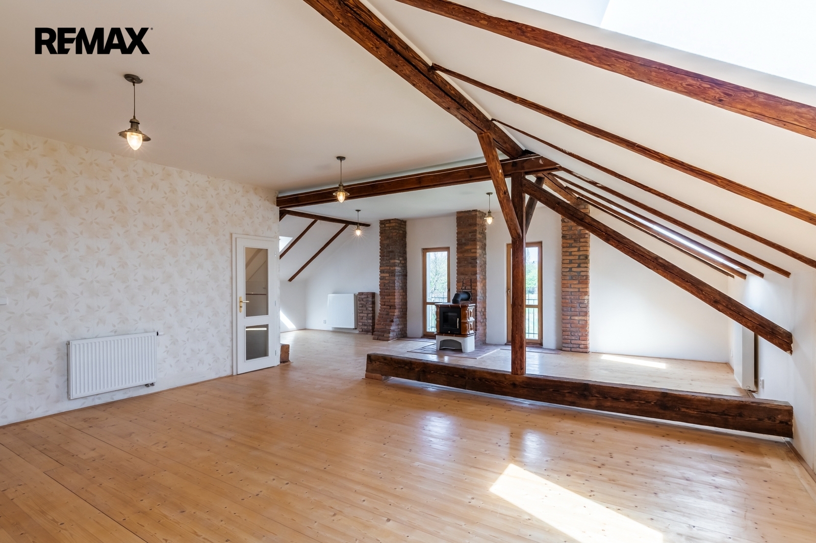 • 3. NP – 115,1 m²: podkrovní prostor (aktuálně 1+kk) s krbem, ideální jako kreativní studio, showroom či manažerské apartmá