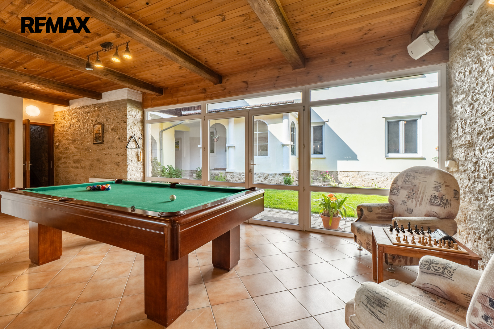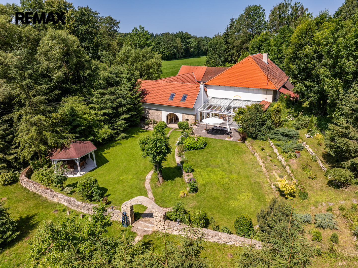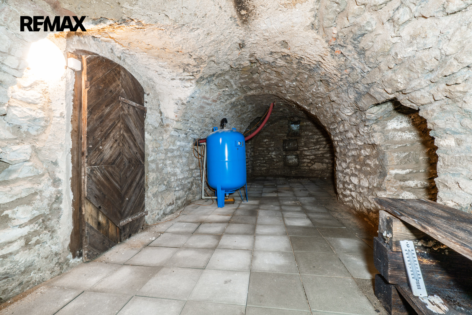 Celková užitná plocha činí 786,1 m² a nabízí mimo jiné i sál vhodný pro pořádání větších akcí. Nechybí dvě garáže s dostatkem místa pro techniku i vozidla. Ať už hledáte nové rodinné zázemí nebo výjimečné místo pro podnikání v souladu s přírodou, tato nemovitost vám dá prostor pro obojí. Dům má kamenné základy a využíván je také sklepní prostor přístupný z prostorné obývací haly, vedle kuchyňského koutu.