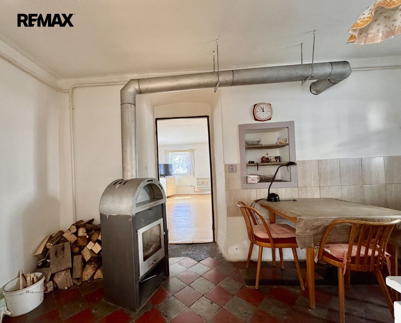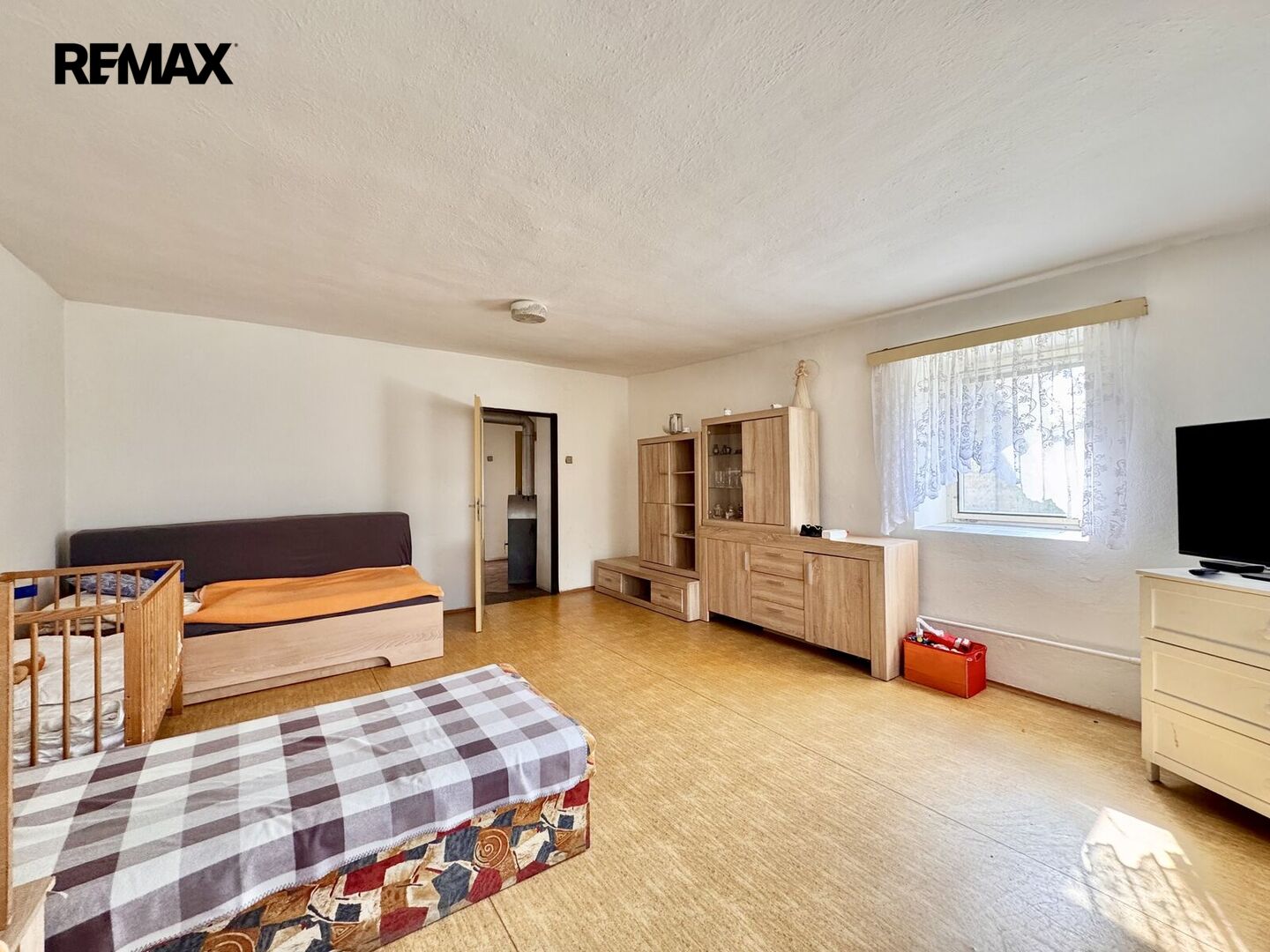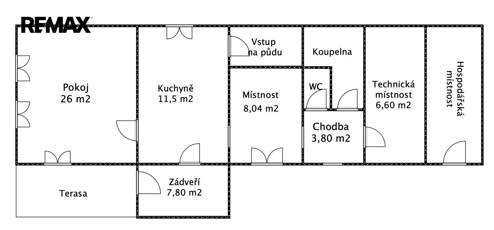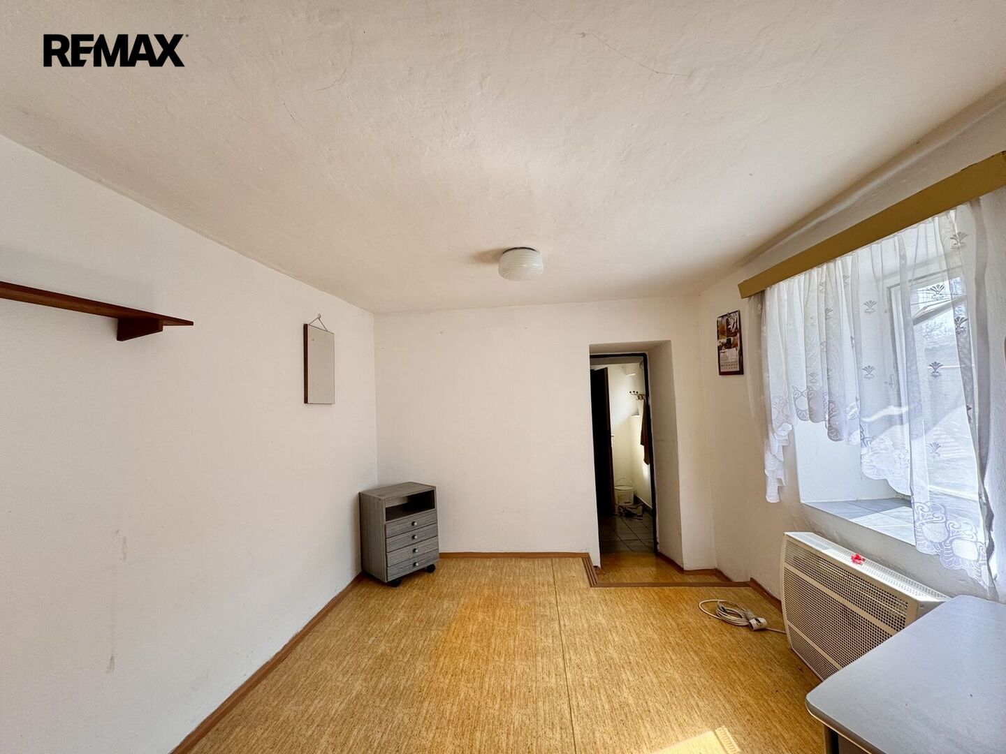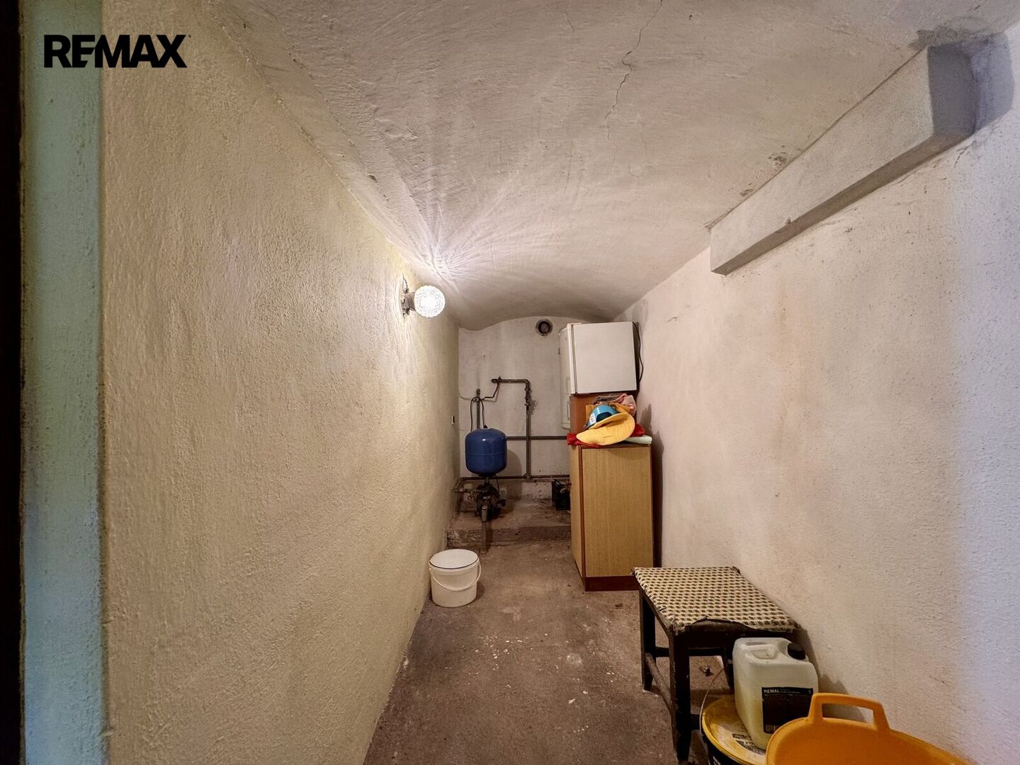 1.NP – zádveří, kuchyně, pokoj, vstup na půdu, průchozí pokoj do chodby, kde je WC a koupelna s vanou, technická místnost s el. bojlerem a darlingem na studnu.