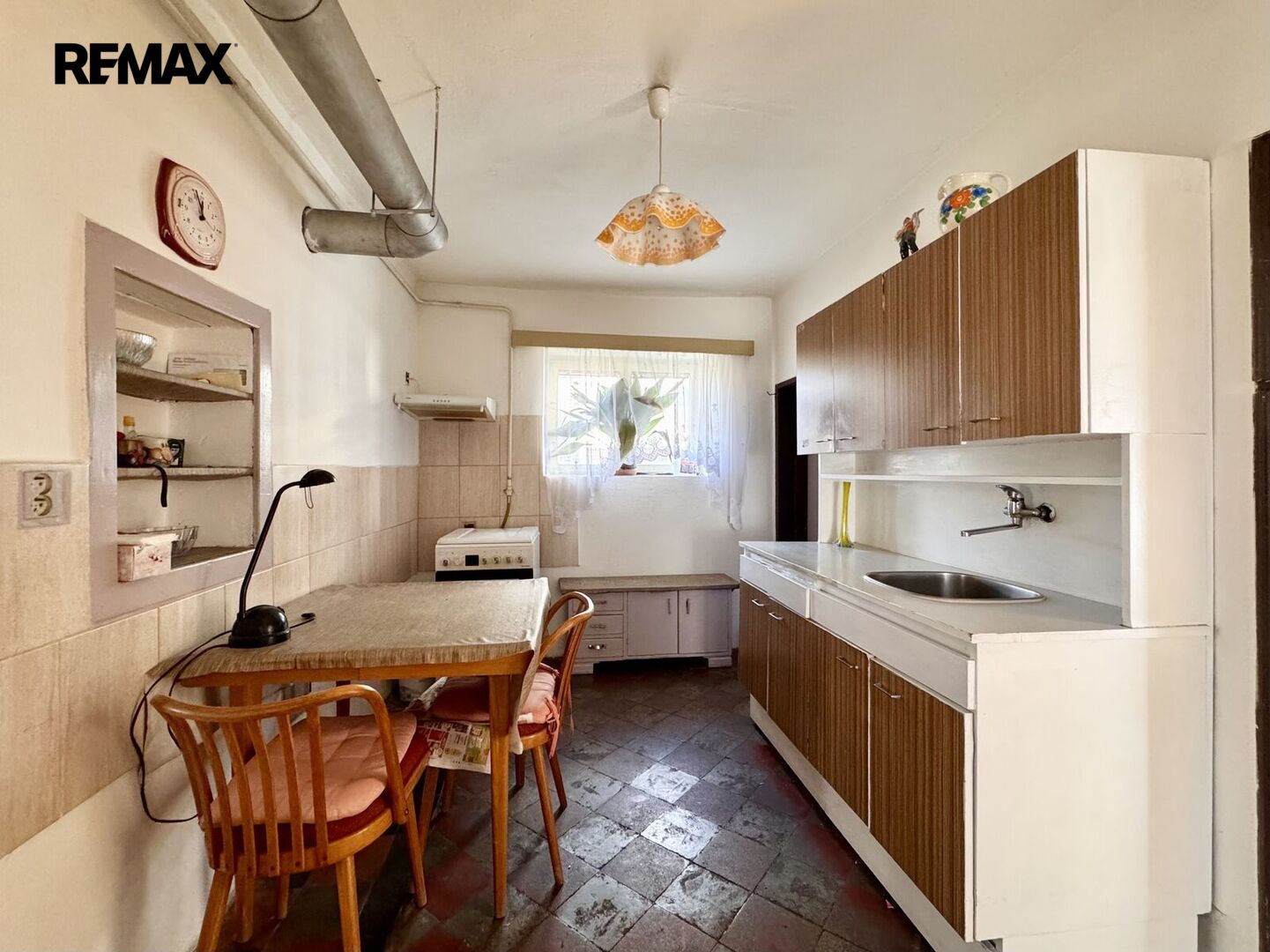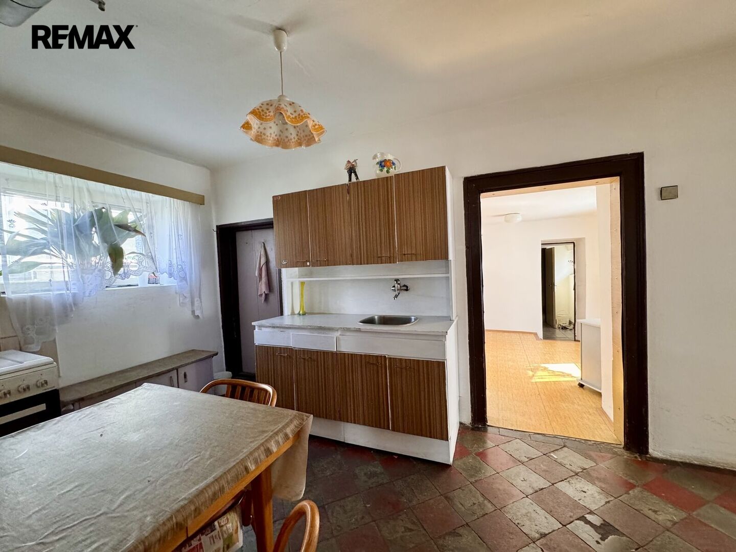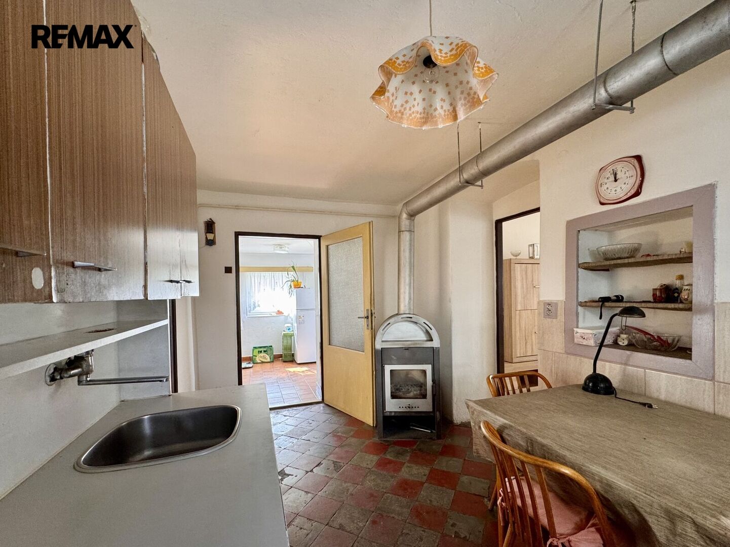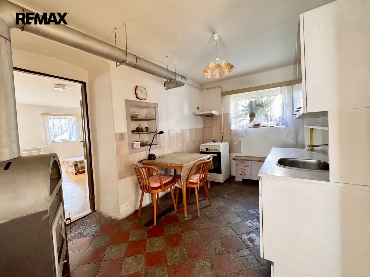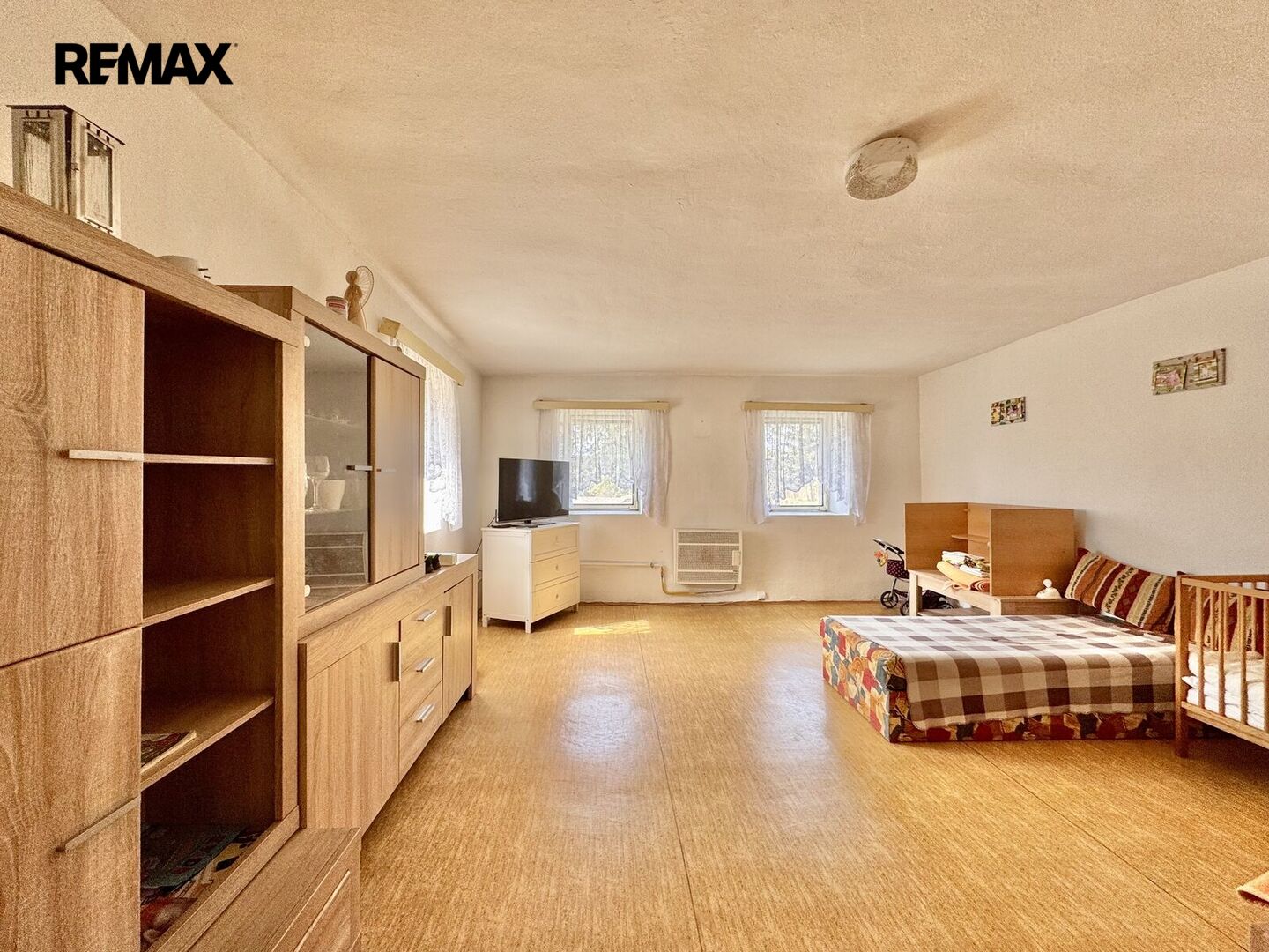 1.NP – zádveří, kuchyně, pokoj, vstup na půdu, průchozí pokoj do chodby, kde je WC a koupelna s vanou, technická místnost s el. bojlerem a darlingem na studnu.