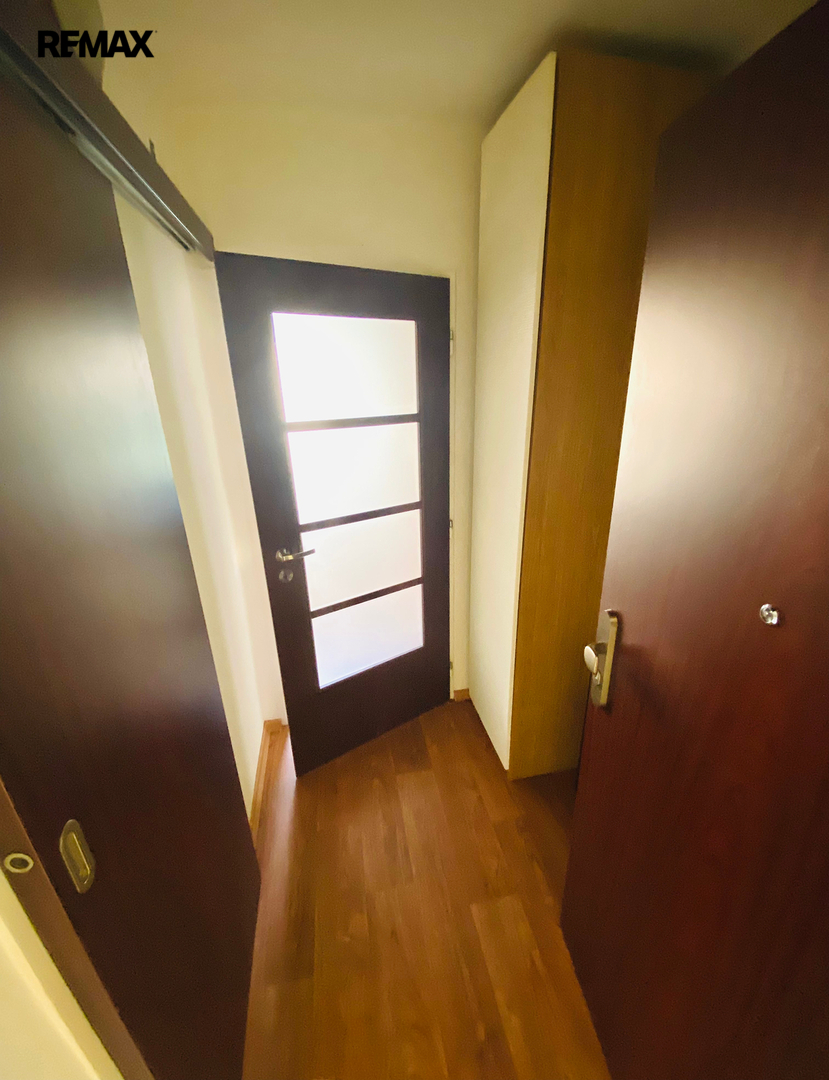 Za vstupními dveřmi bytu je chodba s úložným prostorem, botníkem a věšákem. Po levé straně bytu je koupelna se sprchovým koutem, toaletou a umyvadlem.