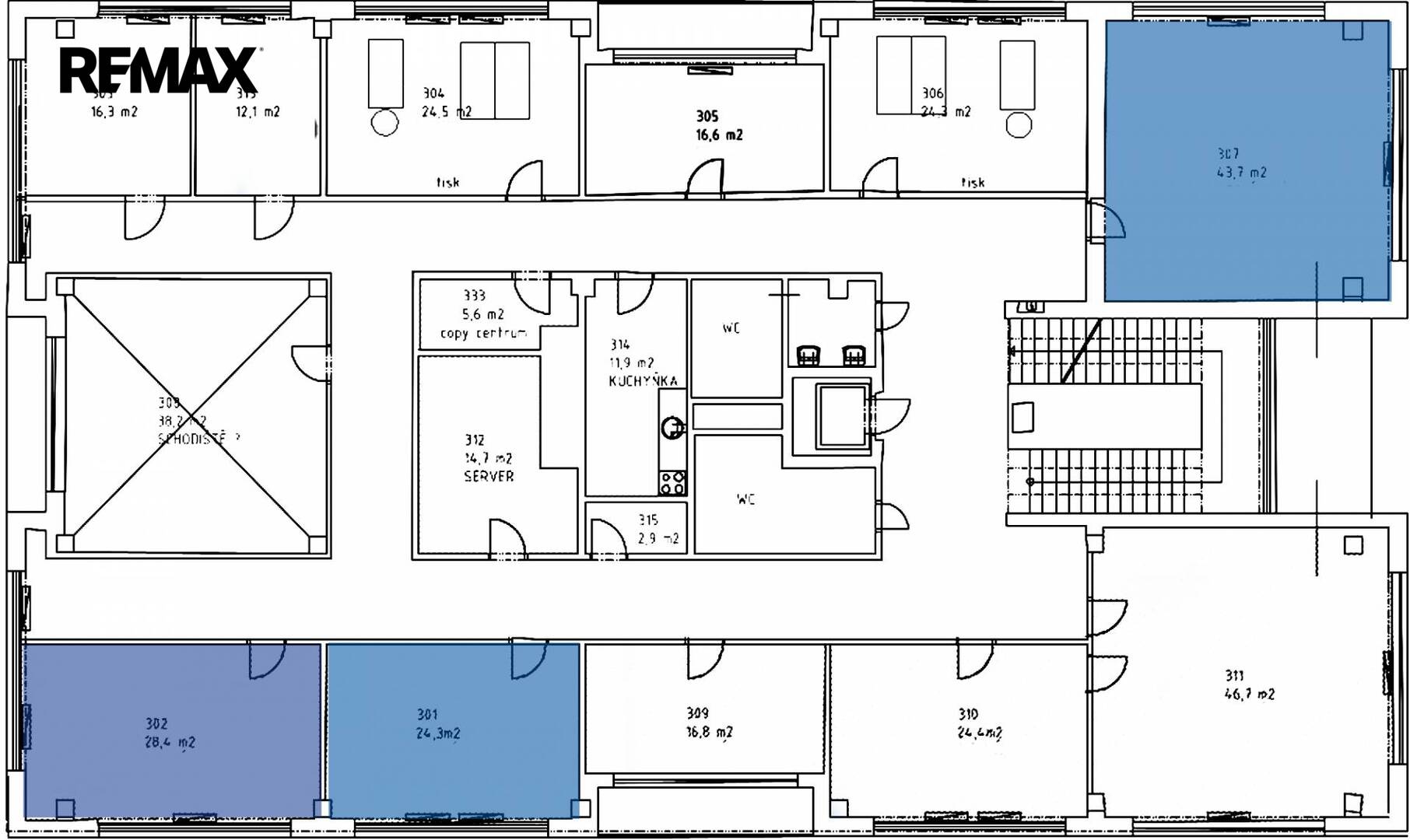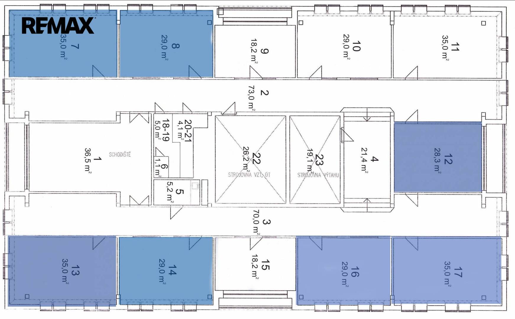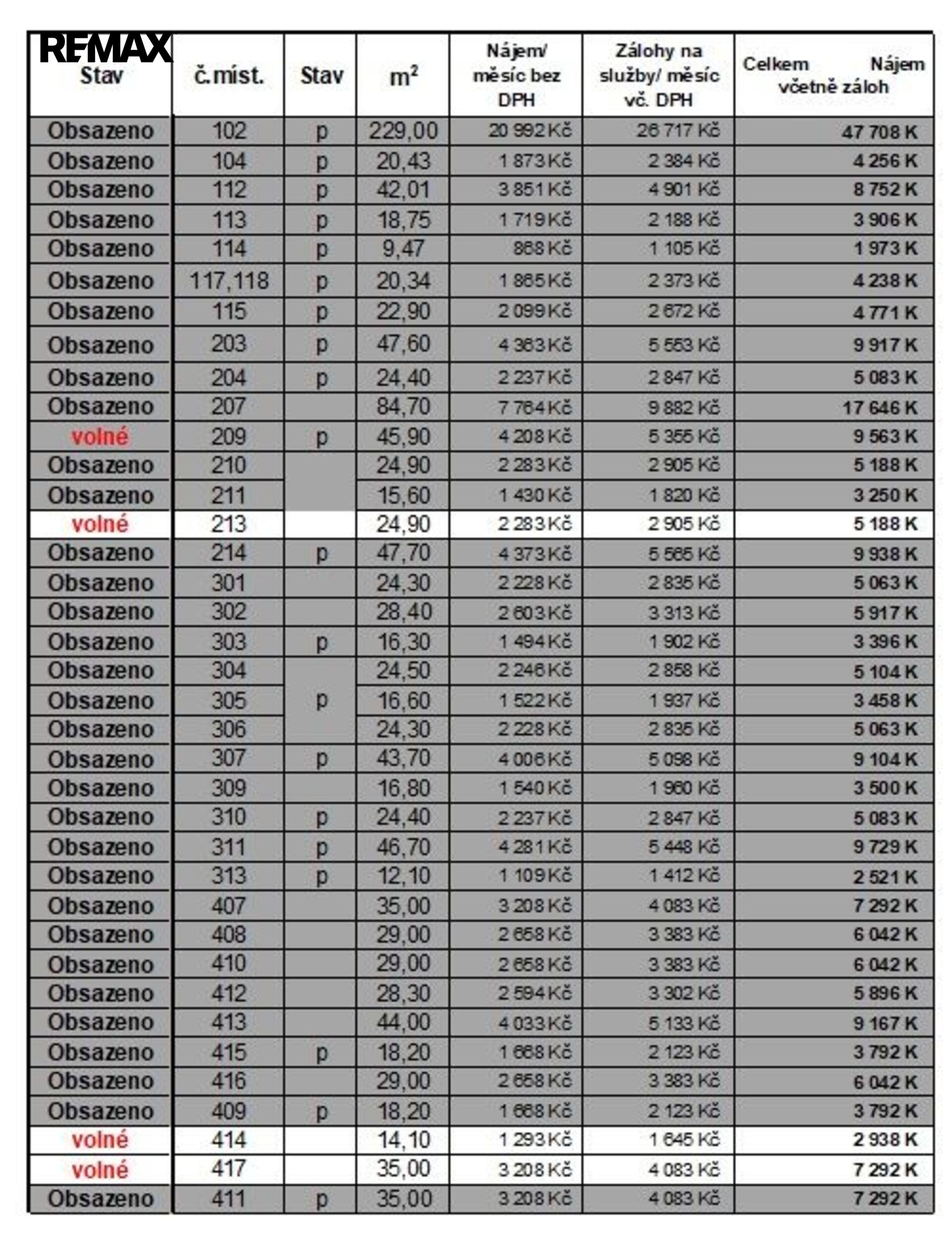 V současnosti jsou volné kanceláře o velikostech od 25 m2 (nájem 2300 Kč + DPH) do 35 m2 (nájem 3208 Kč + DPH). Obsazenost se často mění, proto pro ověření obsazenosti vámi vybrané kanceláře, volejte.