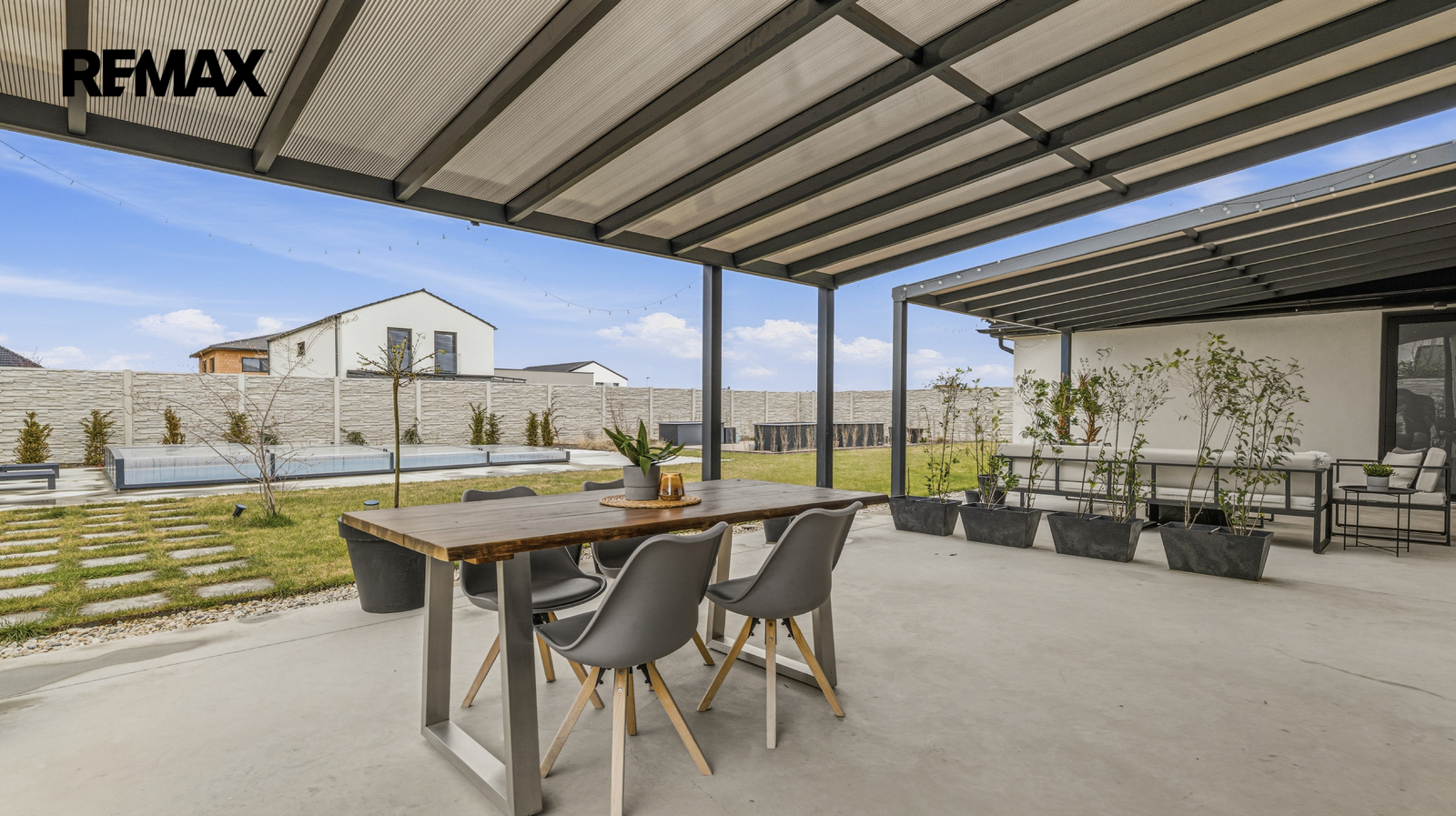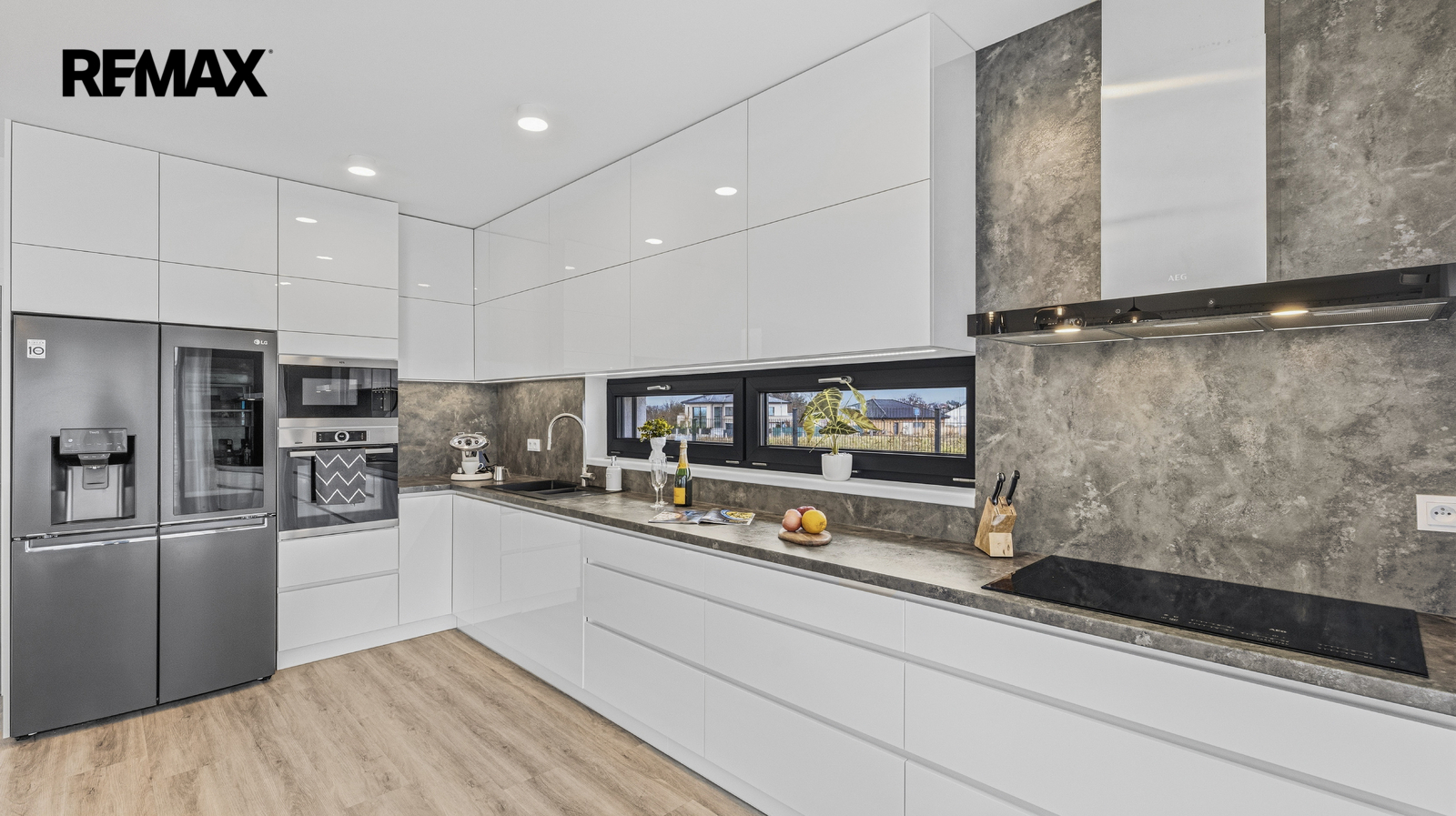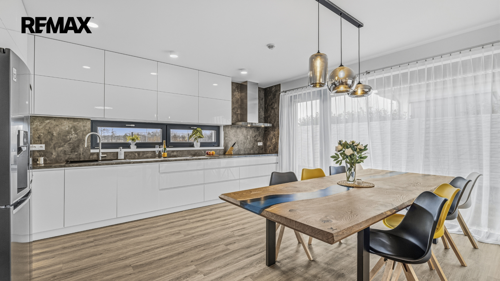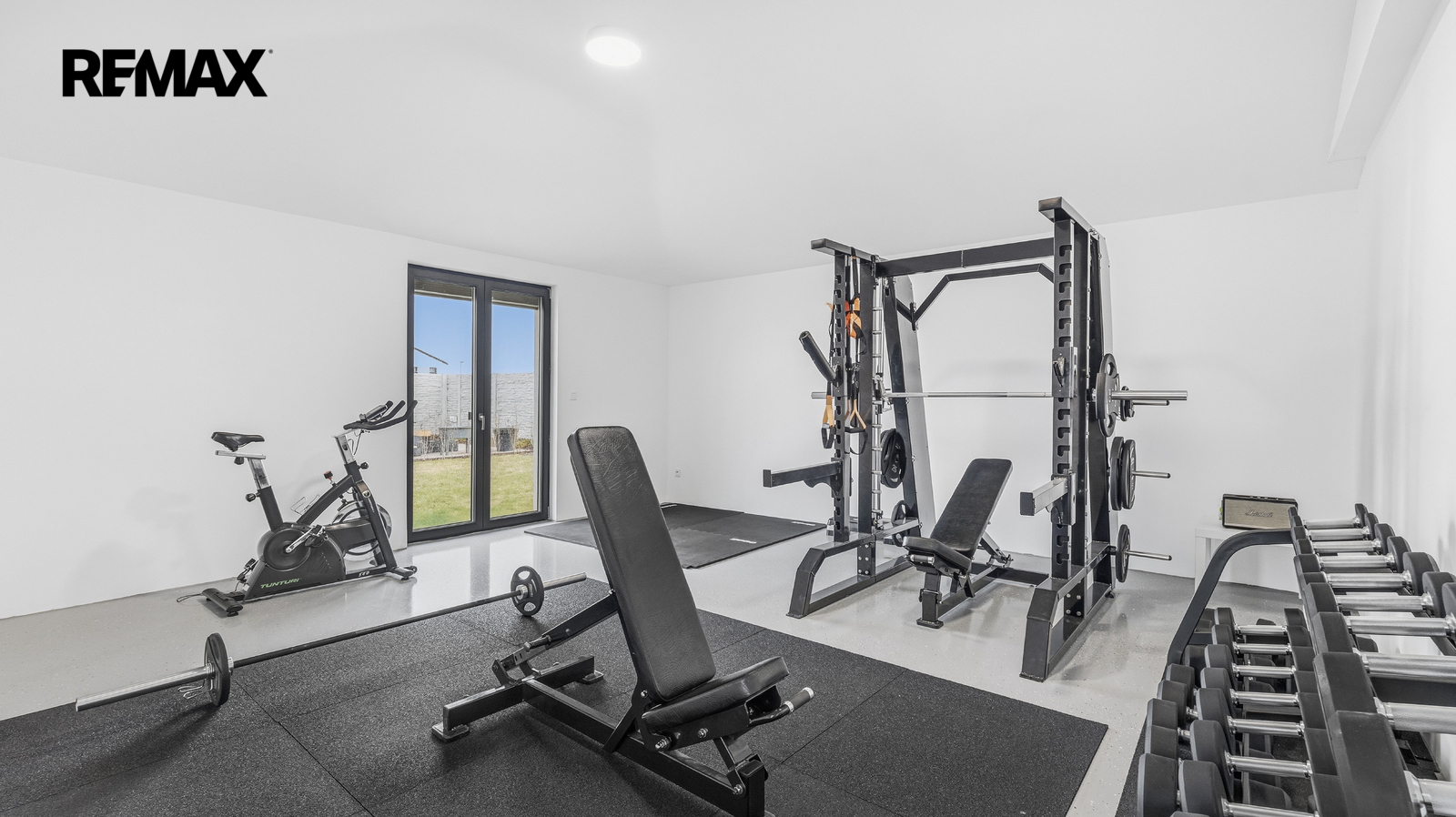 Dominantou přízemí je nádherně prosvětlený obývací prostor s kuchyní a jídelnou, který díky velkoformátovým oknům a HS portálu plynule navazuje na prostornou terasu o výměře 76 m², ideální pro relaxaci i společenské chvíle. Součástí kuchyňské linky jsou kvalitní spotřebiče AEG a jídelna je vybavena designovým dřevěným stolem z masivu na míru. V přízemí se dále nachází vstupní hala s vestavnými skříněmi, dvojgaráž o velikosti 43 m² s přímým vstupem do domu, fitness místnost, hostinský pokoj se vstupem na terasu, technická místnost, dvě spíže a koupelna se sprchovým koutem.