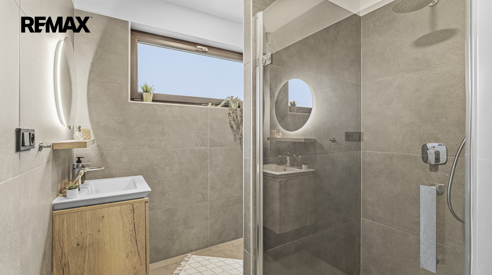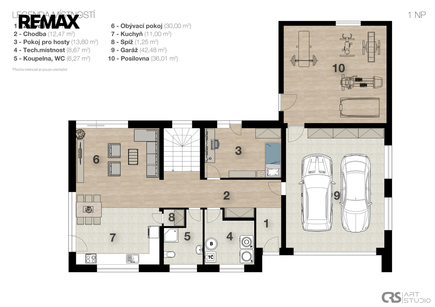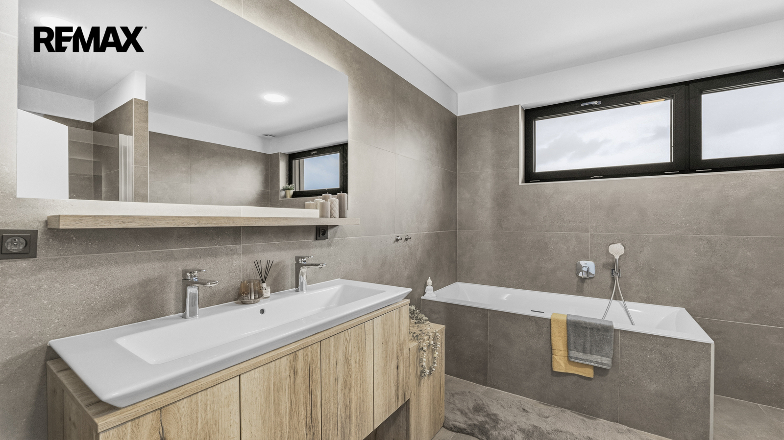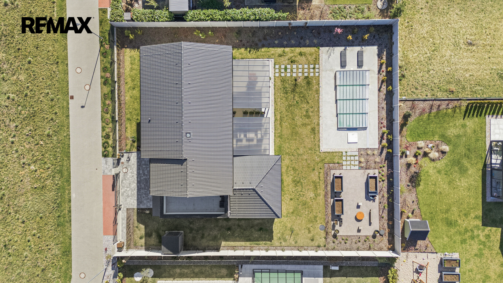 Dominantou přízemí je nádherně prosvětlený obývací prostor s kuchyní a jídelnou, který díky velkoformátovým oknům a HS portálu plynule navazuje na prostornou terasu o výměře 76 m², ideální pro relaxaci i společenské chvíle. Součástí kuchyňské linky jsou kvalitní spotřebiče AEG a jídelna je vybavena designovým dřevěným stolem z masivu na míru. V přízemí se dále nachází vstupní hala s vestavnými skříněmi, dvojgaráž o velikosti 43 m² s přímým vstupem do domu, fitness místnost, hostinský pokoj se vstupem na terasu, technická místnost, dvě spíže a koupelna se sprchovým koutem.