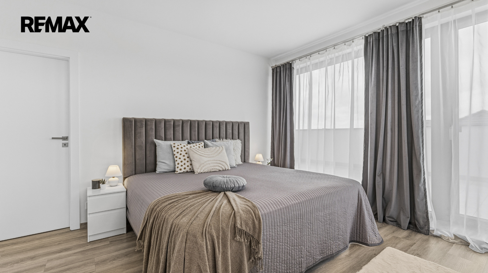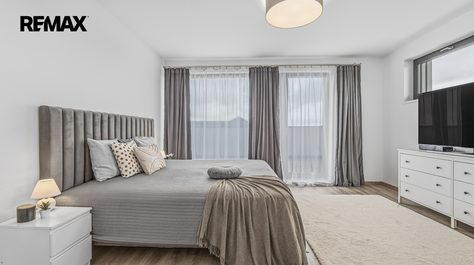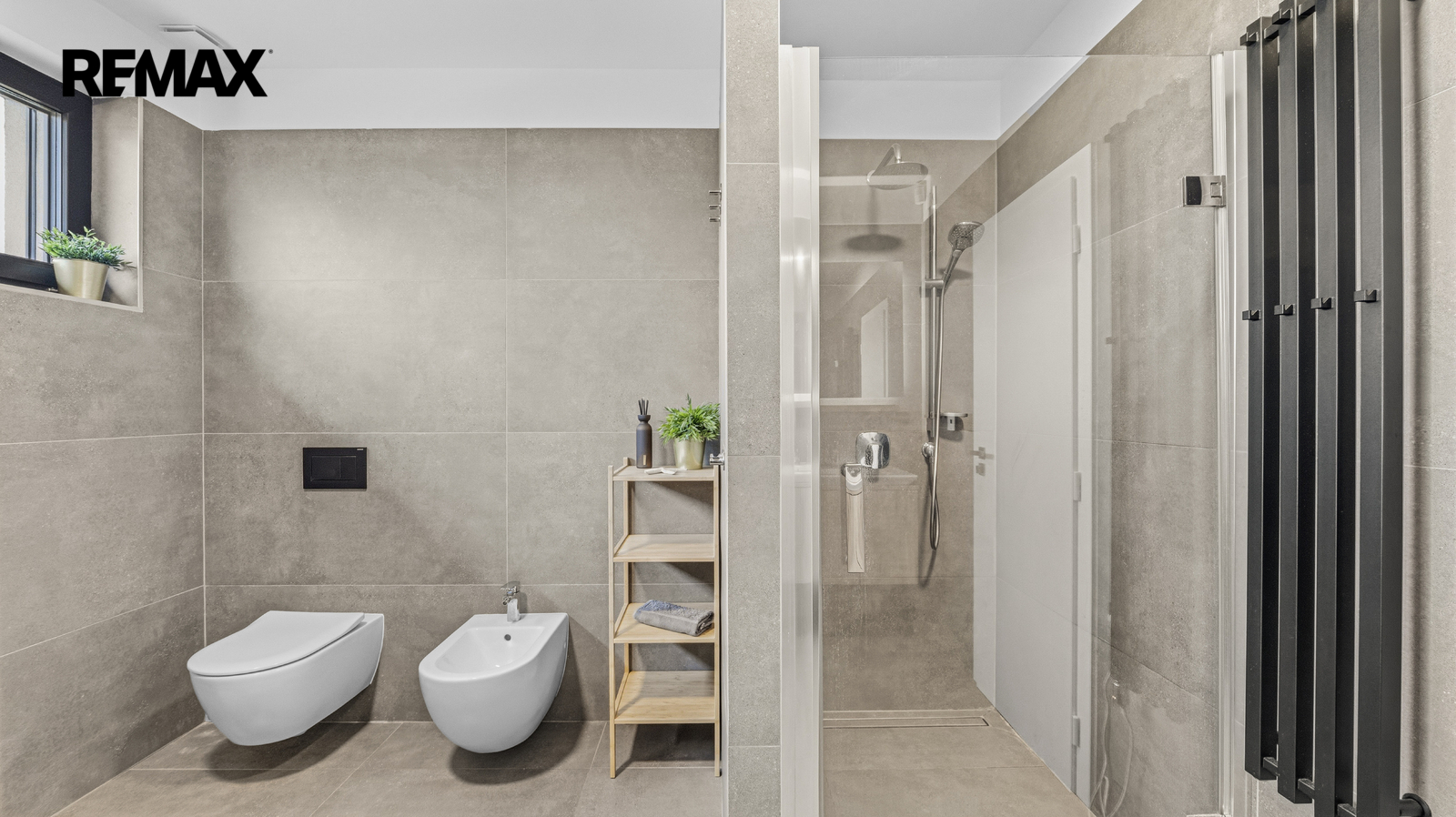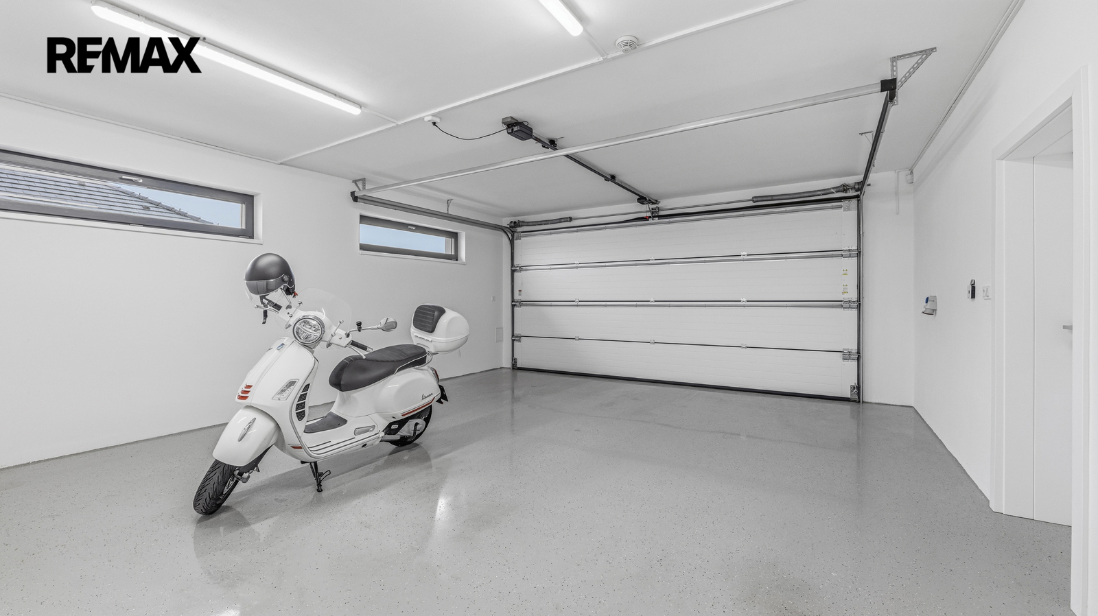 Dominantou přízemí je nádherně prosvětlený obývací prostor s kuchyní a jídelnou, který díky velkoformátovým oknům a HS portálu plynule navazuje na prostornou terasu o výměře 76 m², ideální pro relaxaci i společenské chvíle. Součástí kuchyňské linky jsou kvalitní spotřebiče AEG a jídelna je vybavena designovým dřevěným stolem z masivu na míru. V přízemí se dále nachází vstupní hala s vestavnými skříněmi, dvojgaráž o velikosti 43 m² s přímým vstupem do domu, fitness místnost, hostinský pokoj se vstupem na terasu, technická místnost, dvě spíže a koupelna se sprchovým koutem.