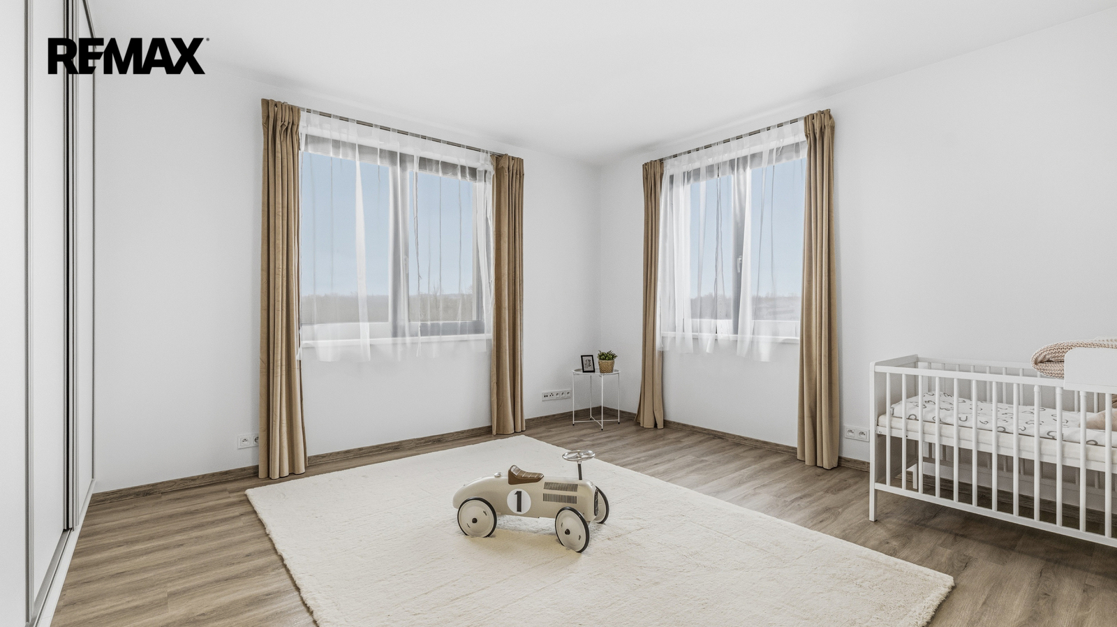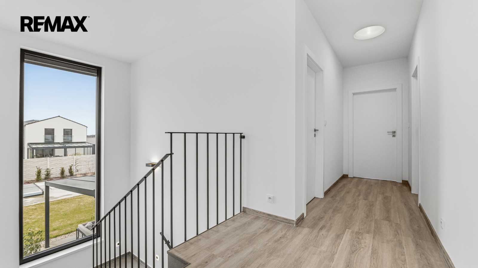 V patře je klidová zóna domu s hlavní ložnicí, vlastní šatnou a vstupem na soukromou terasu o velikosti 21 m2 s výhledem na Prahu, dvěma dětskými pokoji, pracovnou, prostornou koupelnou s vanou i sprchovým koutem a další samostatnou šatnou. Prosklené schodiště propojující obě podlaží dodává interiéru vzdušnost a dostatek denního světla.