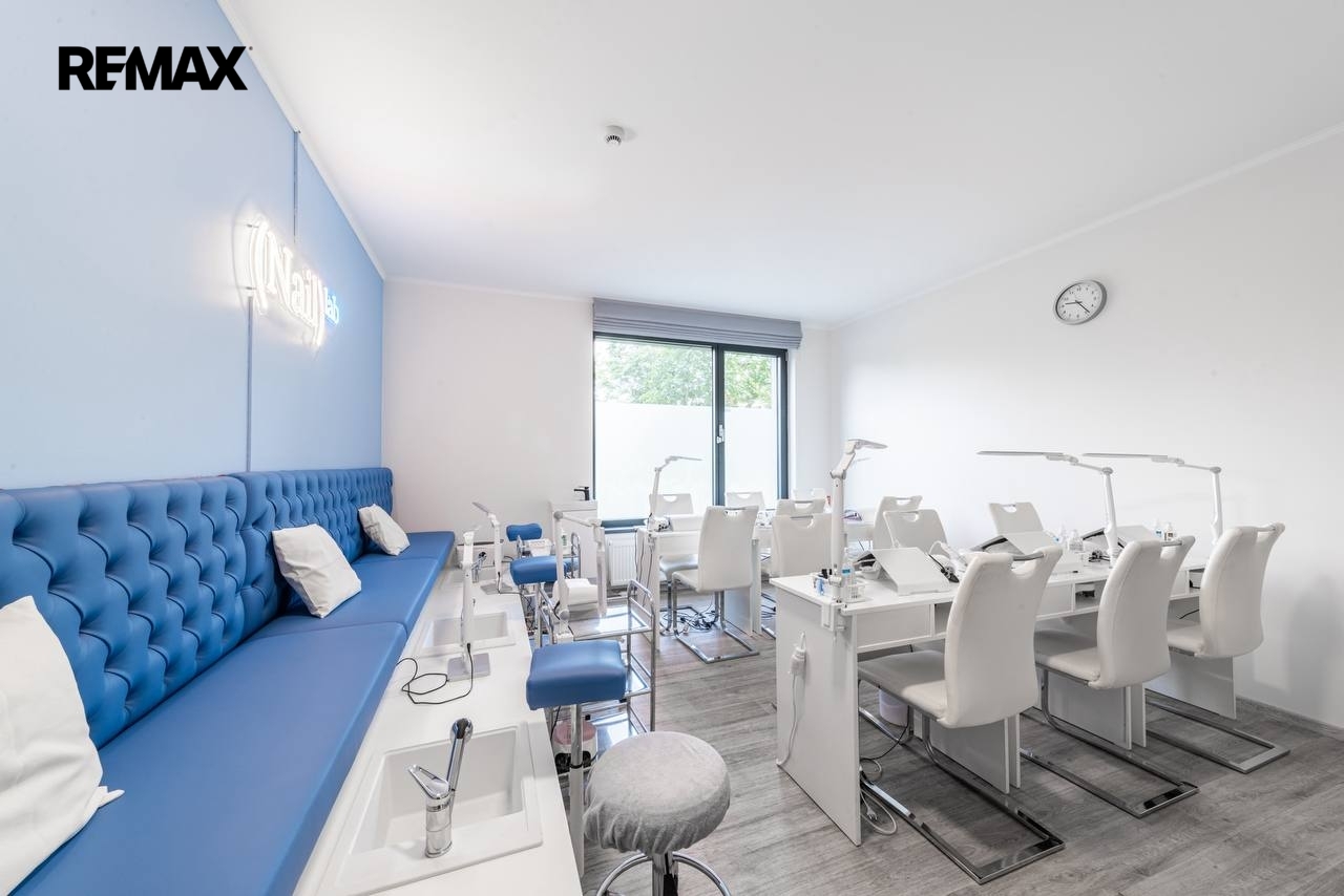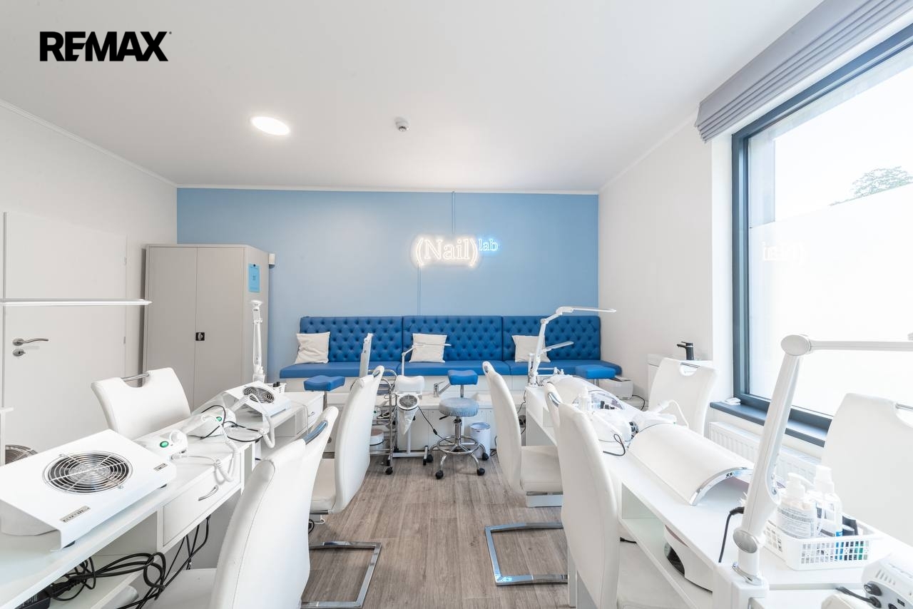 Prostor se nachází v přízemí a je vybaven ventilací a velkými okny, která zajišťují dostatek denního světla. V místnosti je již instalován podiový systém pro pedikúru (3 pracovní místa) a je zde dostatek prostoru pro umístění stolů na manikúru.