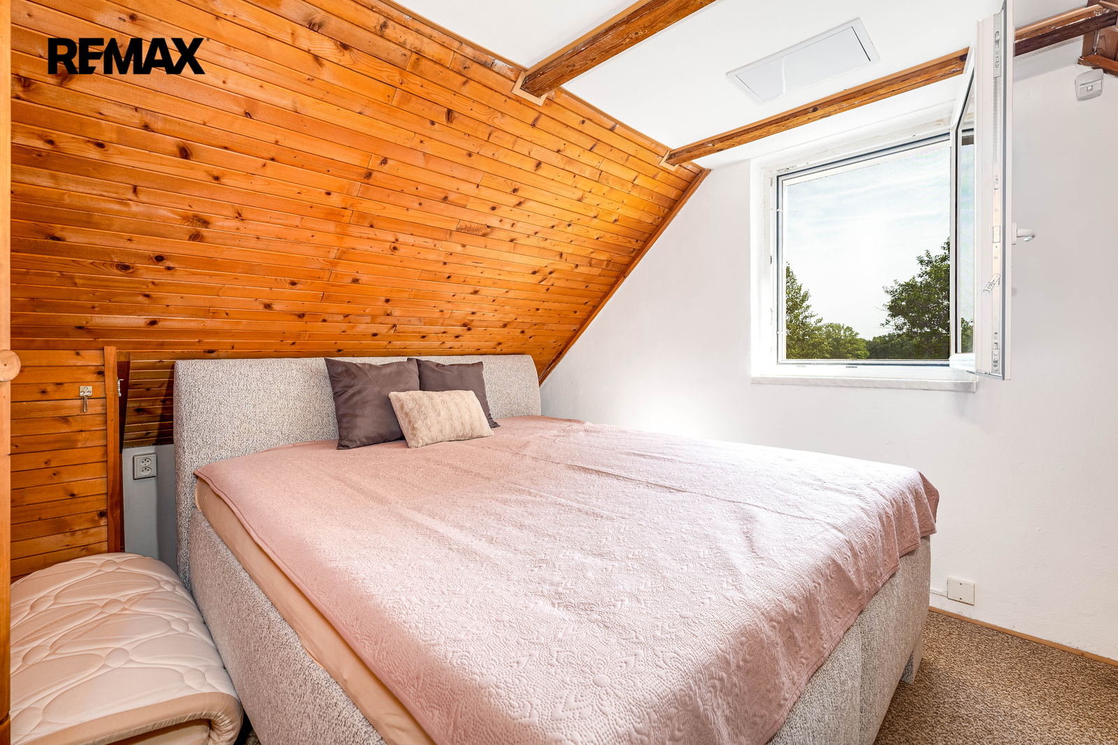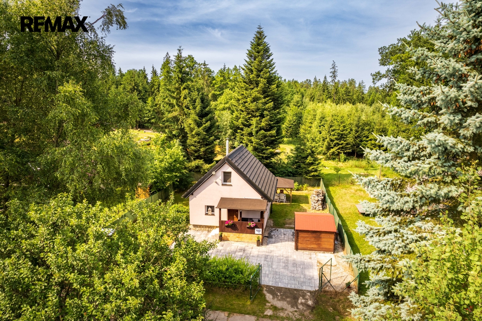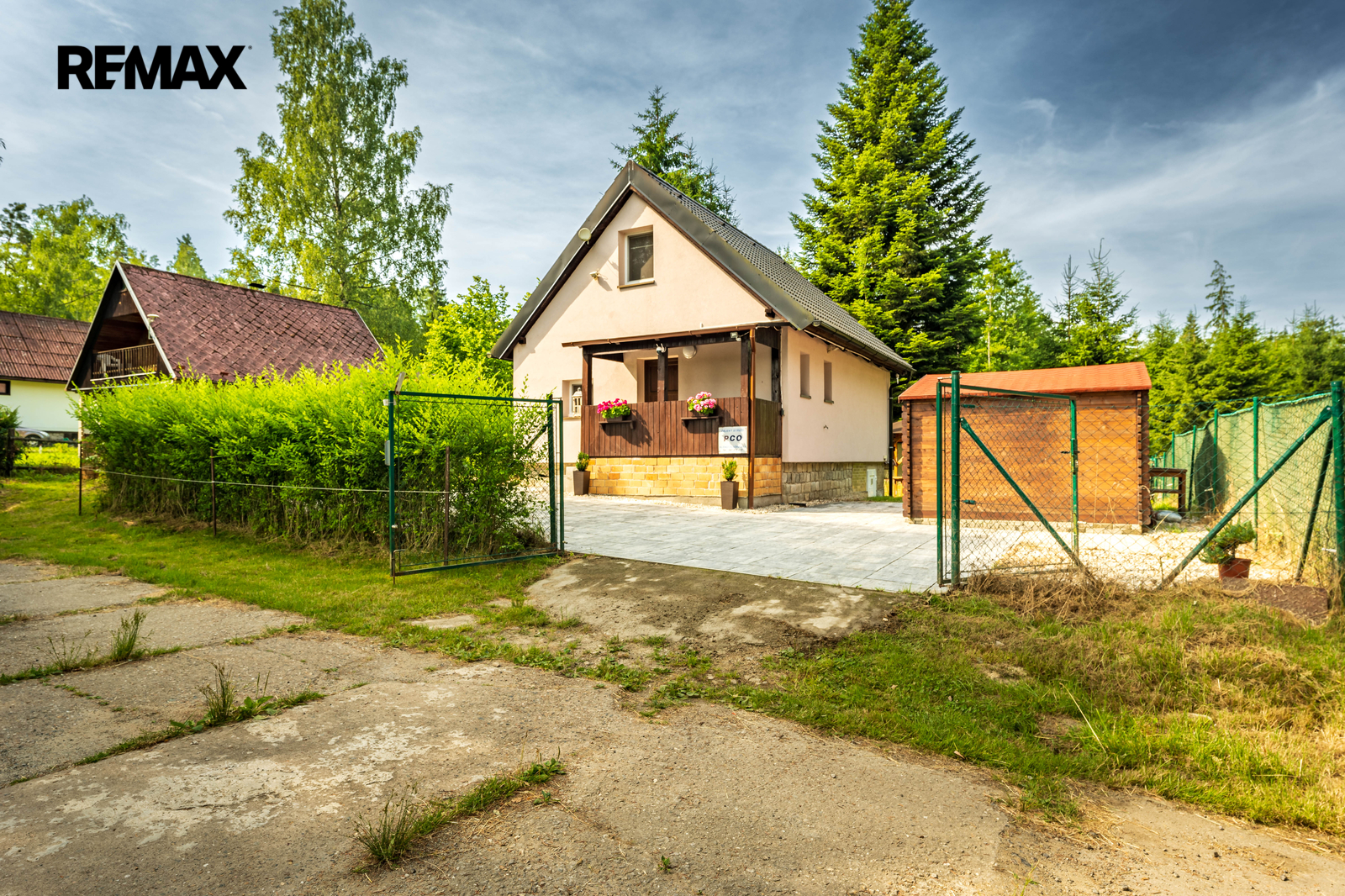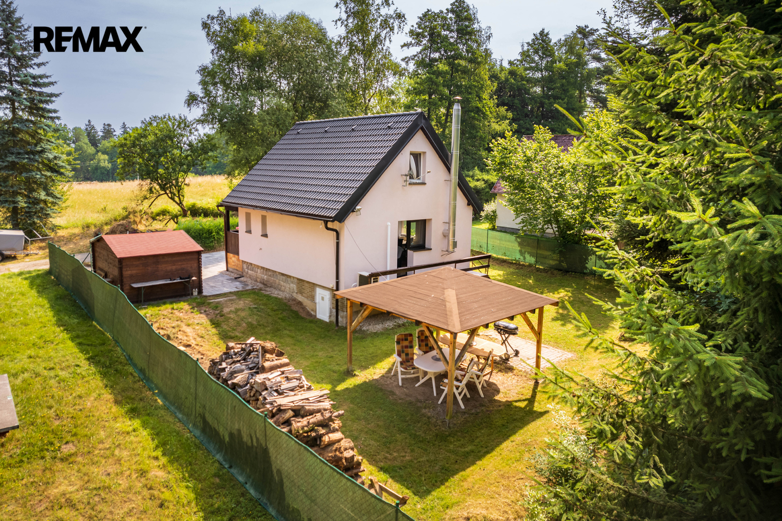 Součástí nemovitosti je pergola, dřevěný přístřešek na uskladnění např. zahradního nábytku a vydlážděné parkovací stání. Příjezd je po obecní komunikaci.