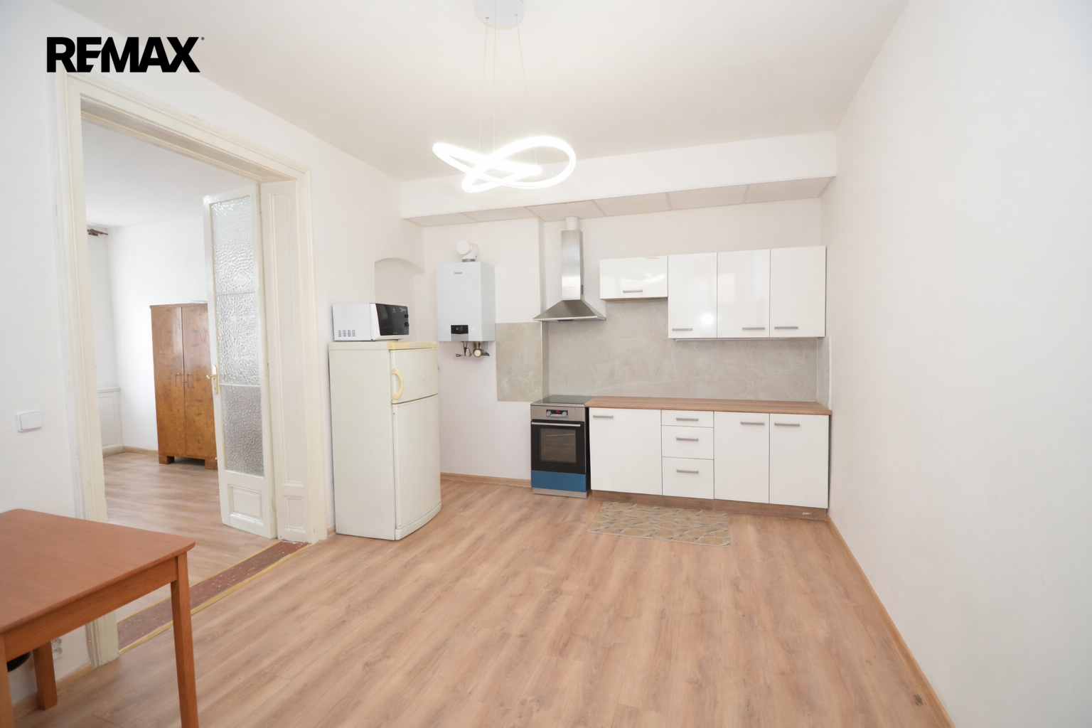 Nabízený byt se skládá ze vstupní předsíňky, pokoje s kuchyňským koutem, který je dál průchozí do dalšího pokoje. Z předsíně je přístupná koupelna s WC. Kuchyně je vybavena kuchyňskou linkou s vestavěnou troubou, indukční varnou deskou a digestoří.