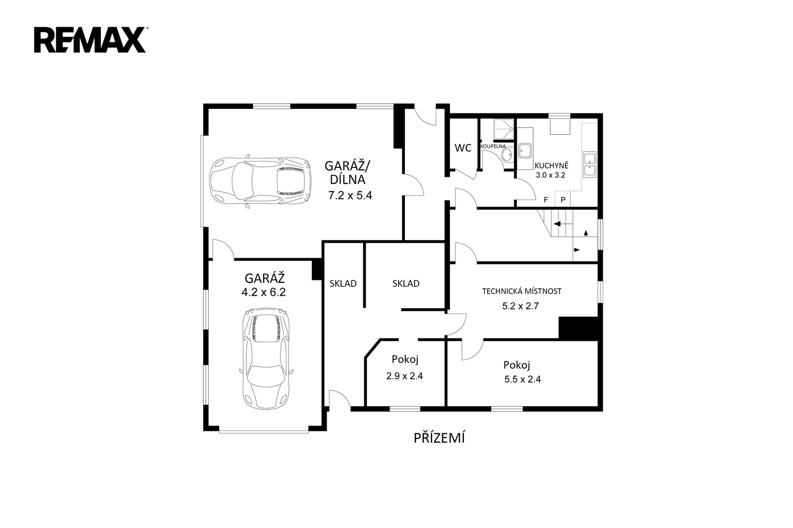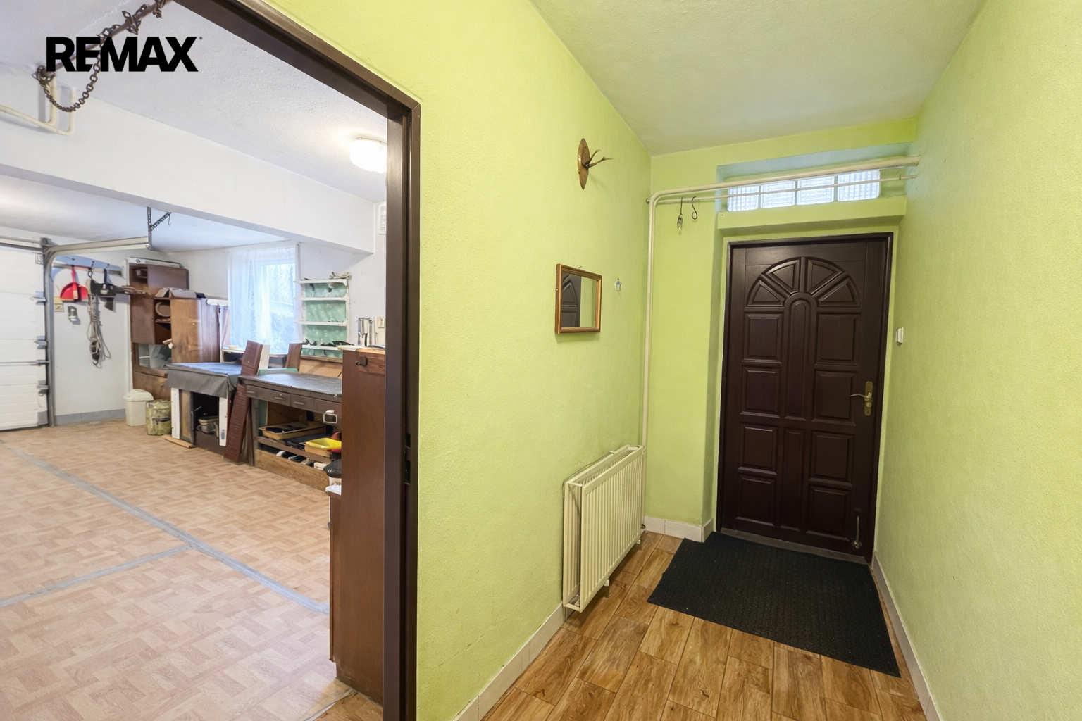 Přijedete domů, otevřete vrata jedné ze dvou garáží (31,4 m² a 20 m²) a suchou nohou vstoupíte rovnou do přízemí domu. A hned vám dojde, že tohle je dům, který stojí na pevných základech. Přízemí působí velmi prakticky a nabízí skvělé zázemí třeba pro podnikání – dva samostatné pokoje se přímo nabízí jako kanceláře, kde můžete pracovat bez rušení od zbytku domu. Dále zde najdete předsíň se vstupem na zahradu, technickou místnost a dřevník. Kuchyně je v původním, starším stavu a dává prostor k úpravě podle vlastních představ. Koupelna se sprchovým koutem a samostatné WC jsou oddělené tak, aby nenarušovaly chod této části.