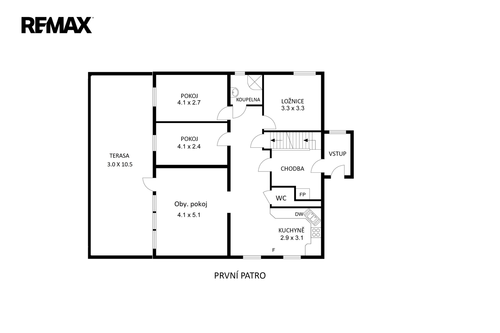 Po schodech vystoupáte do 1. nadzemního podlaží (75 m²), které má vlastní vstup. A právě tady začnete ten dům vnímat úplně jinak. Z obývacího pokoje se vychází přímo na terasu o velikosti 40 m² – místo pro klidná rána i dlouhé večery. Kuchyně přirozeně navazuje na předsíň a hned vedle ní je prostor pro jídelní stůl, takže všechno funguje přirozeně – vaření, stolování i setkávání na jednom místě. Tři pokoje – dva dětské a ložnice s balkonem – dávají každému dostatek prostoru i soukromí. Koupelna se sprchovým koutem a WC jsou řešeny samostatně.