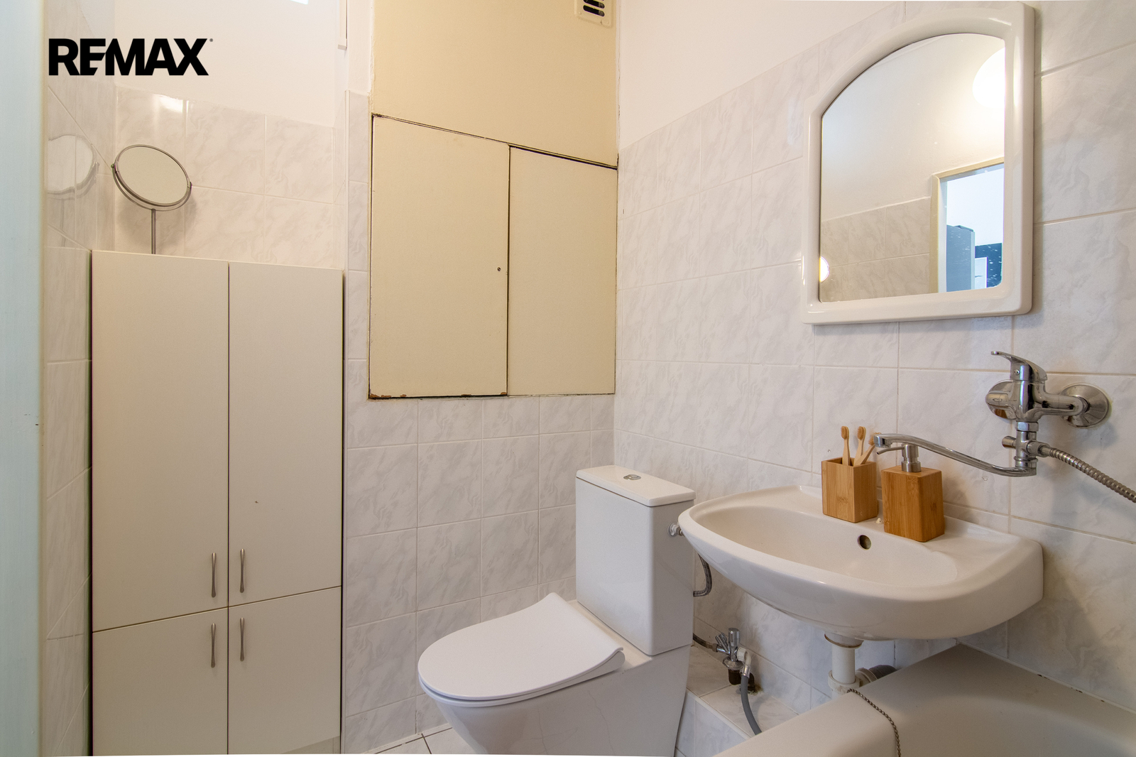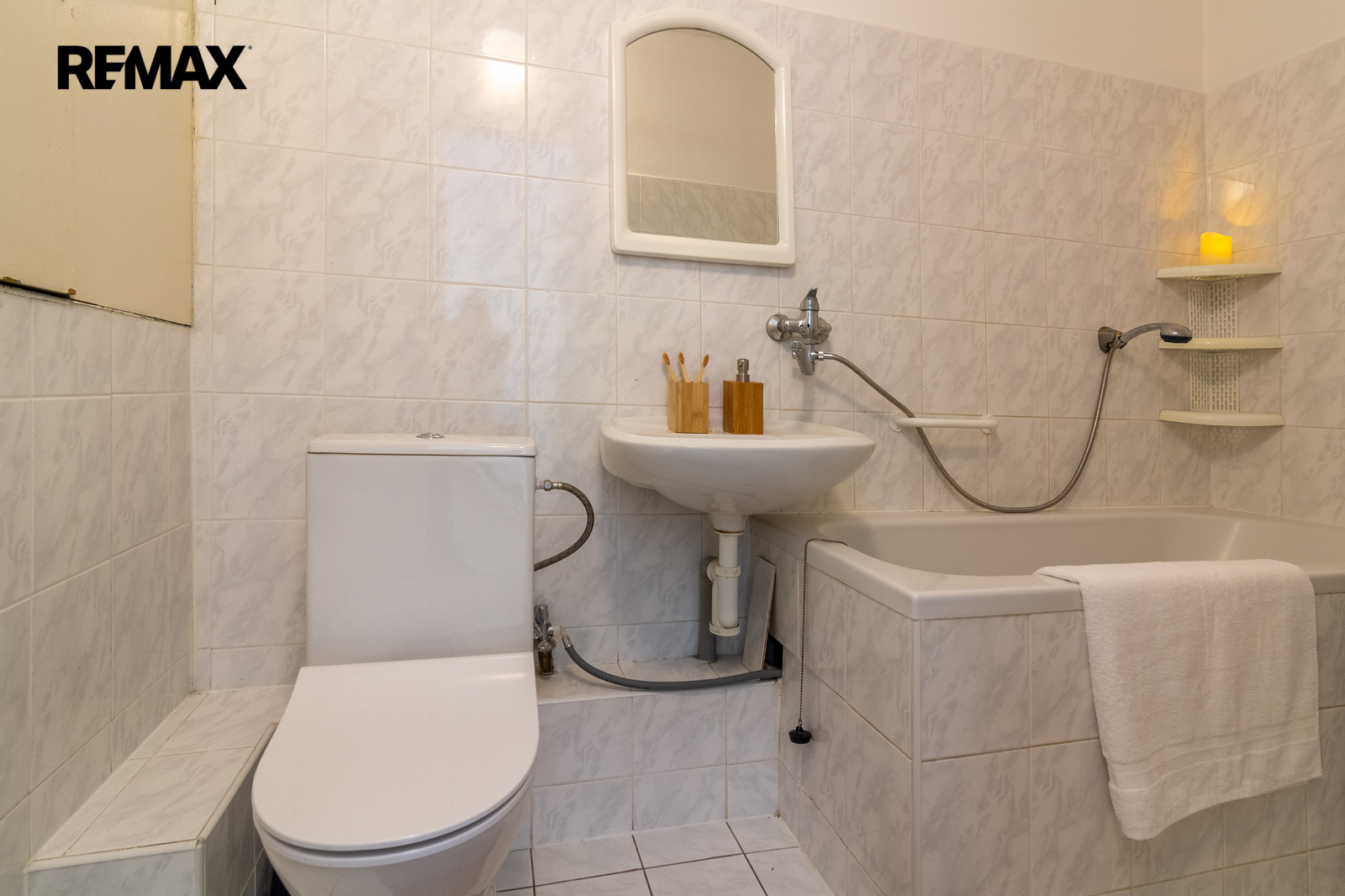 Toaleta je součástí koupelny. Její velkou výhodou je zděné jádro. V obývacím pokoji jsou parkety - lakované před 3 lety, v chodbě a kuchyni PVC, v koupelně dlažba.