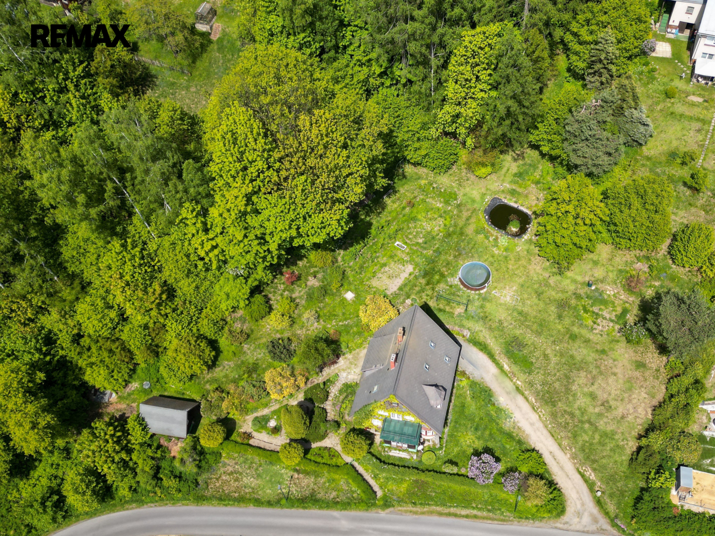 Dominantou nemovitosti je rozlehlý, udržovaný pozemek, který poskytuje naprosté soukromí. Najdete zde zahradní domek, bazén, stylové posezení u ohně i okrasné jezírko, které společně vytvářejí harmonické prostředí pro odpočinek i společenské chvíle. Vzrostlá zeleň a stromy podtrhují jedinečný charakter celého místa.