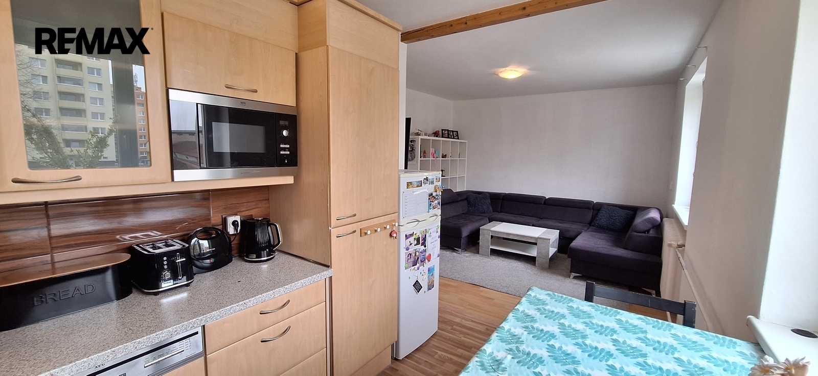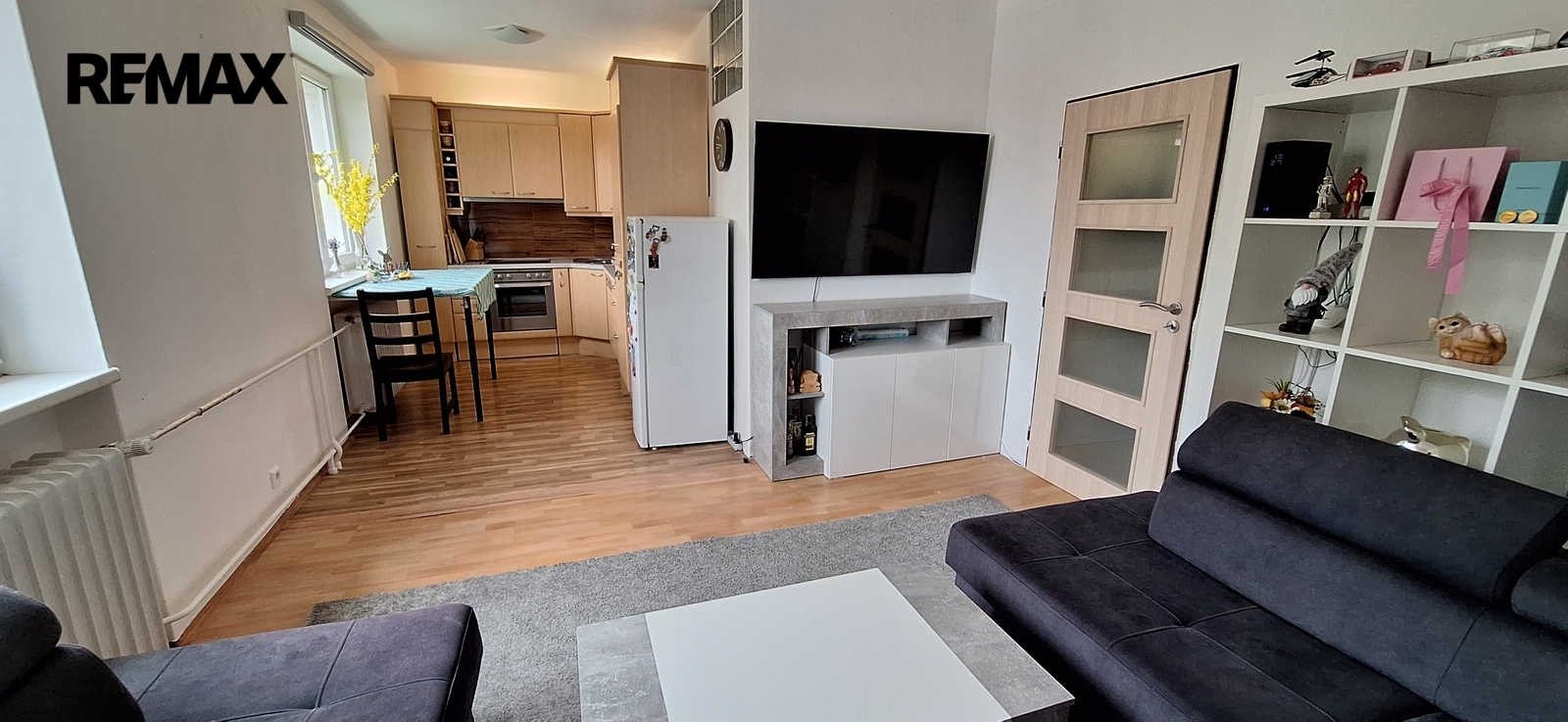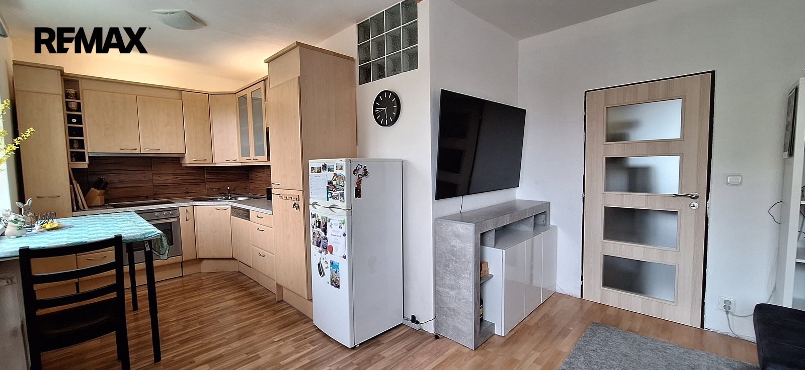Součástí obývacího pokoje je kuchyňská linka s vestavěnými spotřebiči (trouba, myčka nádobí, sklokeramická varná deska, digestoř). Lednice je samostatná.