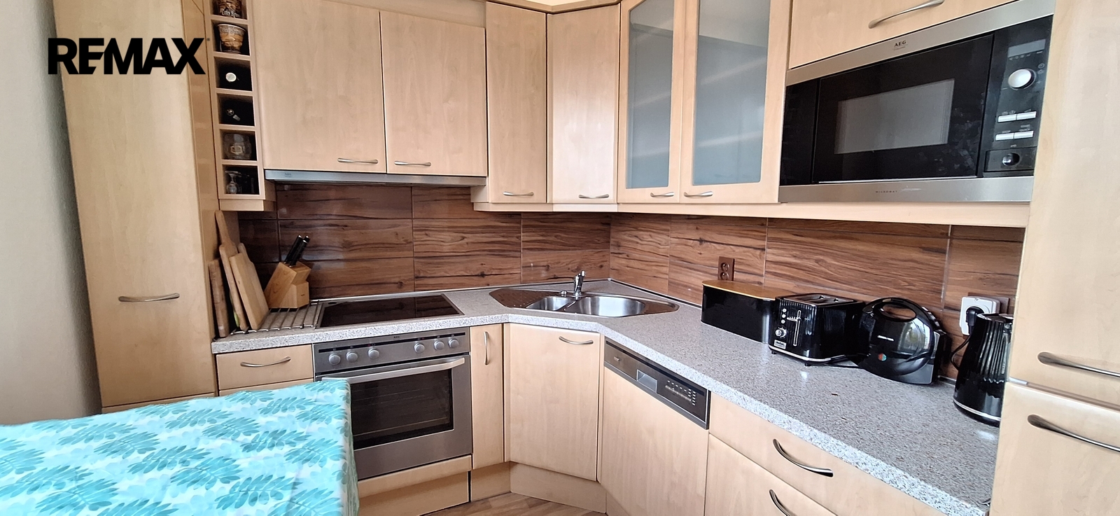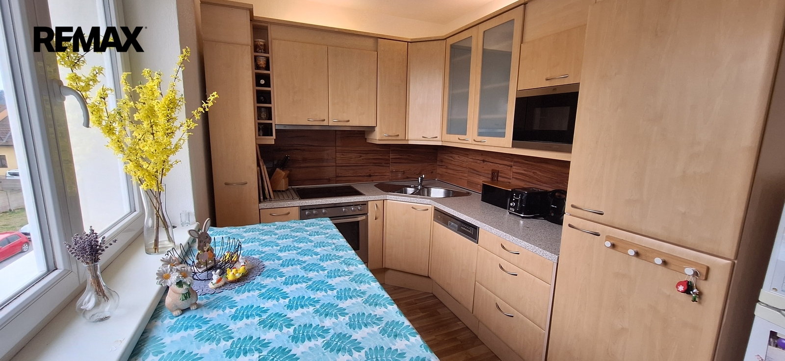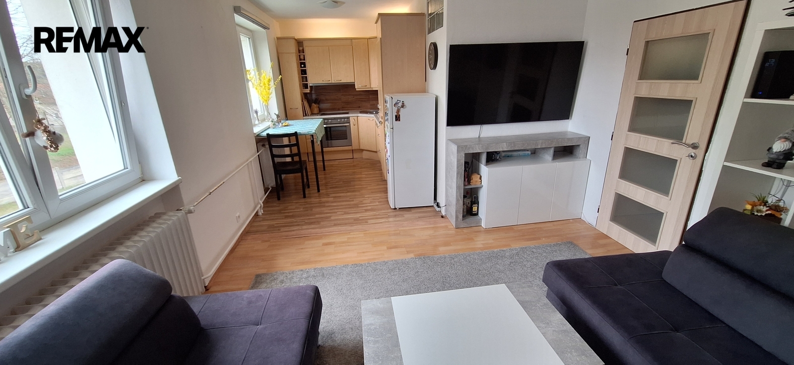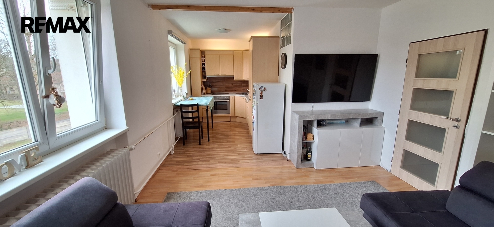 Součástí obývacího pokoje je kuchyňská linka s vestavěnými spotřebiči (trouba, myčka nádobí, sklokeramická varná deska, digestoř). Lednice je samostatná.