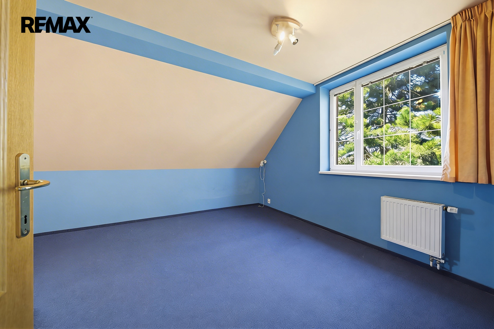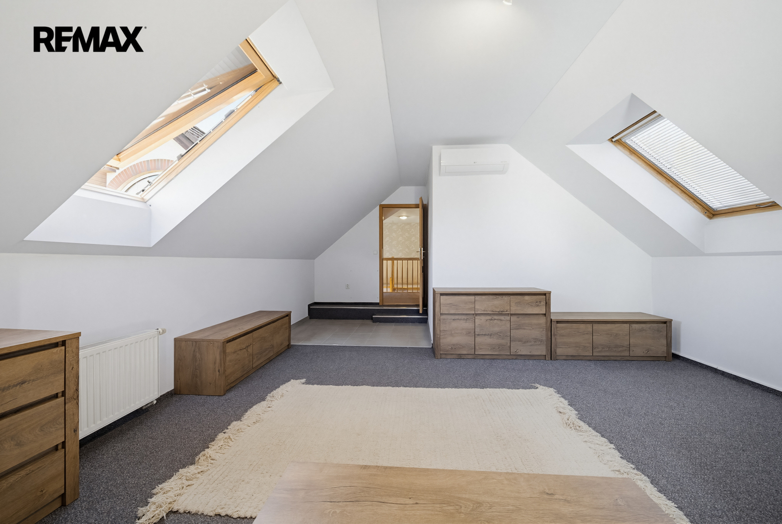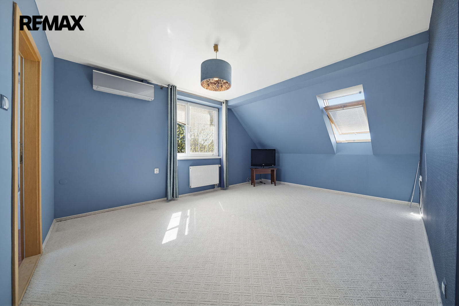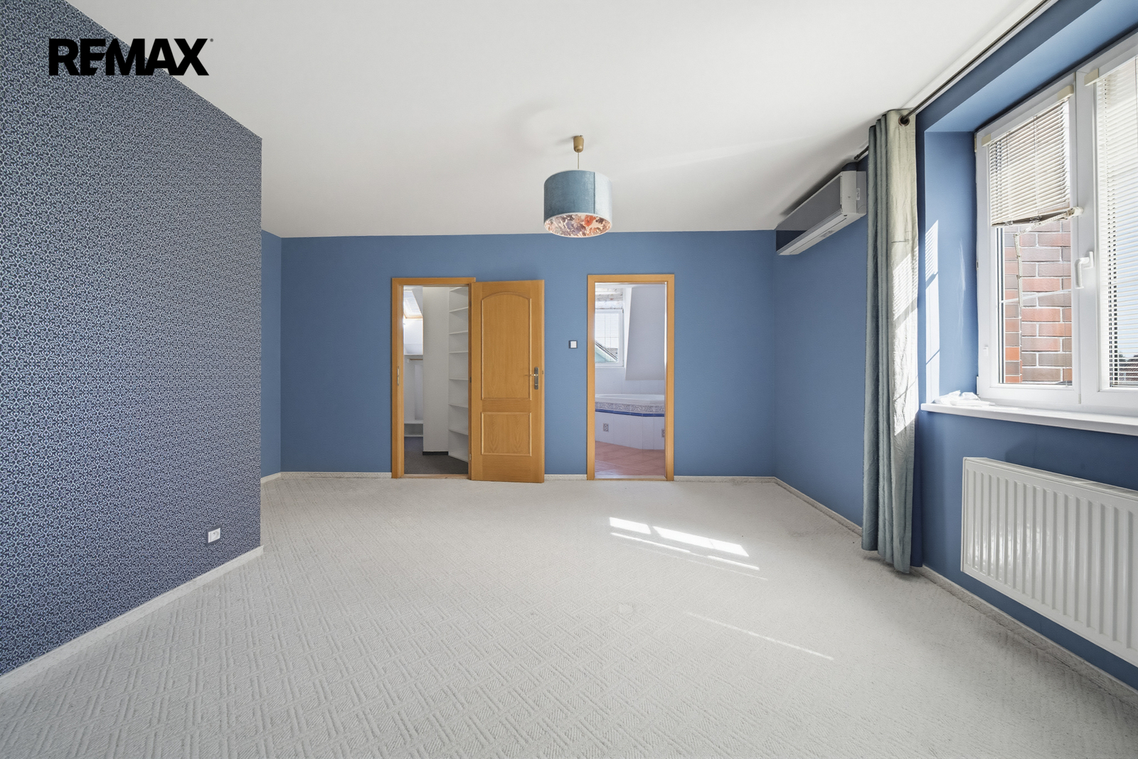 V patře se nachází hlavní ložnice (18,5 m²) s vlastní šatnou a koupelnou (12,8 m²), dva prostorné pokoje (24,4 m² a 25,3 m²), druhá koupelna a samostatná prádelna (cca 10 m²). Komfort zvyšují dvě klimatizační jednotky.