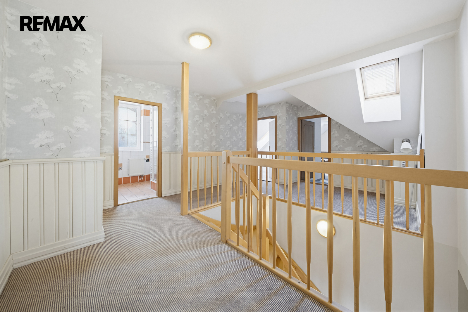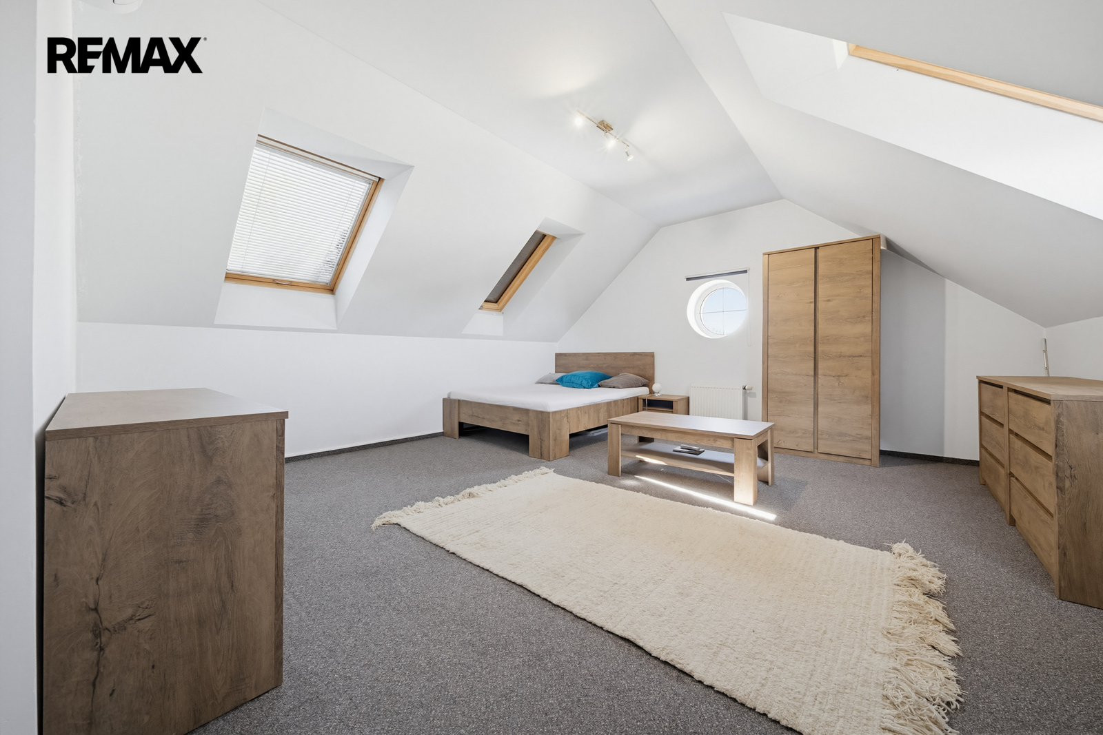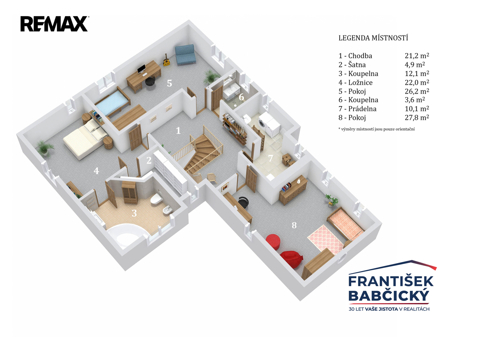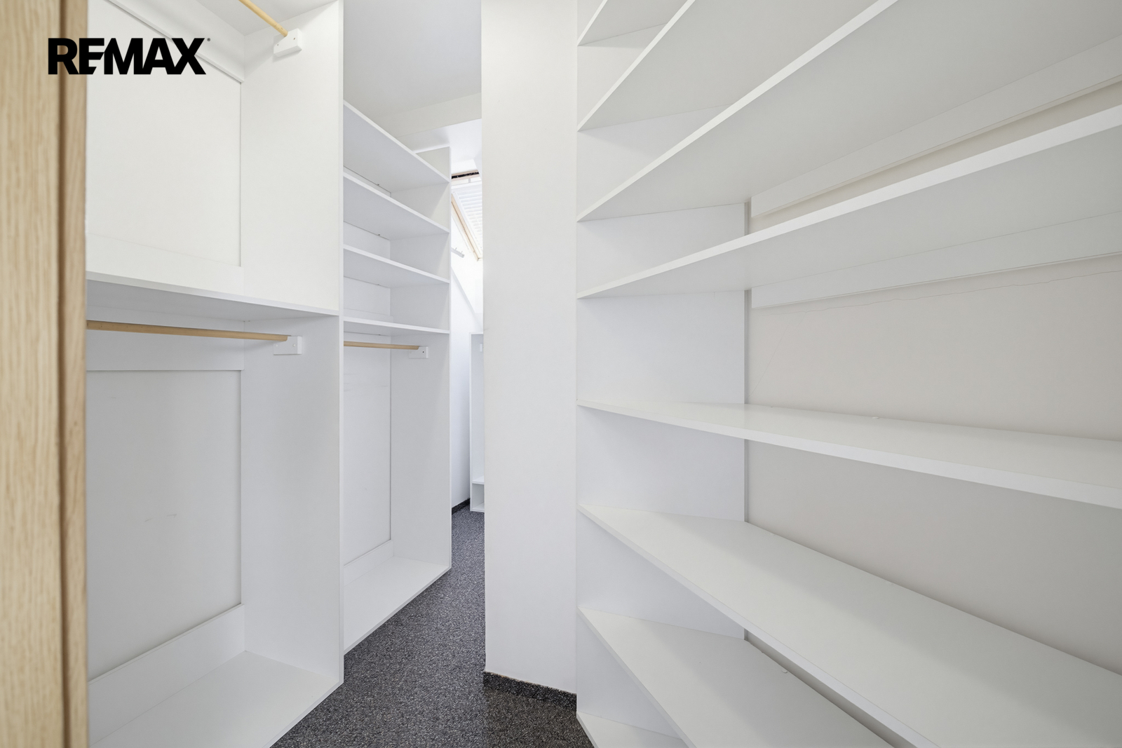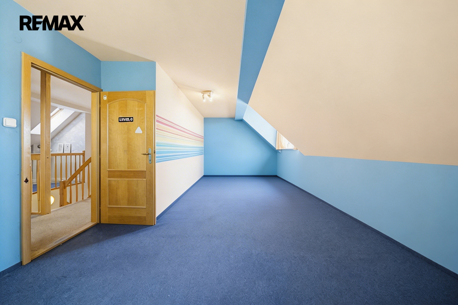 V patře se nachází hlavní ložnice (18,5 m²) s vlastní šatnou a koupelnou (12,8 m²), dva prostorné pokoje (24,4 m² a 25,3 m²), druhá koupelna a samostatná prádelna (cca 10 m²). Komfort zvyšují dvě klimatizační jednotky.