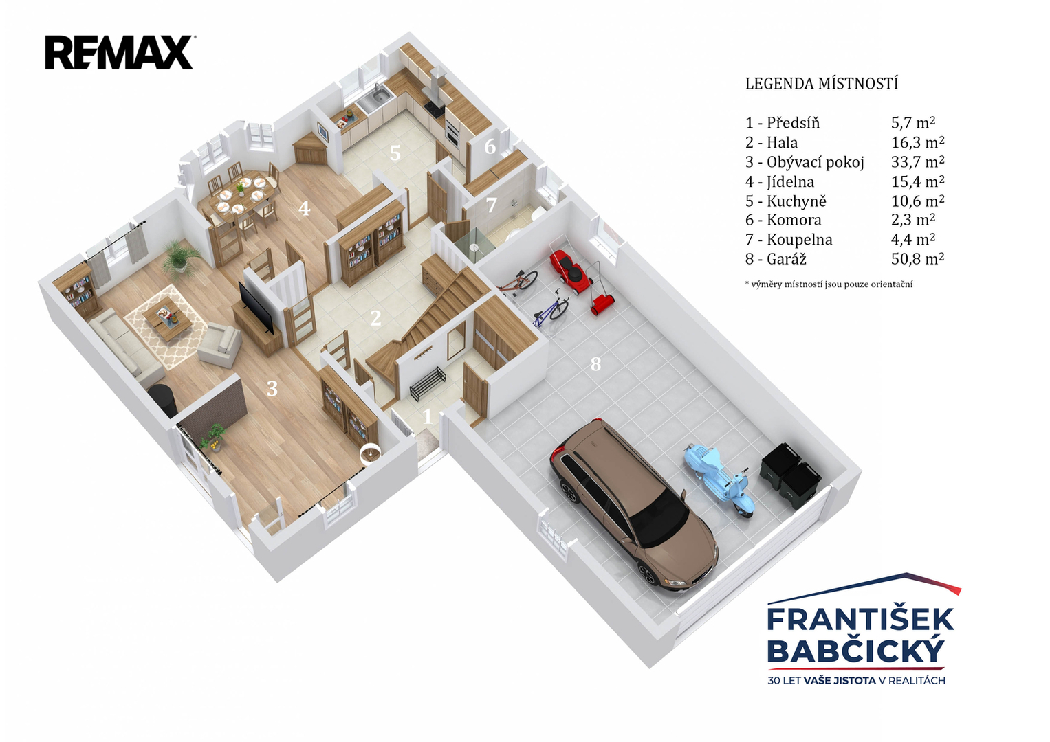 Dominantou přízemí je světlý obývací pokoj (32,9 m²) s krbovými kamny a přímým vstupem na zastřešenou terasu s pergolou a zahradu. Dále zde najdete jídelnu (14,9 m²), samostatnou kuchyni (10,1 m²) s praktickou komorou a koupelnu s toaletou.