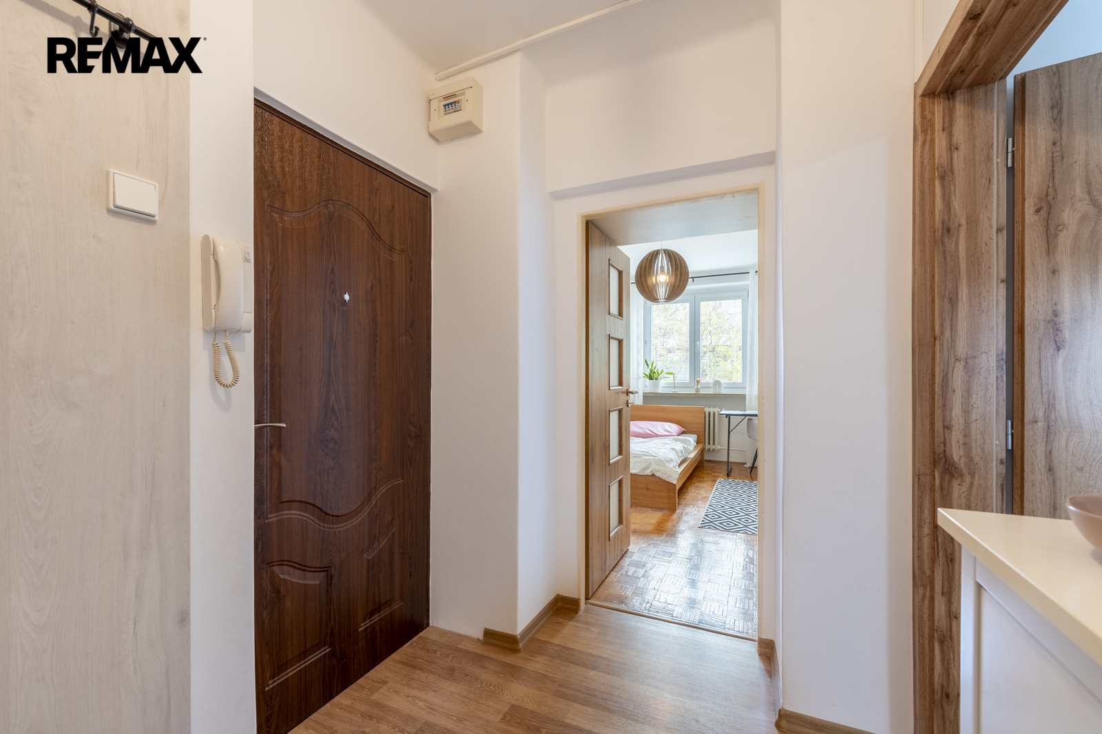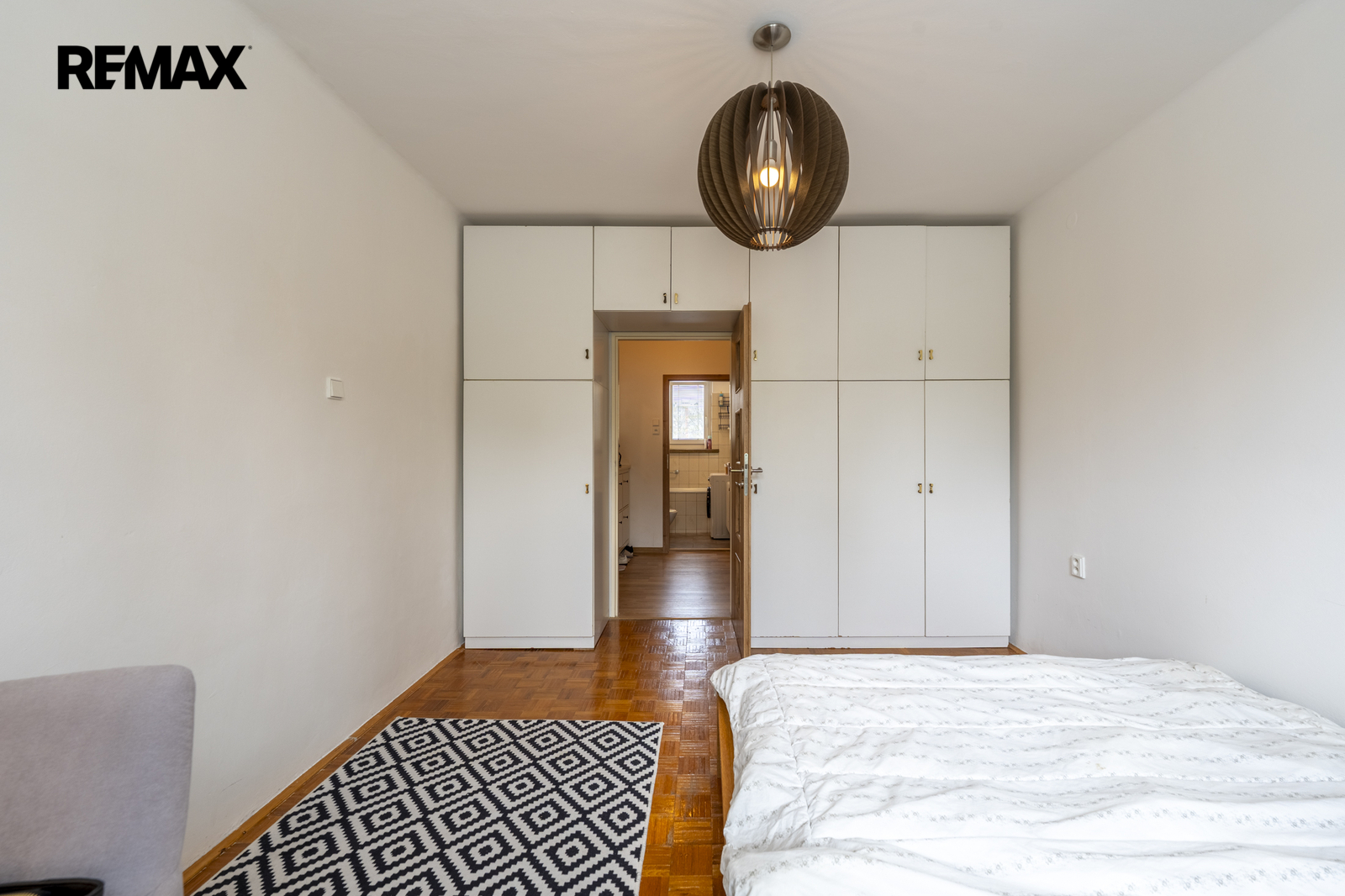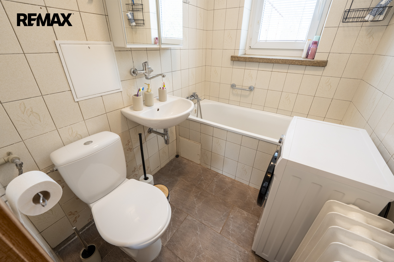 Po vstupu do bytu vás přivítá chodba s dostatkem úložného prostoru. Po pravé straně se nachází koupelna vybavená vanou, toaletou, umyvadlem a pračkou. Naproti koupelně je prostorná a světlá ložnice s dostatkem místa pro úložné řešení.