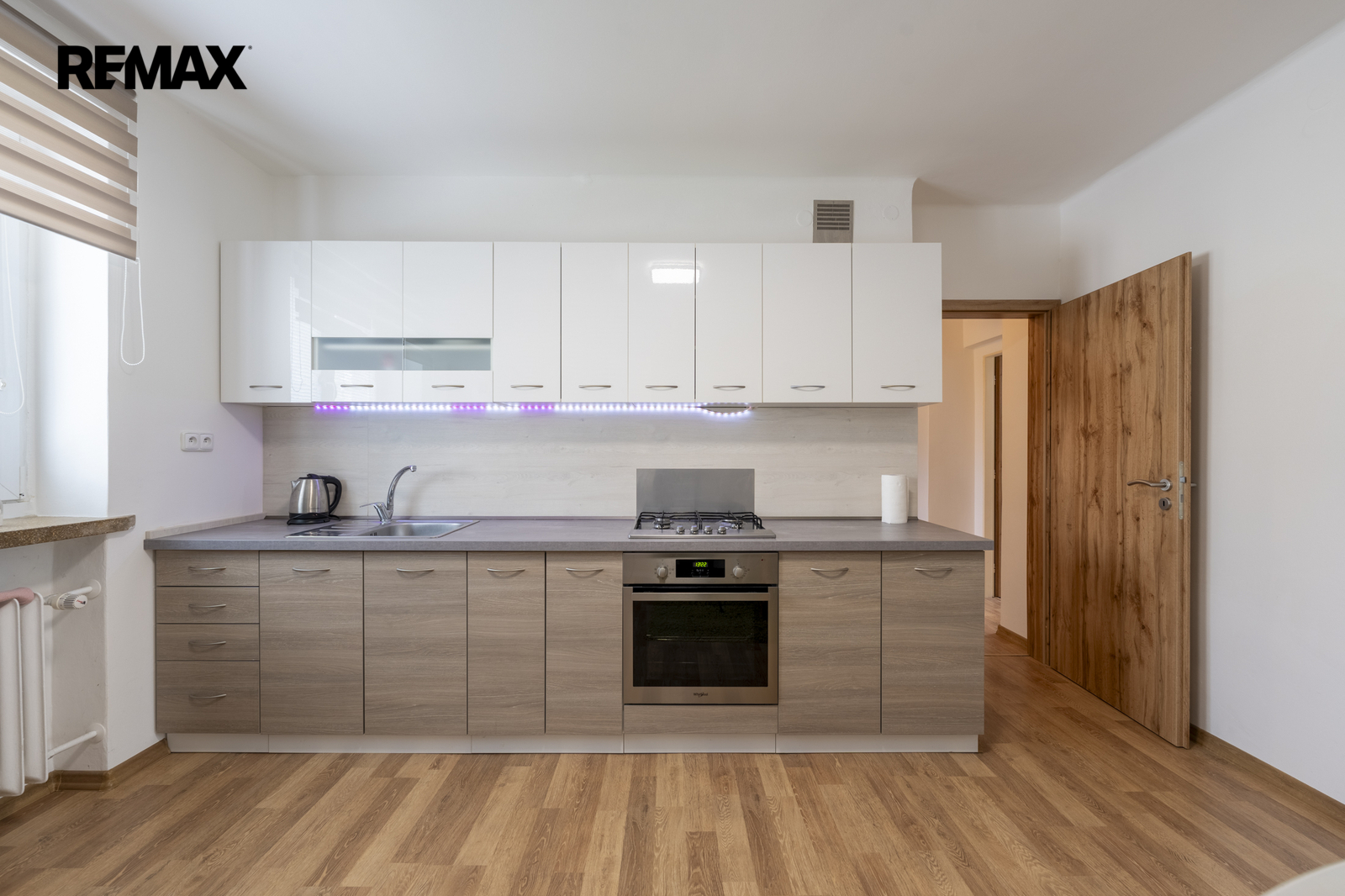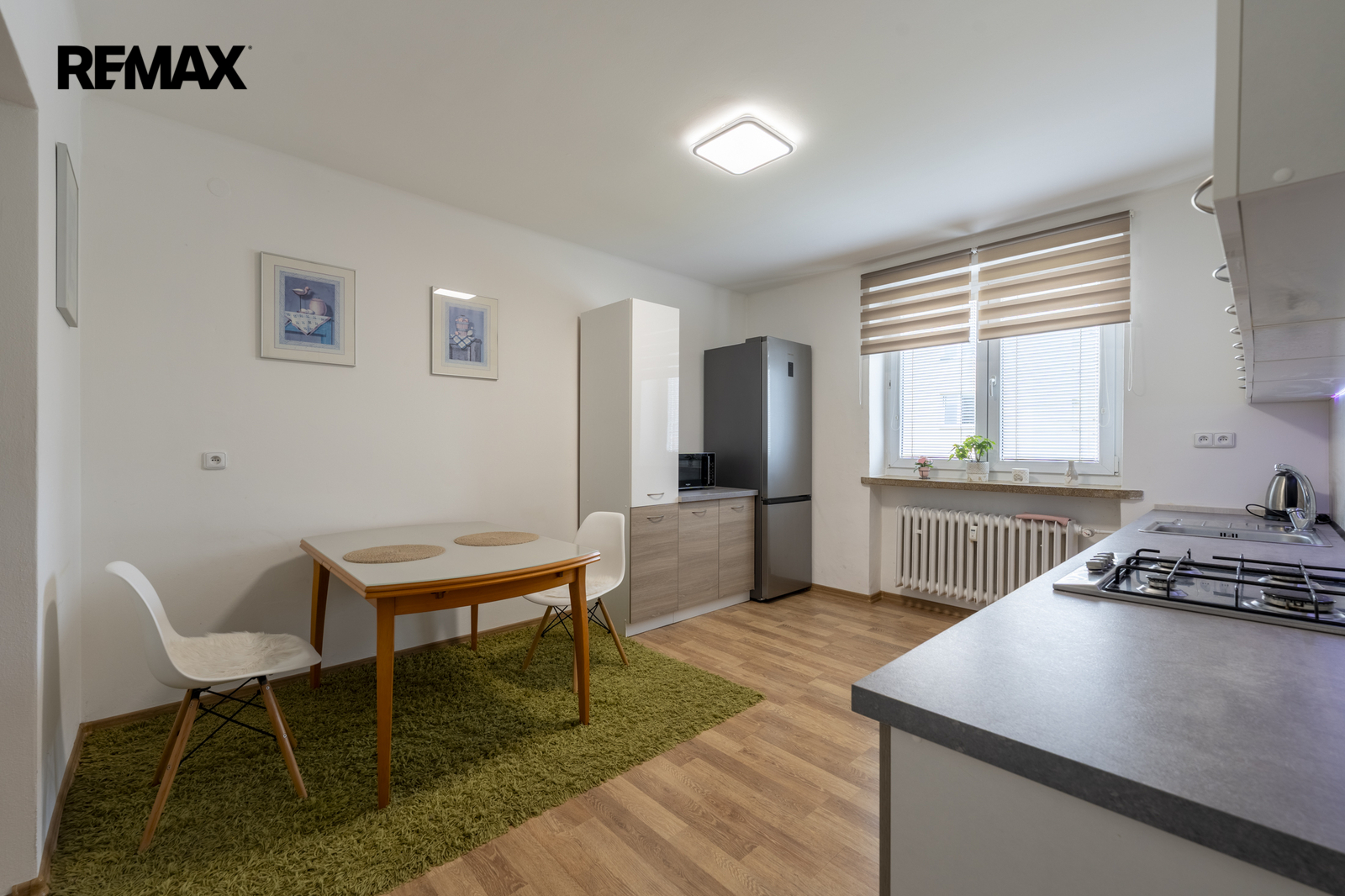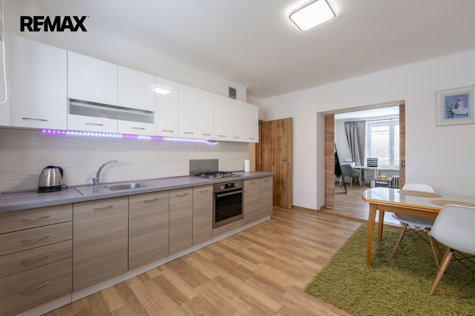 Ze vstupní chodby dále vstupujete do krásné, nově zrekonstruované kuchyně, která nabízí dostatek úložného prostoru, jídelní stůl a je vybavena lednicí s mrazákem. Na kuchyni navazuje obývací pokoj, který může sloužit jako komfortní obytný prostor nebo případně i další ložnice dle vašich potřeb.