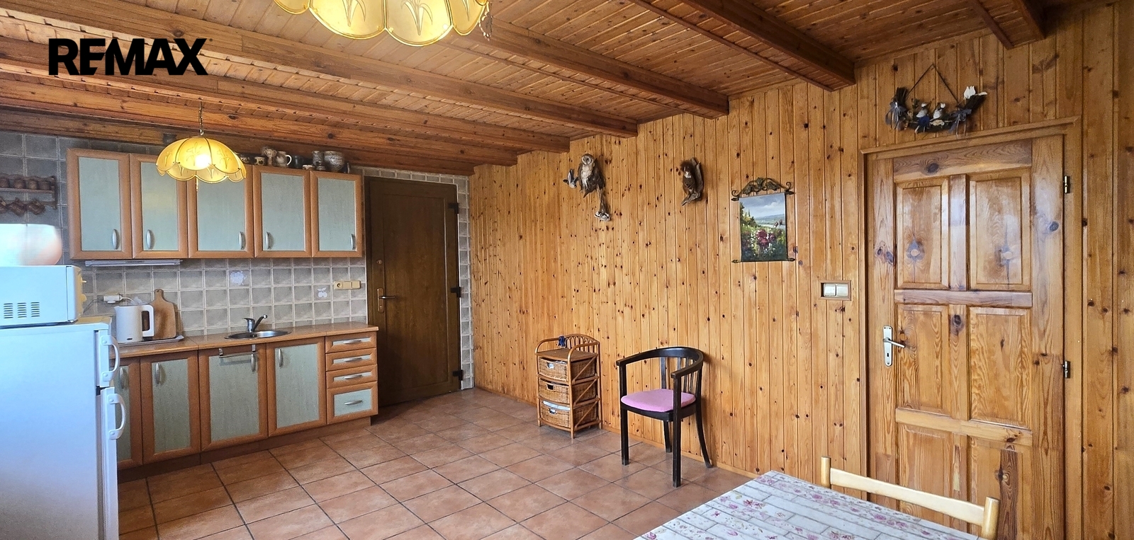 Dřevěné obložení působí velmi příjemně, útulně a navozuje pocit tepla. Chalupa je napojena na elektřinu (230 a 400V). Voda je z vlastní vrtané studny (cca 64 m), ohřev vody zajišťuje bojler. Chalupa je vytápěna krbovými kamny, odkanalizování do zkolaudovaného septiku. Okna jsou plastová, na podlahách je dlažba (kuchyně, chodba, koupelna) a nalakované dřevotřískové desky. Schodiště do patra je dřevěné.