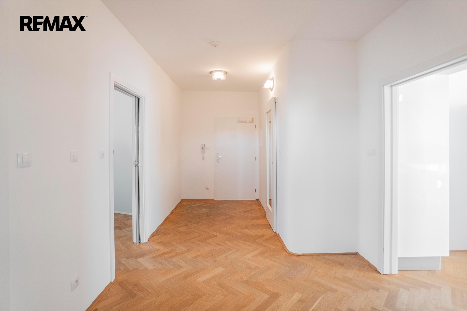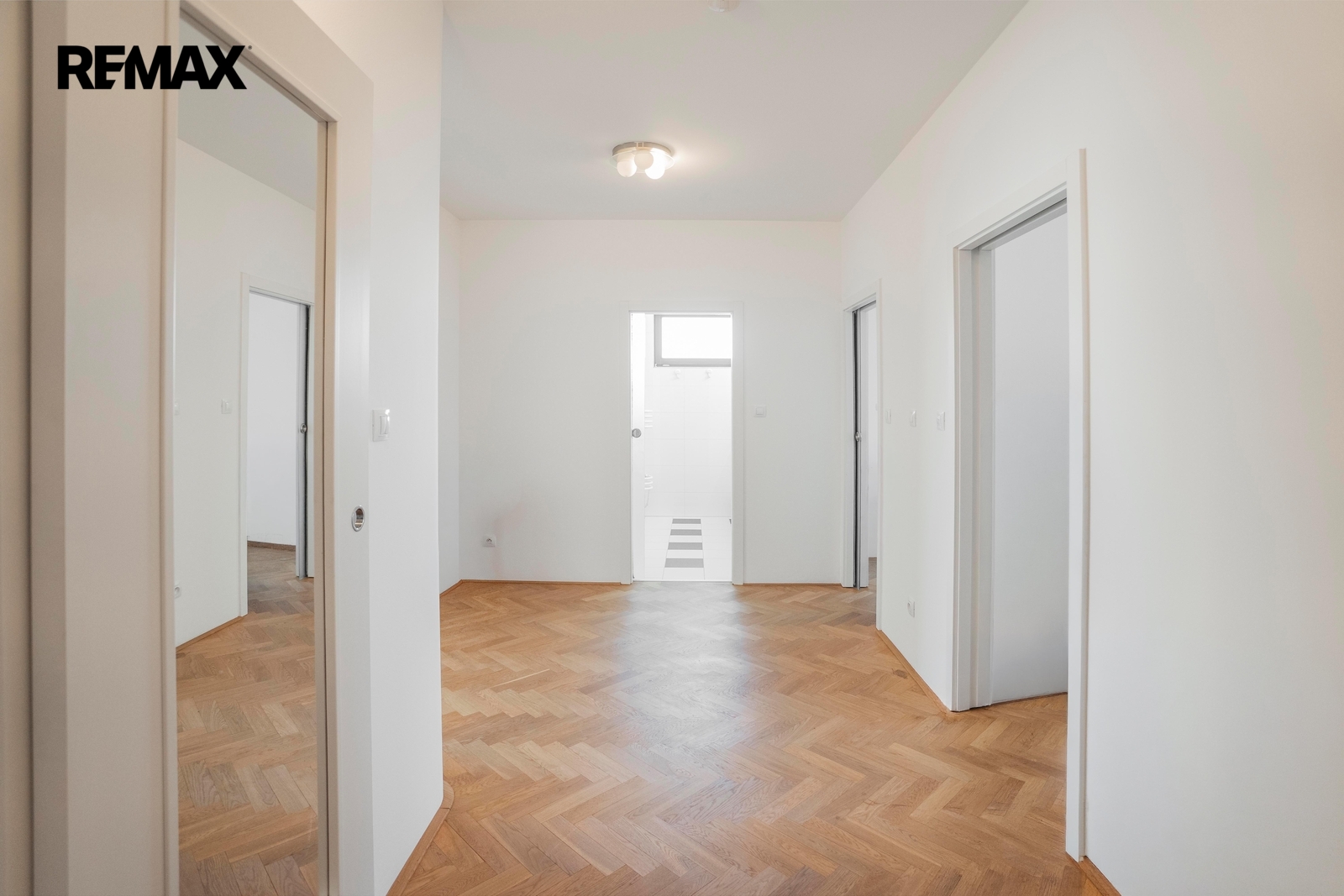Byt se nachází ve 3. patře domu s výtahem a působí velmi příjemným, vzdušným dojmem. Po vstupu do bytu se nacházíte v prostorné chodbě (11,9 m2). Na jedné straně bytu se nacházejí dva samostatné neprůchozí pokoje o výměrách 13.60 m2 a 13.50 m2, které mohou bez problému sloužit jako ložnice, dětský pokoj nebo pracovna. Nechybí ani šatna o velikosti 3.40 m2, která nabízí vítaný úložný prostor a prakticky může posloužit i pro umístění sušičky na prádlo. Koupelna je spojena s toaletou a její součástí je sprchový kout.