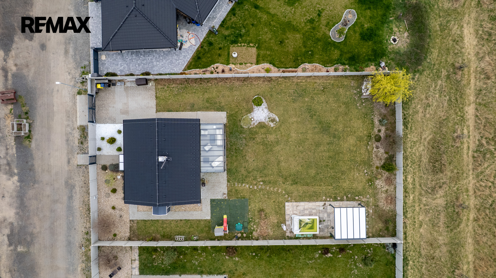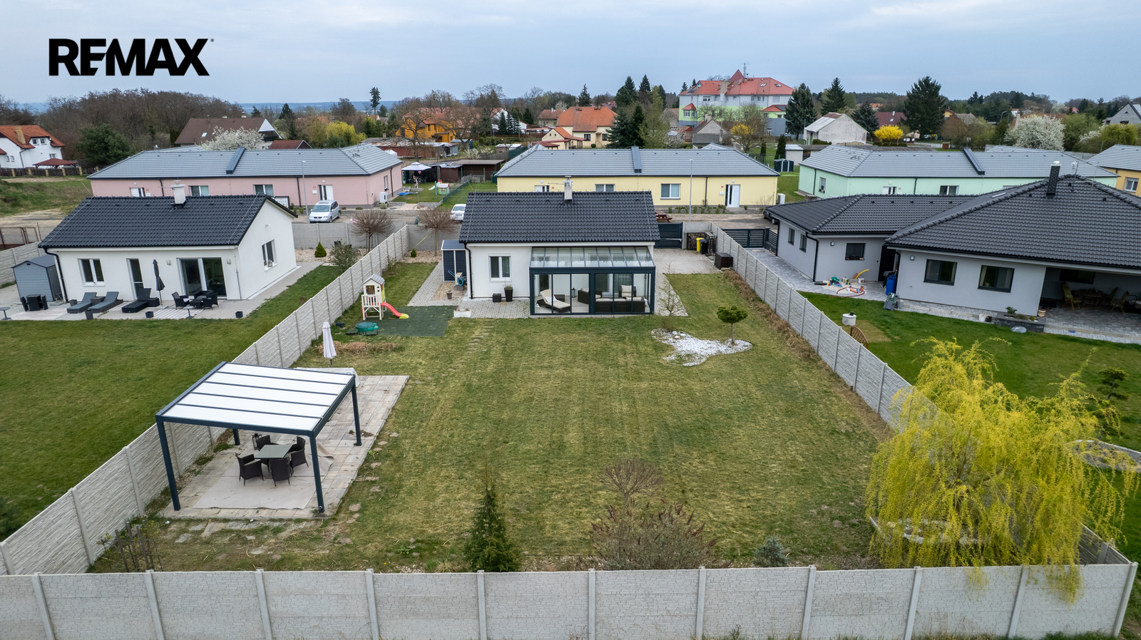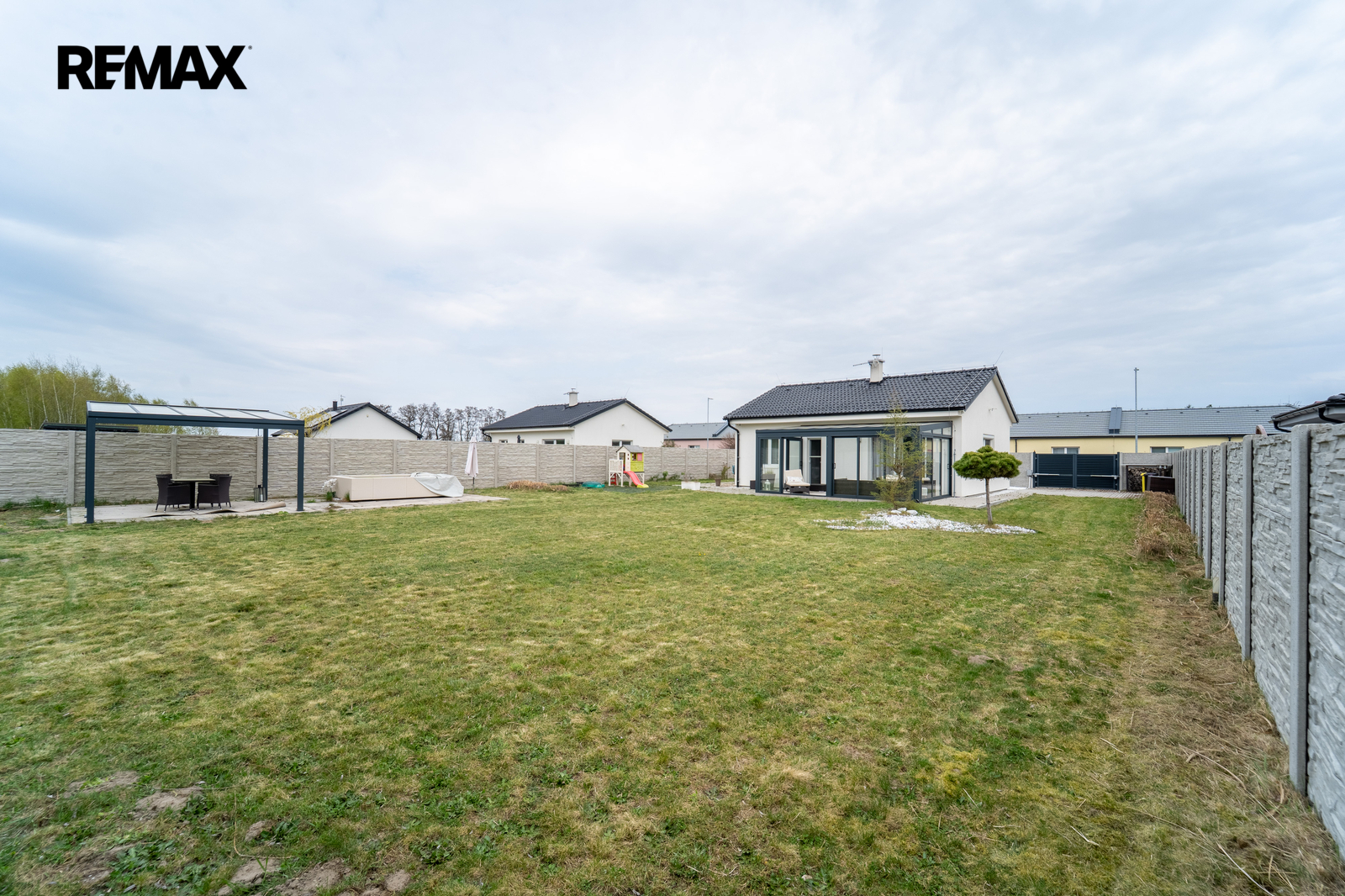 Na zahradě se nachází také stylová pergola ve stejném designu, která nabízí další příjemné místo pro posezení nebo relaxaci.