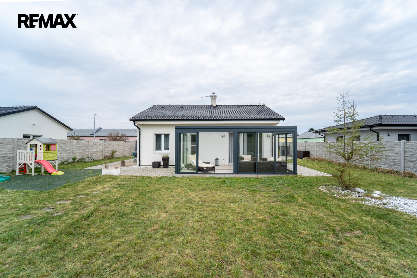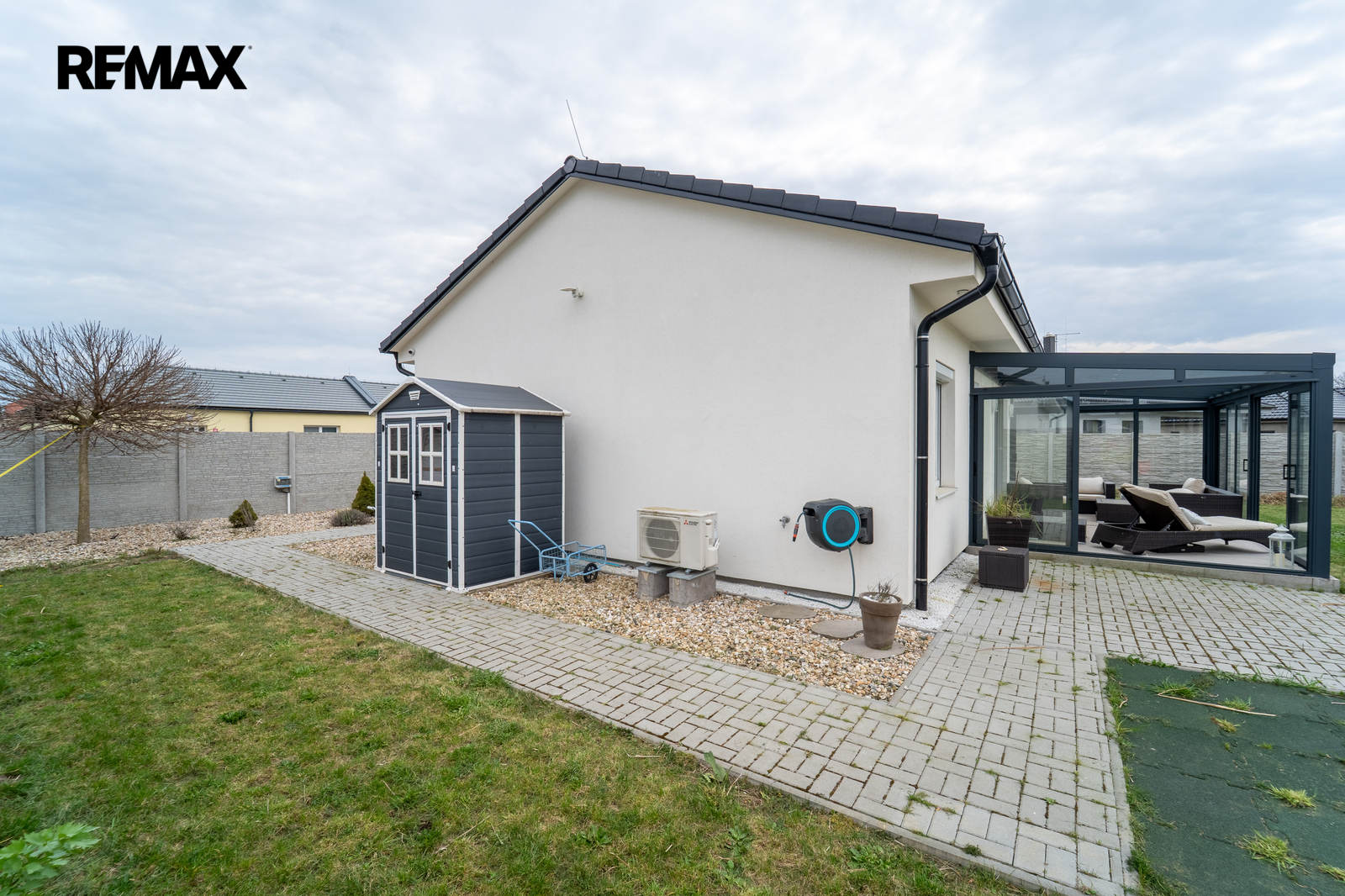 Velkým benefitem je zastřešená terasa řešená jako zimní zahrada s posuvným systémem – prostor lze kompletně uzavřít nebo otevřít a propojit se zahradou. Díky tomu ji můžete využívat po celý rok.
