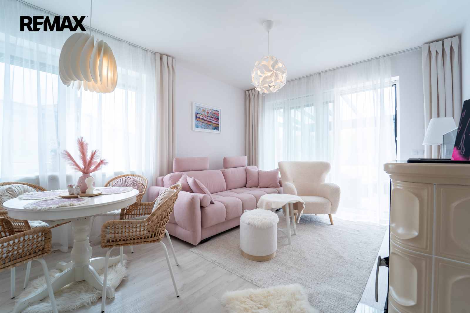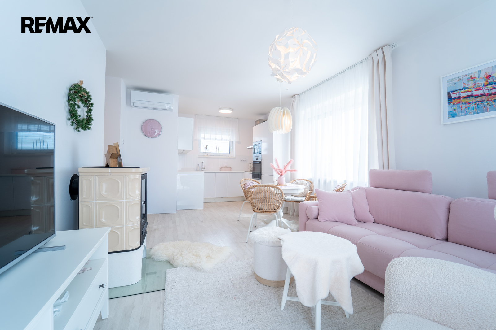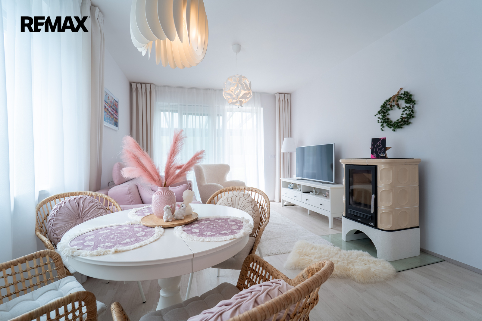 Dominantou domu je světlý obývací pokoj s kuchyňským koutem, kde se nachází krb na tuhá paliva, který dodává interiéru útulnou atmosféru. Z obývací části je přímý vstup do zimní zahrady.