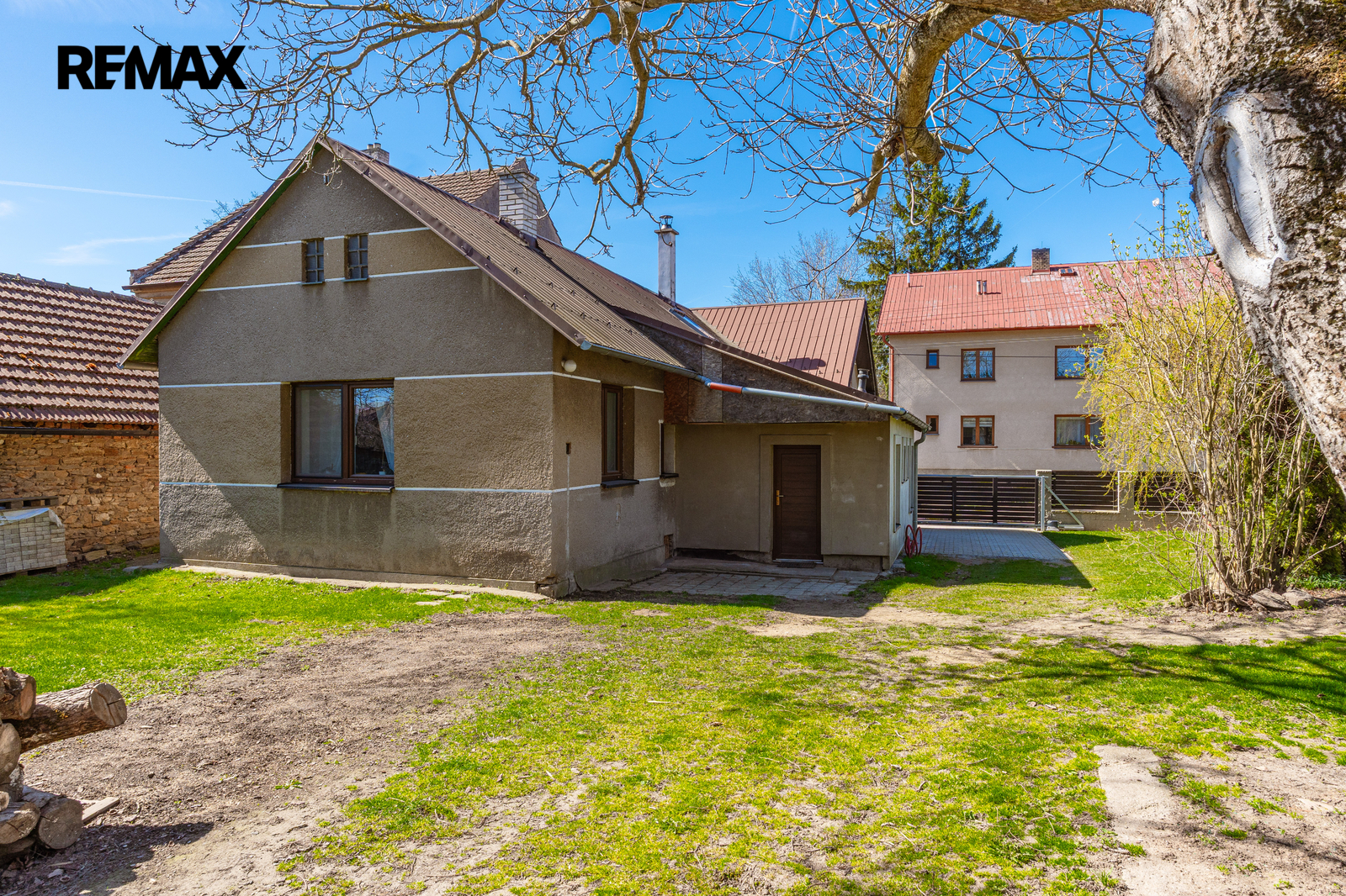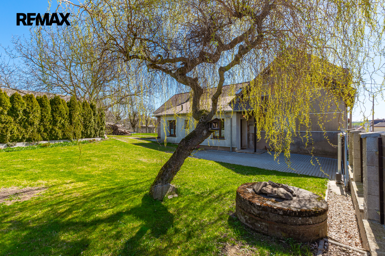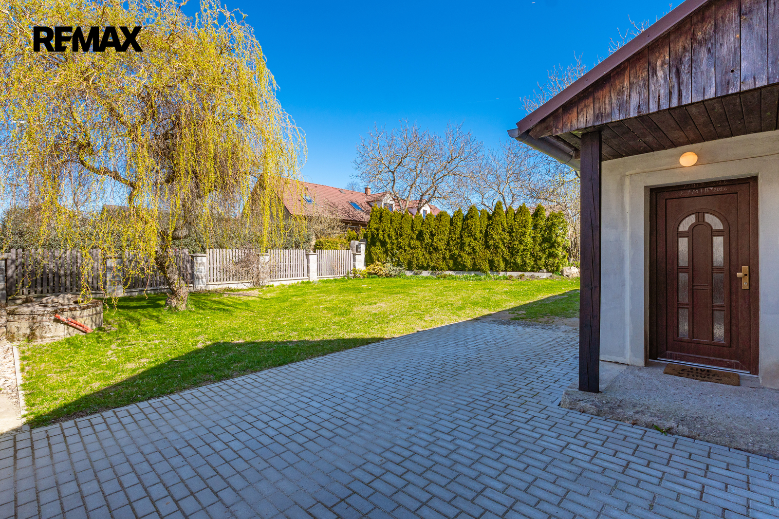 Pokud hledáte bydlení, které v sobě spojuje poctivost starých časů se současným komfortem, pak vás dům na Pražské ulici v Habrech naprosto dostane. Na první pohled vás uvítá klasická břízolitová fasáda z roku 1960, která domu dodává solidní a nenápadný vzhled. Jakmile ale projdete elektrickou vjezdovou bránou z modřínového dřeva a ocitnete se na dlážděném dvoře pod větvemi vzrostlé vrby, pochopíte, že tento dům klame tělem v tom nejlepším slova smyslu.