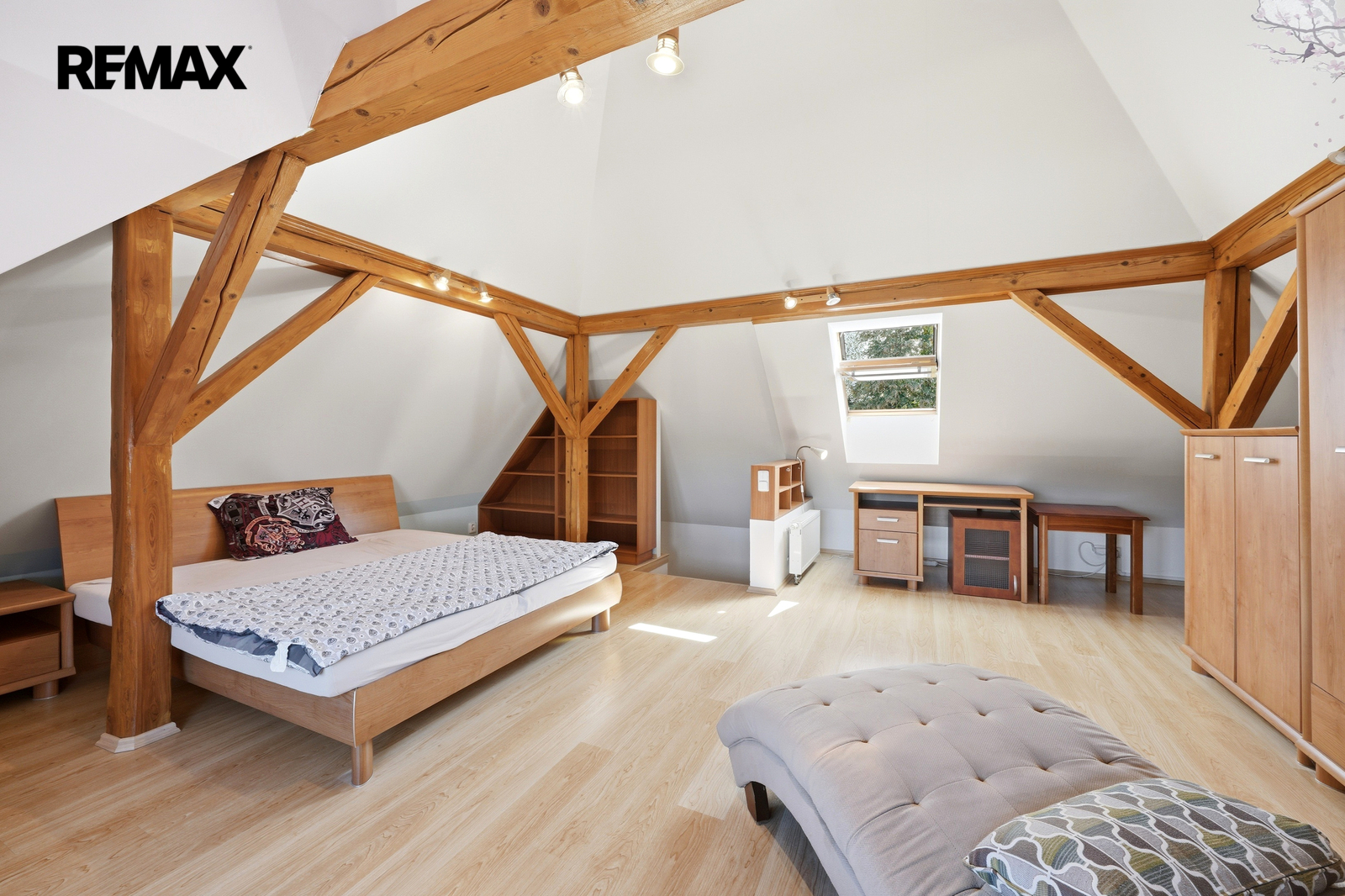 Podkroví – velký obytný prostor/pokoj (33,5 m2), díky zajímavým dřevěným prvkům a šikminám má podkroví příjemnou atmosféru a velký potenciál.
