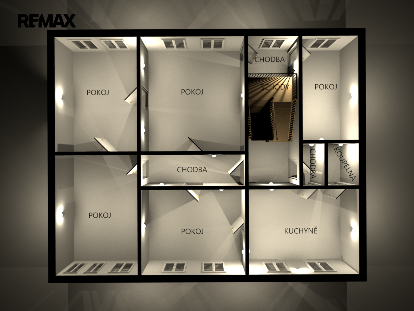 - 2. nadzemní podlaží: Další obytné místnosti v rámci dispozice 9+kk.